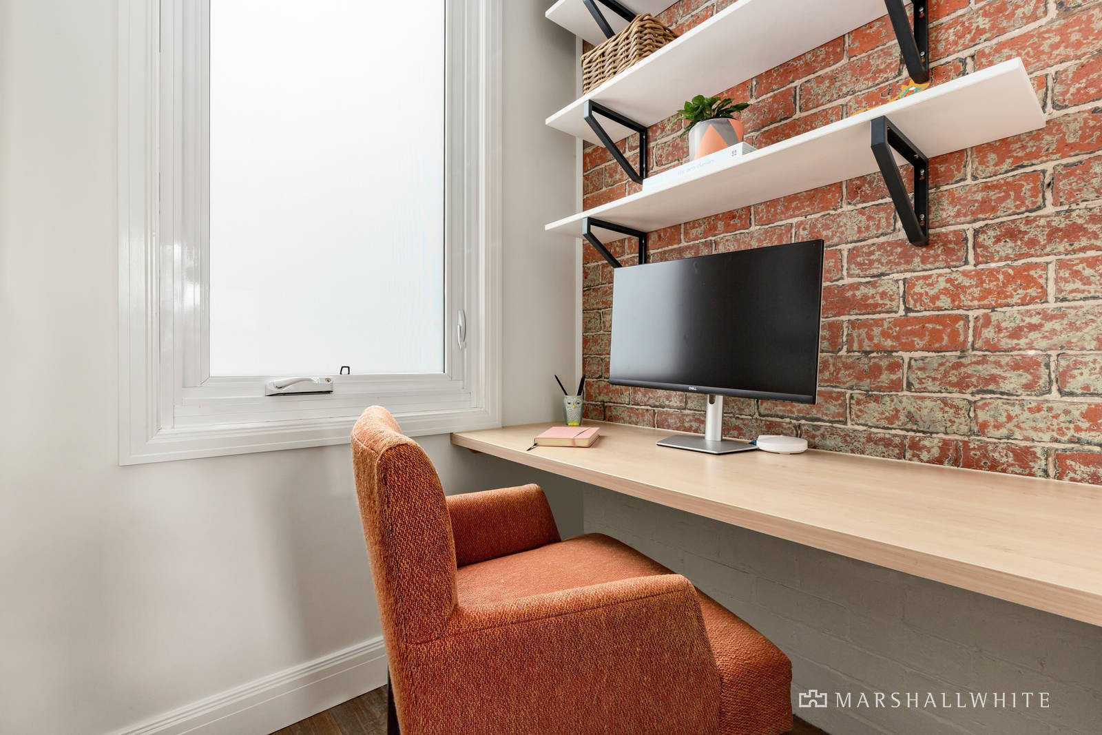 A gas-log fire place flanked by marble-topped window seats anchors the generous open-plan space. The Ceasarstone kitchen with marble splashbacks, a central island bench with double-sink and Miele dishwasher features a gas/electric freestanding 900mm Glem stainless steel cooker. A large walk-in pantry/appliance cupboard also houses the fridge while the adjacent study space with built-in desk is well-placed in a separate alcove lined with original brickwork. Glass sliding doors open to the merbau decking which wraps around the rear section of the home, and incorporates tiered seating, alfresco dining area with gas-plumbed BBQ, and an auto-operated awning.