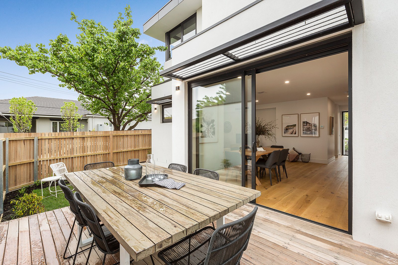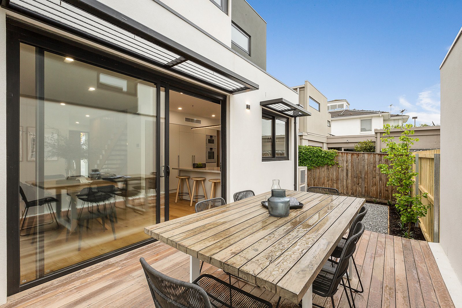 Behind a distinctive timber door, wide oak floors and high ceilings are featured in the entrance hall and generous open plan living and dining room with a premium Gaggenau kitchen boasting stone benches, integrated fridge/freezer and butler's pantry. Glass sliders open the living to a private north-facing garden and large entertaining deck. A downstairs bedroom or home office with robes and a stylish bathroom complement the lavish main bedroom with walk in robe and designer en suite, two additional bedrooms with robes and desks, a retreat and deluxe bathroom, all upstairs.