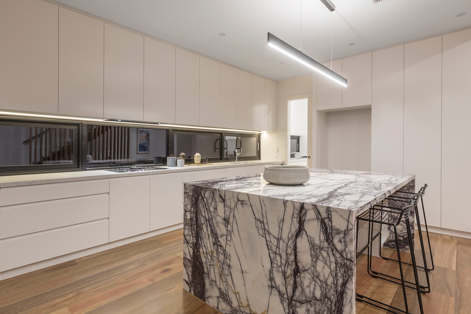 This open area incorporates a gourmet kitchen with marble island bench, abundant storage, quality Miele appliances, a butler's kitchen and large laundry. The ground level also features a guest's powder room and large study.