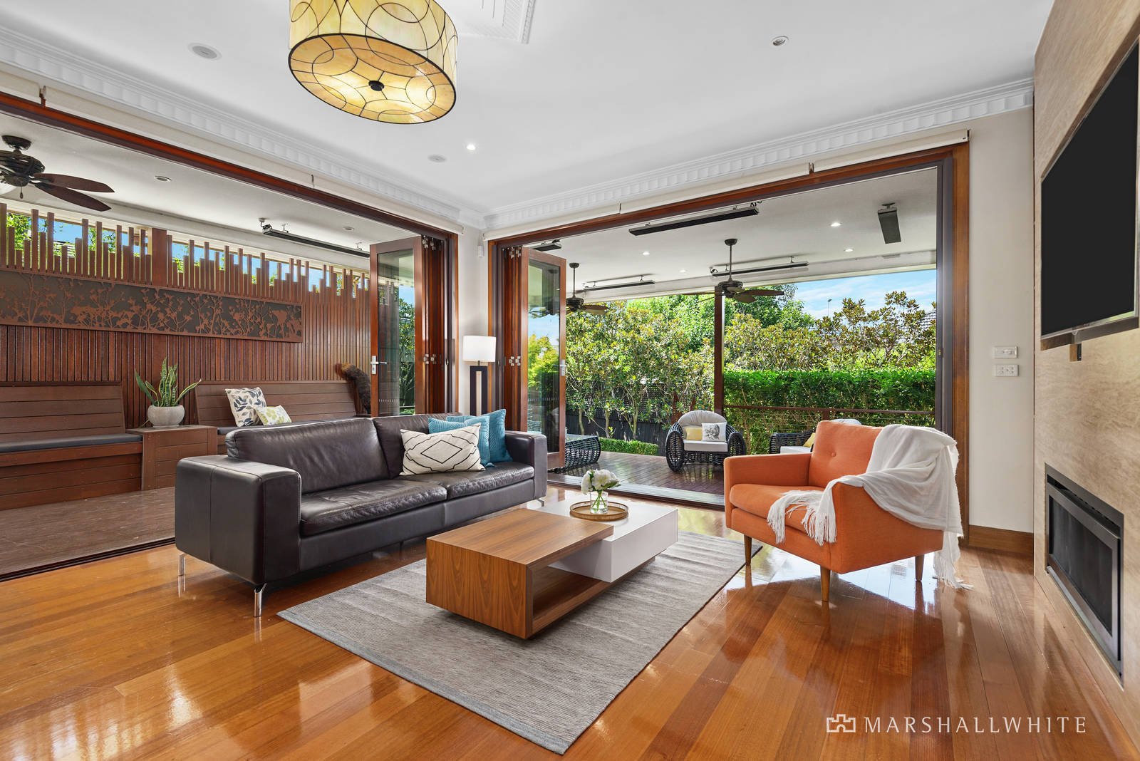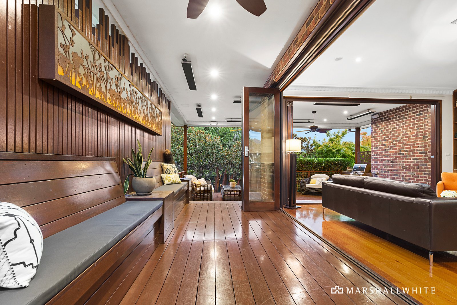 A traditional lounge and dining are each exquisitely finished with open fireplaces, decorative ceilings and polished timber floors, as the home builds towards its open-plan rear. Appointed with stone benches, SMEG appliances, an integrated Liebherr refrigerator and a contemporary gas log fireplace, the kitchen / meals / living is a welcoming space that flows through two sets of double-glazed concertina doors to a huge undercover deck of Merbau. With built-in speakers, ceiling fans, outdoor heating and a gas mains BBQ, the promise here is of year-round entertaining in fine style.