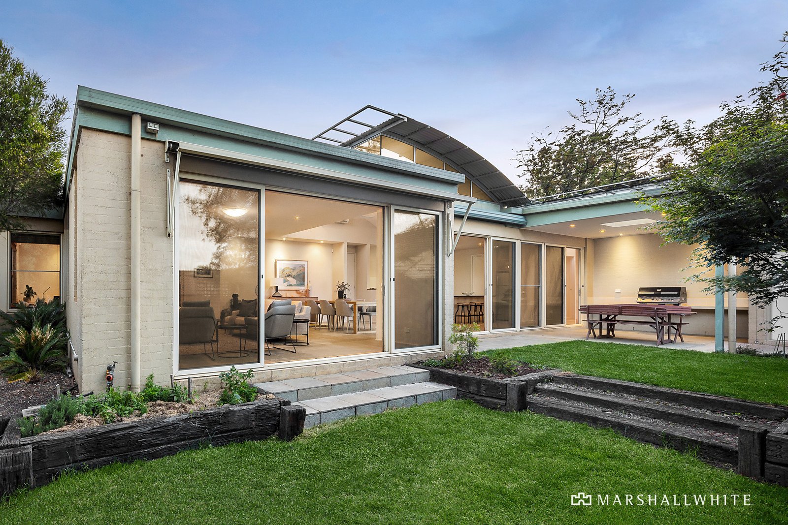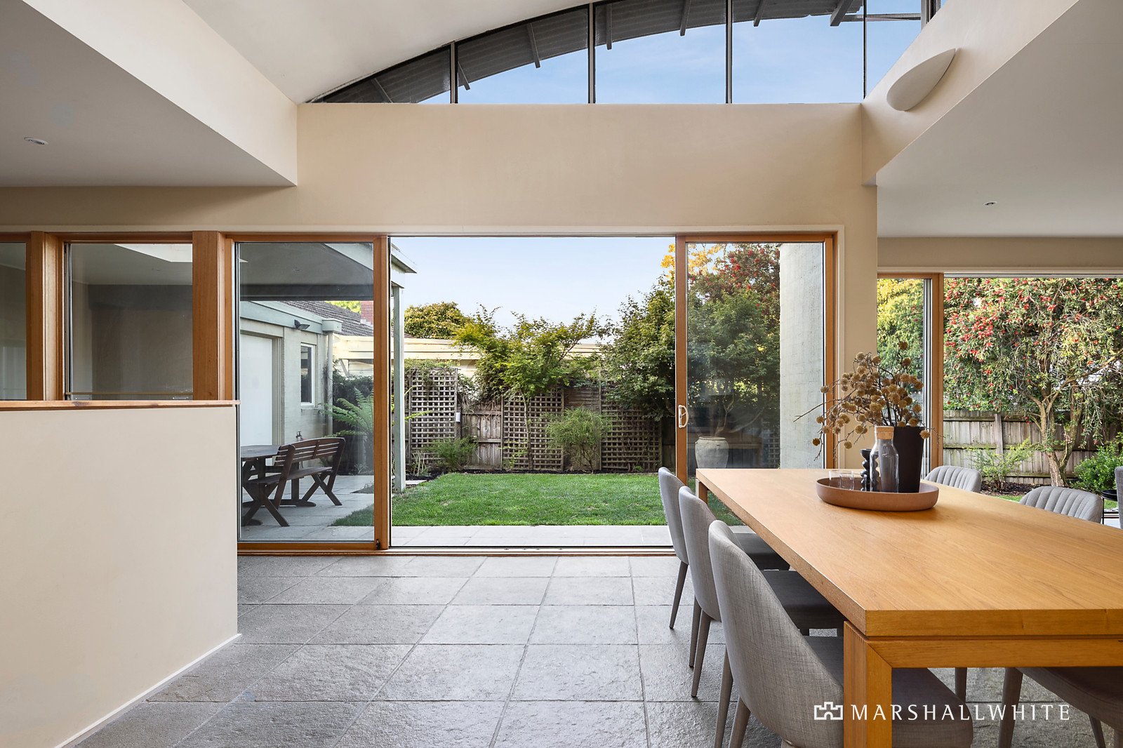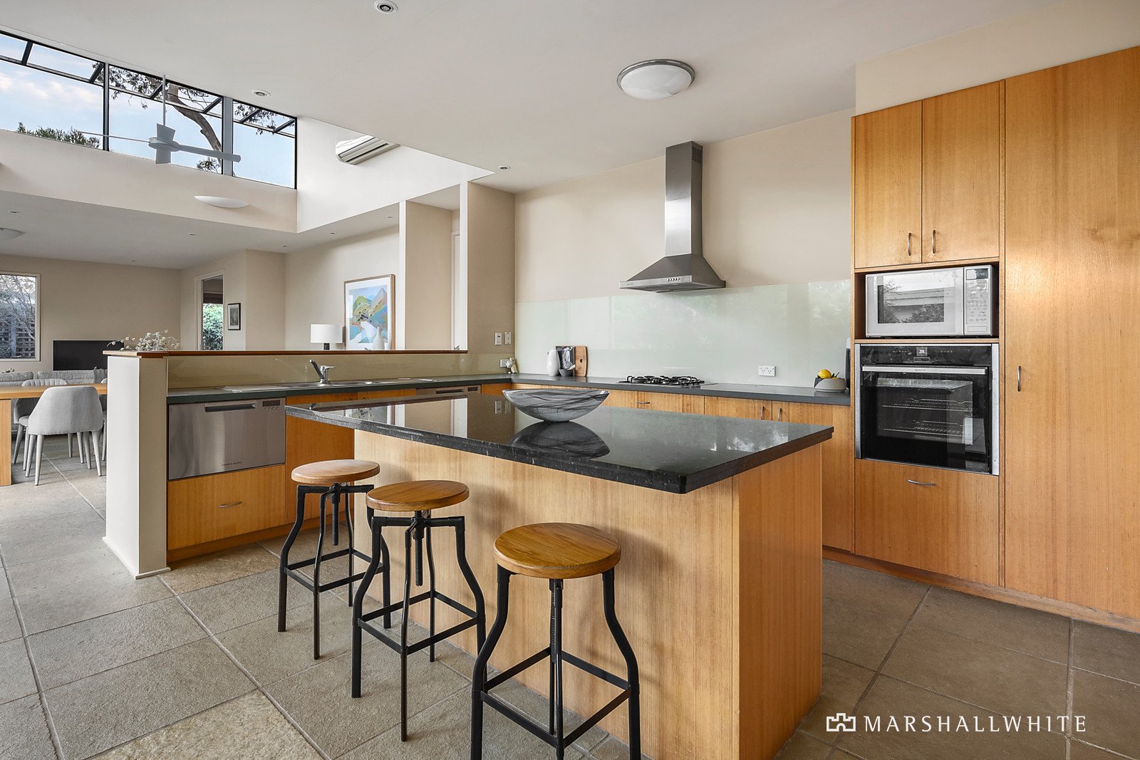 The curved wave-like roofline with clerestory windows adds a wonderful sense of space and light throughout. Soaring ceilings and Limestone floors define the wide entrance hall and the expansive north-facing open plan living and dining room with gas log fire and modern kitchen appointed with a granite island bench, Neff oven and walk in pantry. A bank of glass sliders extend the living out to a large undercover Limestone terrace with BBQ and a remote sun-awning. It's an idyllic space for year-round al fresco dining overlooking the private leafy garden. The main bedroom with walk in robe and en suite opens to its own private west-facing courtyard with a lily pond. In a separate wing, there are two additional robed bedrooms and family bathroom. Perfect for working and studying from home, a versatile and spacious home office or 4th bedroom is fitted with built in desks and bookshelves.