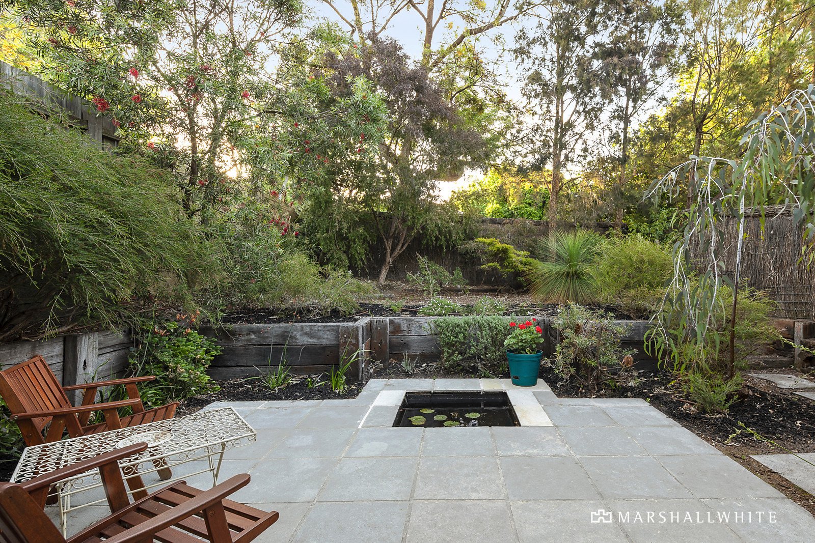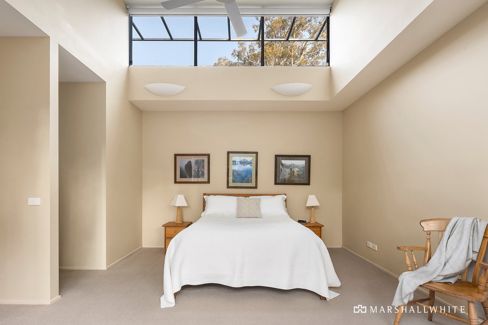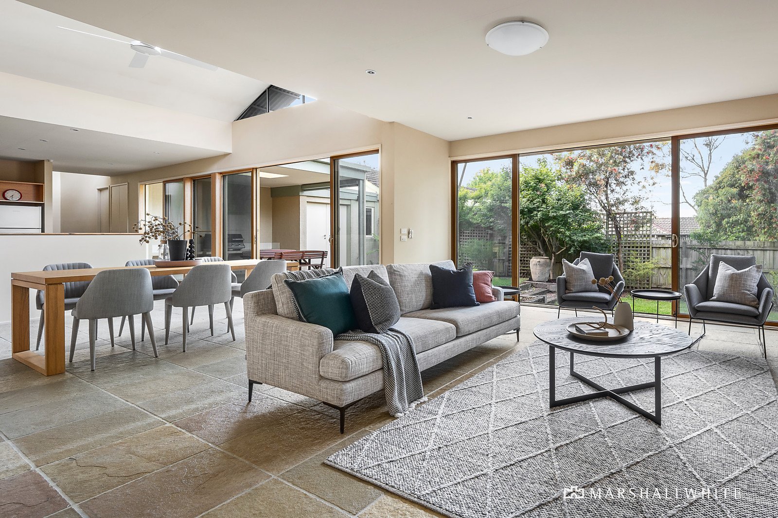 The curved wave-like roofline with clerestory windows adds a wonderful sense of space and light throughout. Soaring ceilings and Limestone floors define the wide entrance hall and the expansive north-facing open plan living and dining room with gas log fire and modern kitchen appointed with a granite island bench, Neff oven and walk in pantry. A bank of glass sliders extend the living out to a large undercover Limestone terrace with BBQ and a remote sun-awning. It's an idyllic space for year-round al fresco dining overlooking the private leafy garden. The main bedroom with walk in robe and en suite opens to its own private west-facing courtyard with a lily pond. In a separate wing, there are two additional robed bedrooms and family bathroom. Perfect for working and studying from home, a versatile and spacious home office or 4th bedroom is fitted with built in desks and bookshelves.