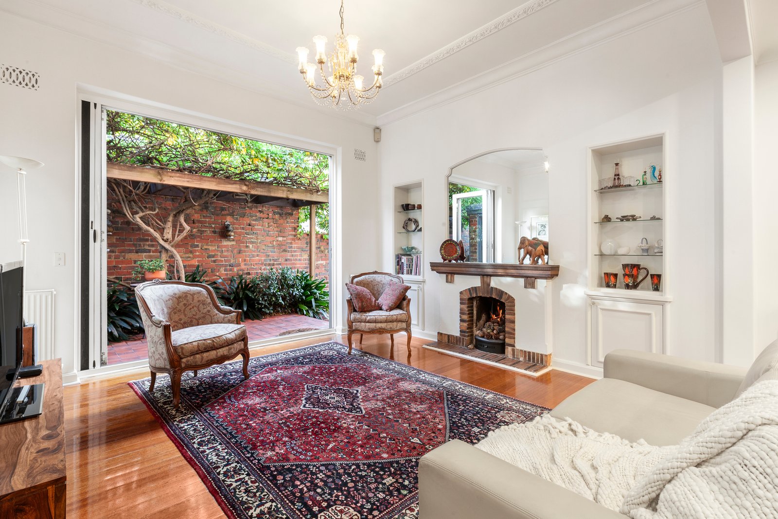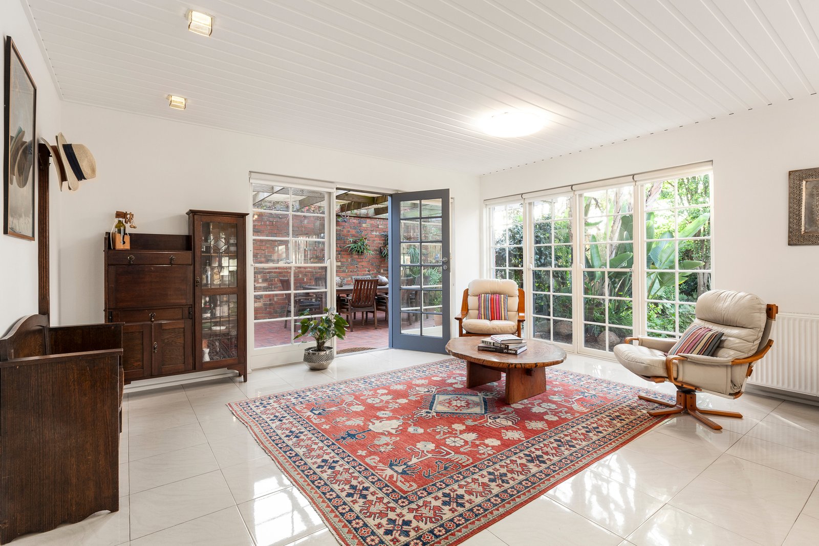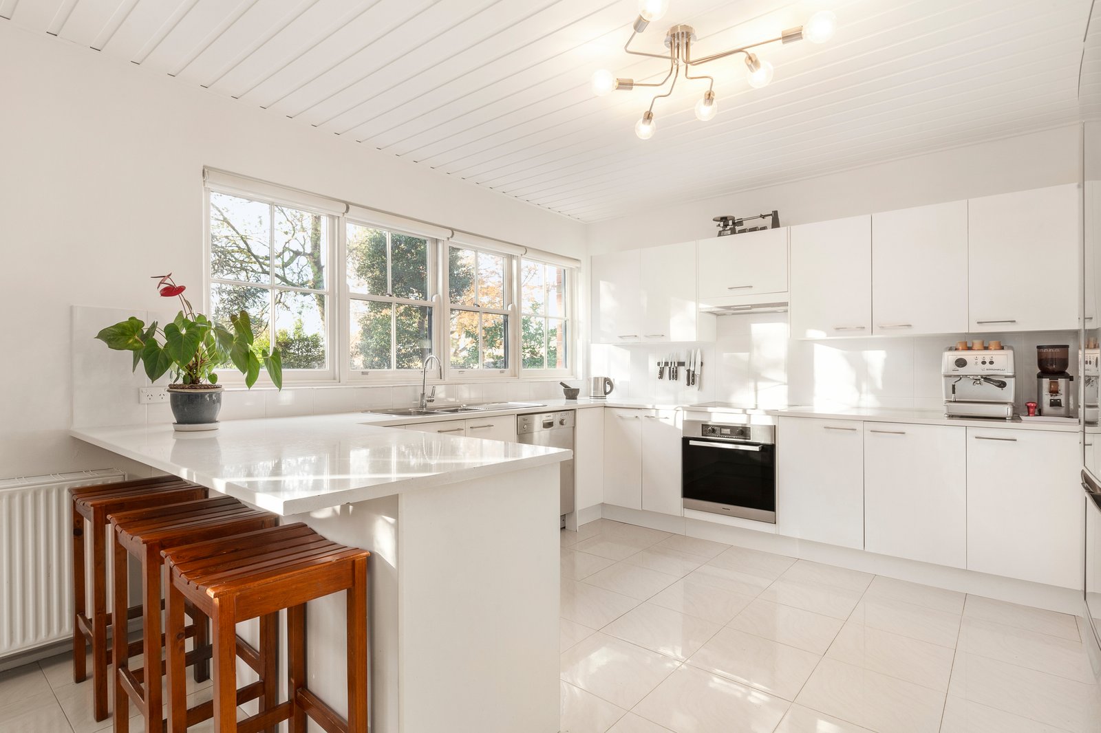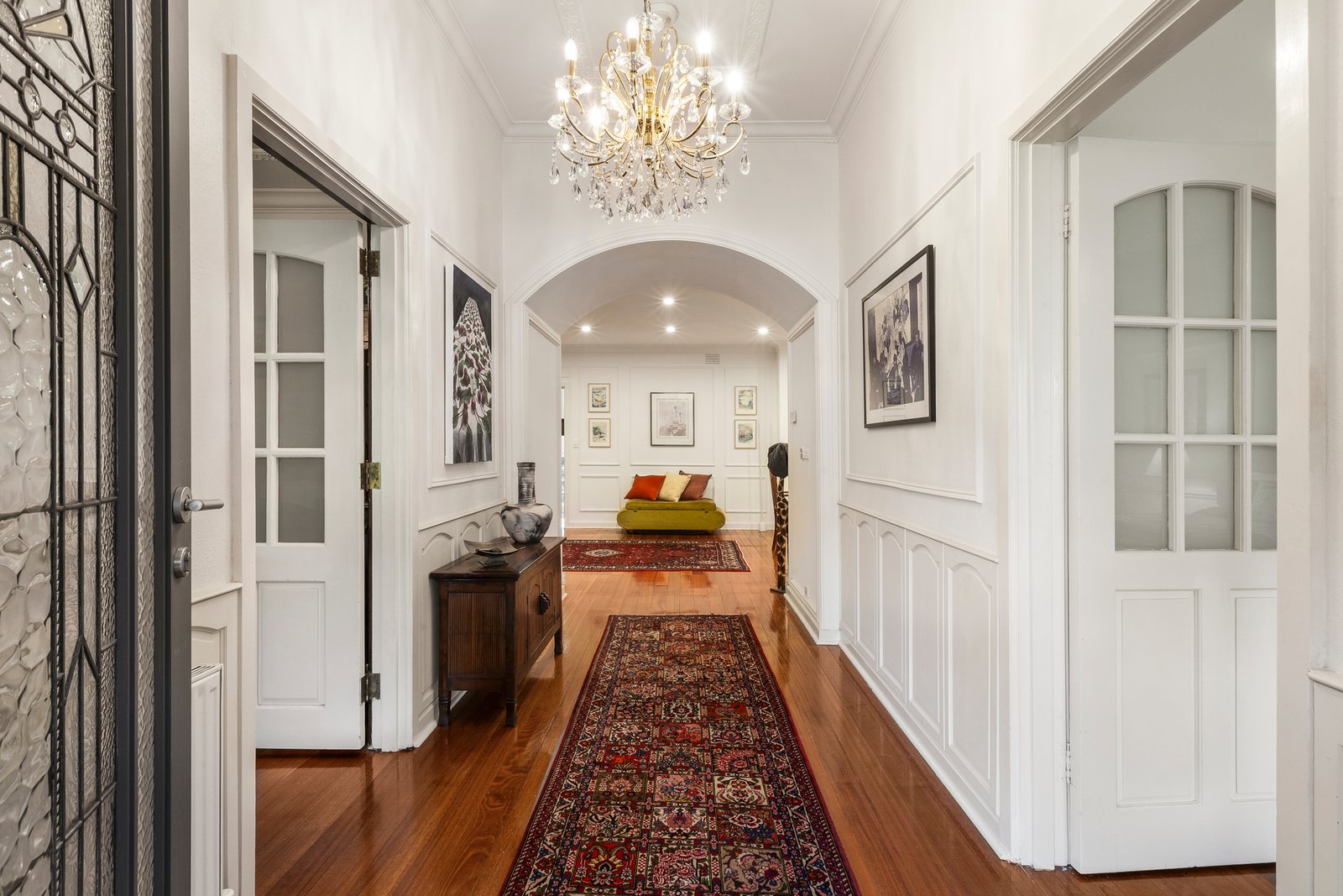 Timber floors flow through the central arched hallway to an elegant sitting room or 4th bedroom with open fire and to the graciously proportioned living and dining room with a fireplace and bi-fold doors opening to a paved west-facing terrace. Streaming with northern light, the superb modern kitchen appointed with Miele/Bosch appliances and the family dining room open to a large terrace and the deep private north-facing garden. The glorious main bedroom with walk in robe and en suite and a study are matched by a children’s wing comprising two robed bedrooms, a retreat and bathroom.