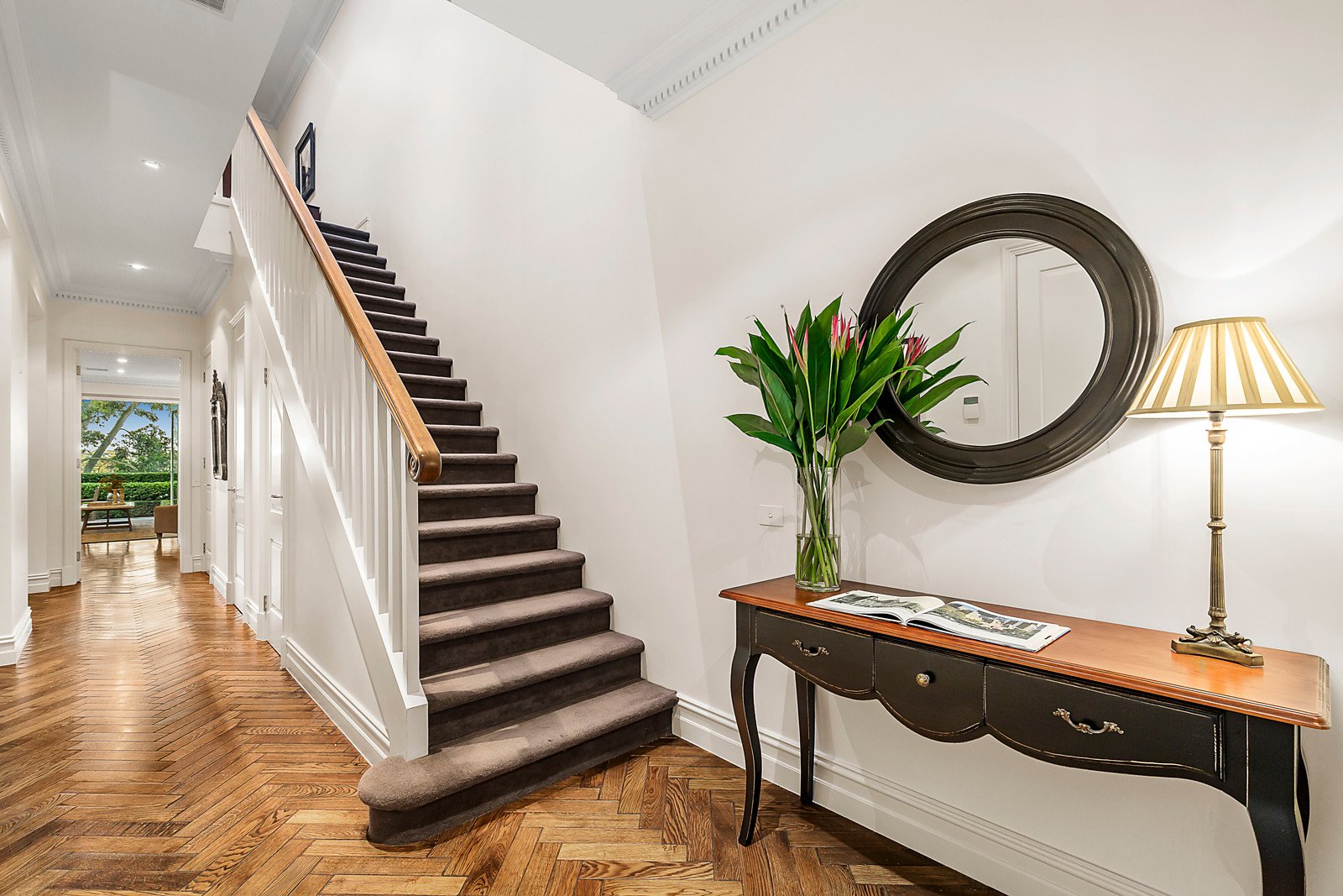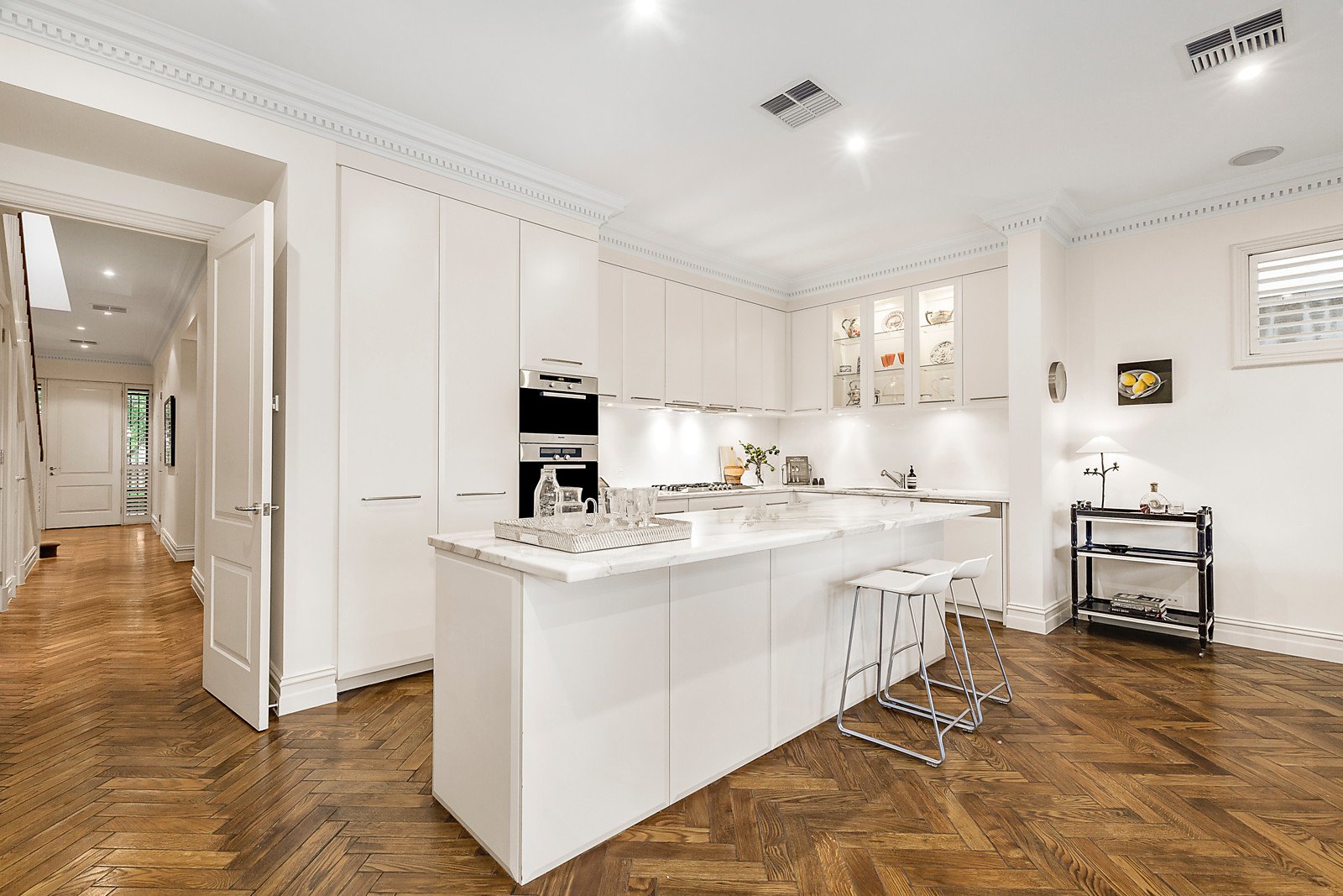Designed to capture abundant natural light on both levels, the home features spacious open plan living and dining which extends out to a manicured courtyard garden with water feature and direct park access, while the adjoining gourmet kitchen boasts marble benches, walk in pantry and a suite of Miele appliances including gas cooktop, built in microwave, wall oven and integrated dishwasher. The addition of a formal sitting room with Heat & Glo gas fireplace creates exceptional entertaining options for year round enjoyment.