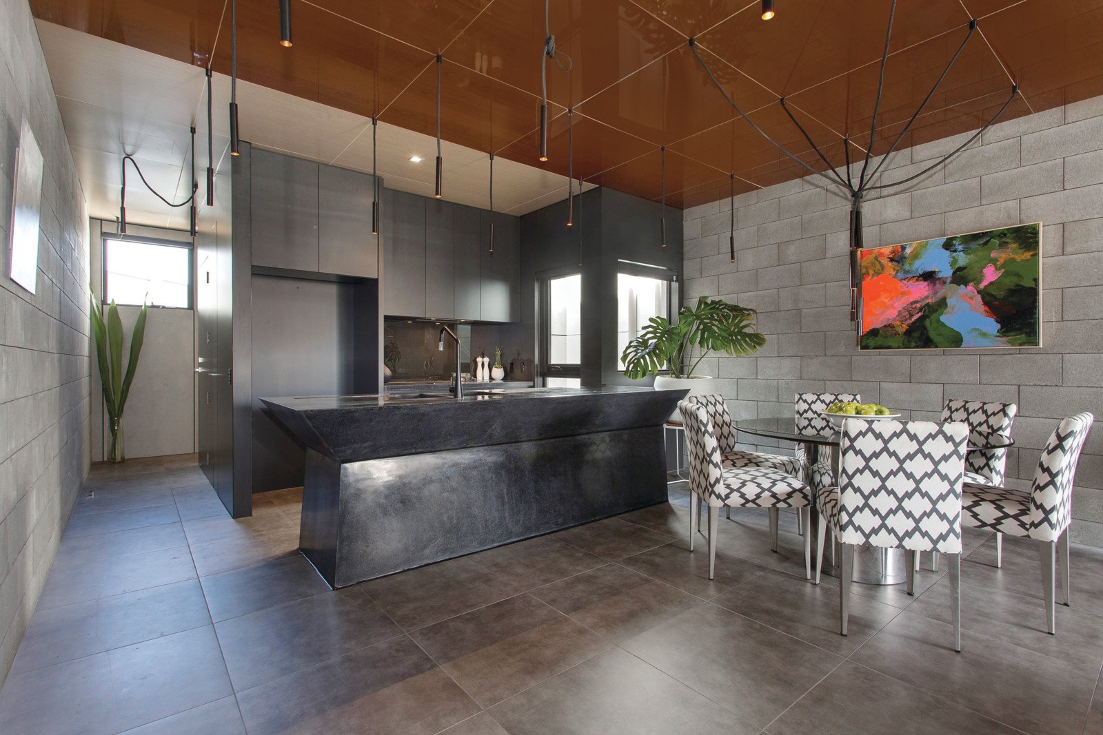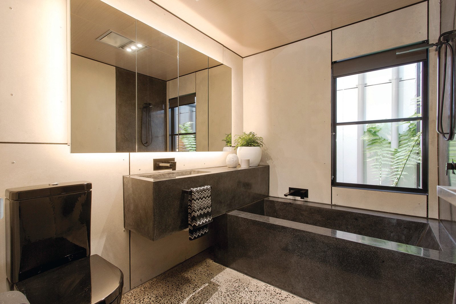 Bespoke finishes that include recycled timber, marine ply and stone surfaces along with innovative designer lighting combine to create a warm, inviting and ultimately functional interior within a unique and spectacular façade. Dramatic angles and polished concrete floors define the ground level comprising a stunning main bedroom with chic en-suite, walk in robe and private courtyard, two further bedrooms and an ultra stylish bathroom with black stone bath. Concrete form stairs lead up to a sensational living and dining space with a sleek black stone European kitchen opening out to a private north facing decked balcony offering amazing city views. A versatile retreat, study or guest bedroom is accompanied by a 3rd chic bathroom. Simply breathtaking, it also includes RC/air-conditioning, Euro-laundry, solar hot water, rainwater tank, irrigation, storage and carport.