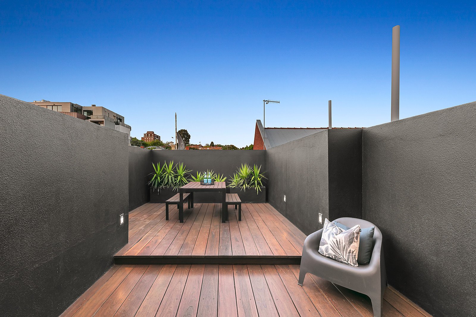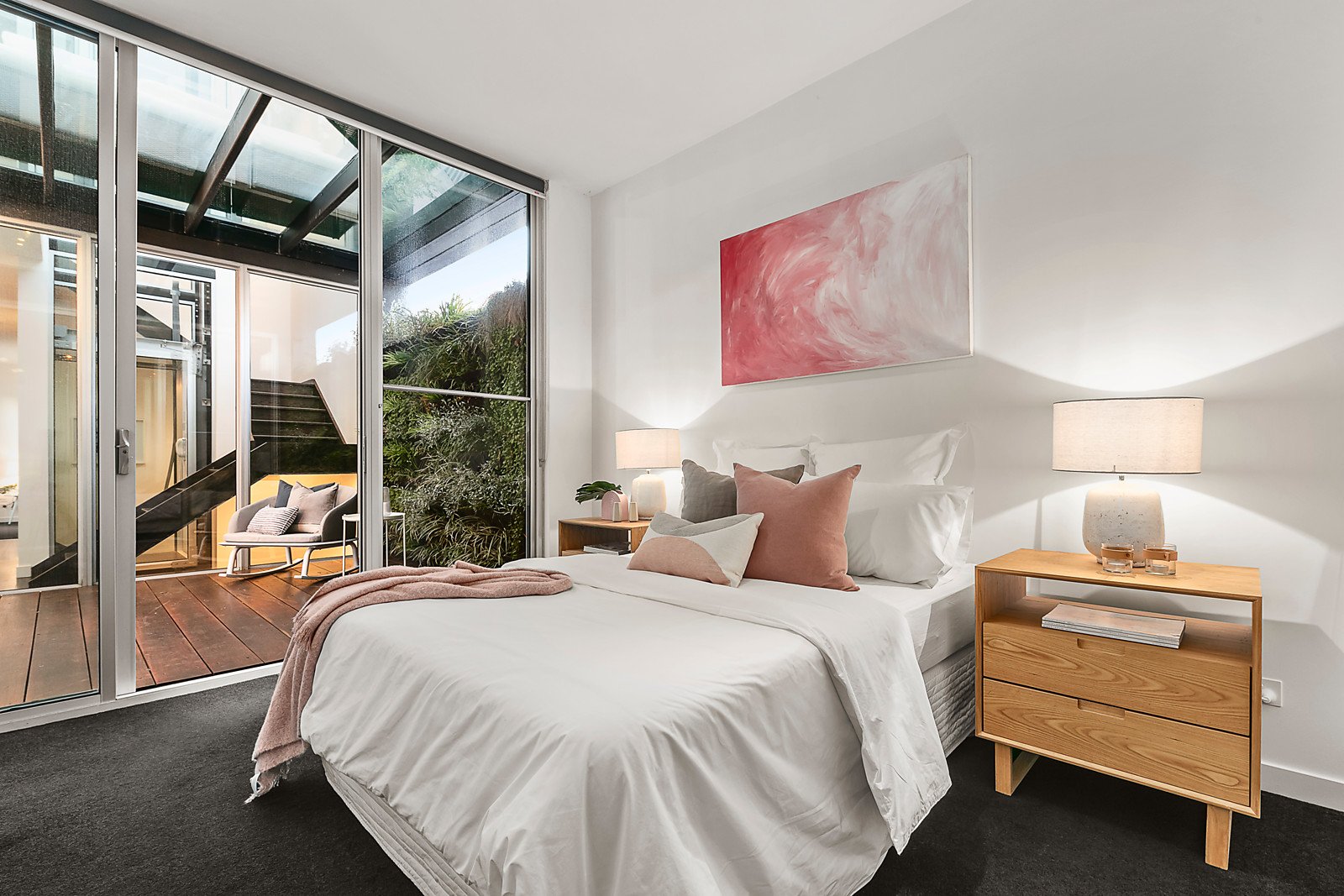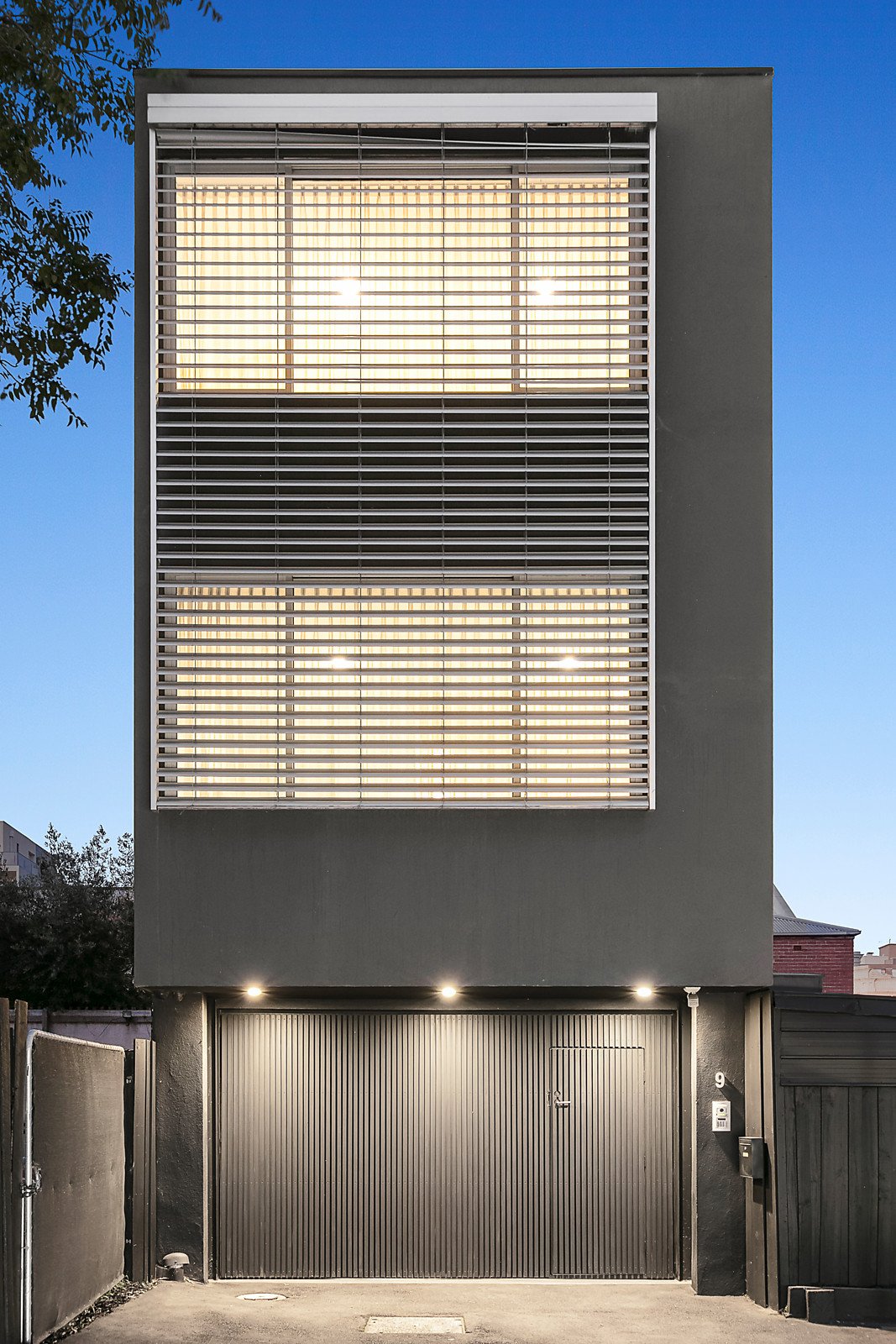 Maximising natural light, the generous living and dining spaces with a circular sky light above, a gas log fire and sleek gourmet kitchen appointed with marble benches, Bosch appliances and an integrated Liebherr fridge/freezer are on the second level. The living spaces open to a serene central light-well and through a study/retreat to the large sunny rooftop deck, the ideal space for al fresco dining and entertaining. Also positioned around a central glass covered decked courtyard with lush vertical garden, the accommodation level comprises a gorgeous main bedroom with designer en suite and walk in robe, a second bedroom with robe and balcony, third bedroom with built in robe and stylish bathroom. On the ground level there is a versatile foyer ideal as a home office or retreat, utility/store-room and double garage.