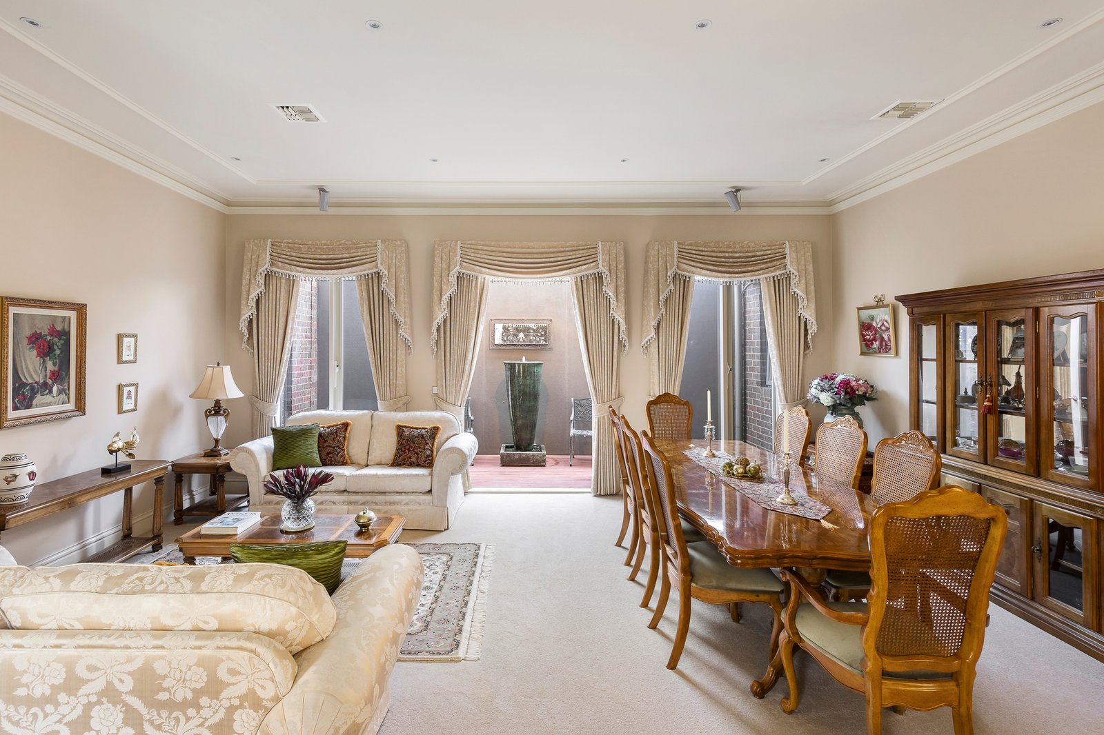 Each living zone offers access to its own picturesque courtyard, creating a seamless indoor-outdoor living experience. One courtyard is highlighted by a tranquil water feature, while the other features an enclosed barbecue area with provisions for connecting a spa; both peaceful settings for social gatherings or relaxation.