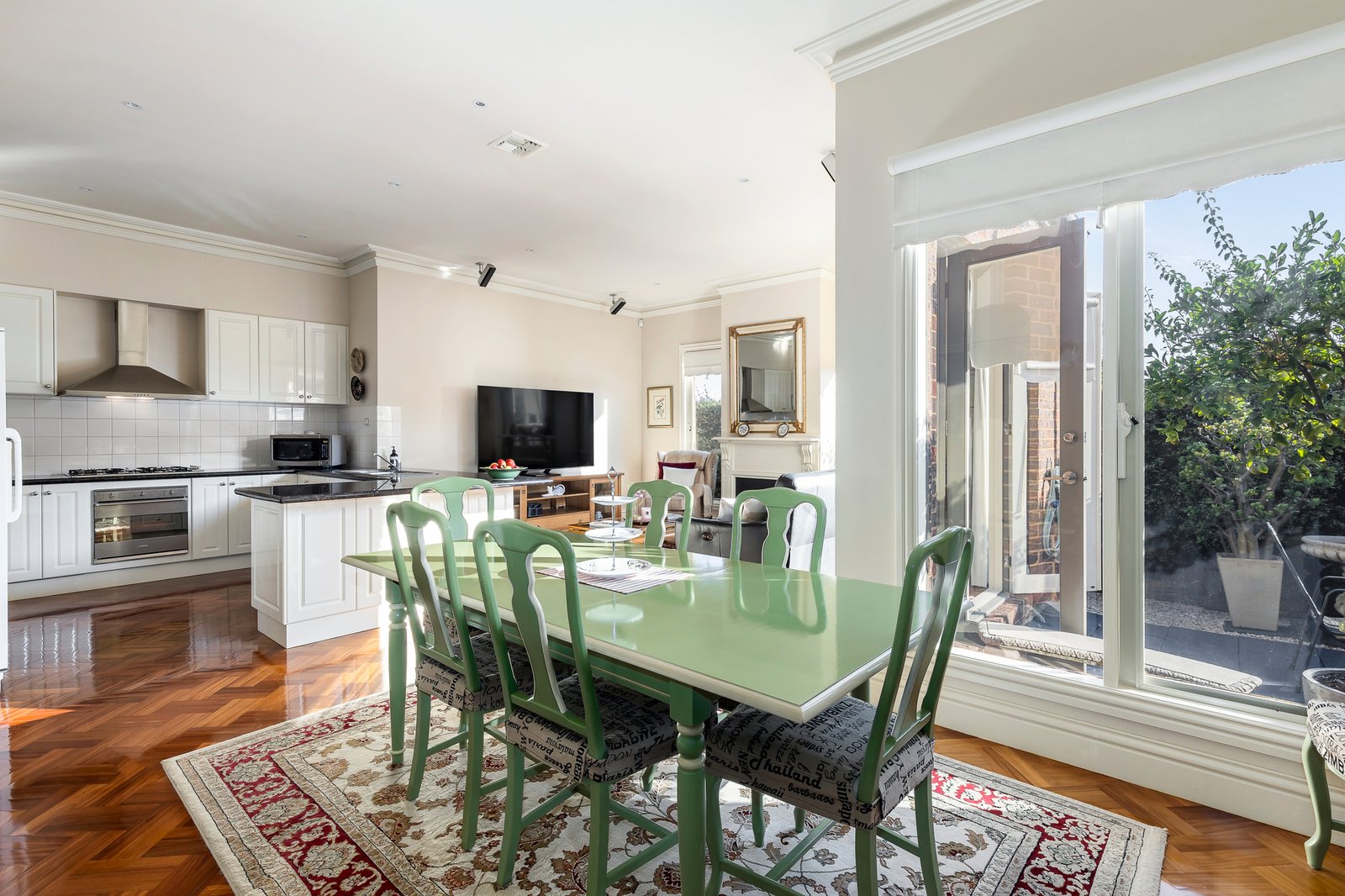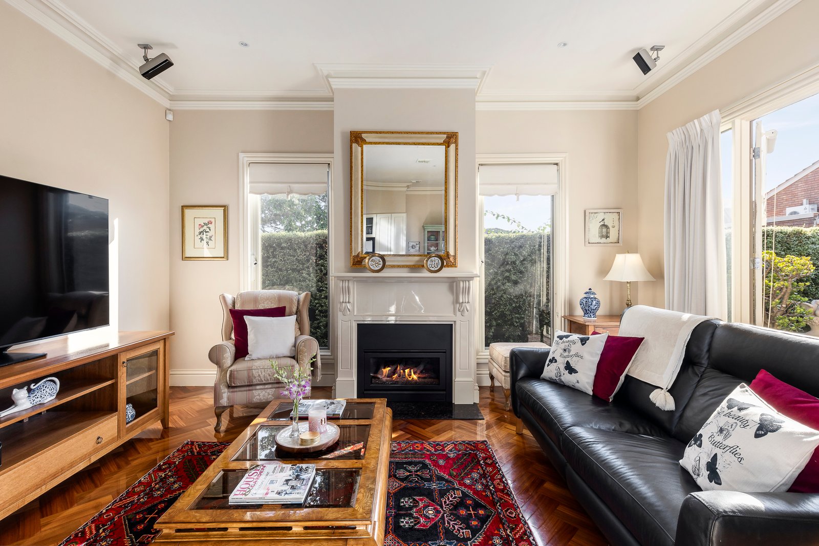 Striking parquetry floors, floor-to-ceiling windows, and deluxe fittings and fixtures run throughout. The formal lounge and dining areas, bathed in sunlight, offer sophisticated spaces for hosting guests or enjoying peaceful moments. A stylish updated kitchen with granite benches, Smeg appliances, and abundant cabinetry flows into the spacious casual dining area and family room with gas fireplace.