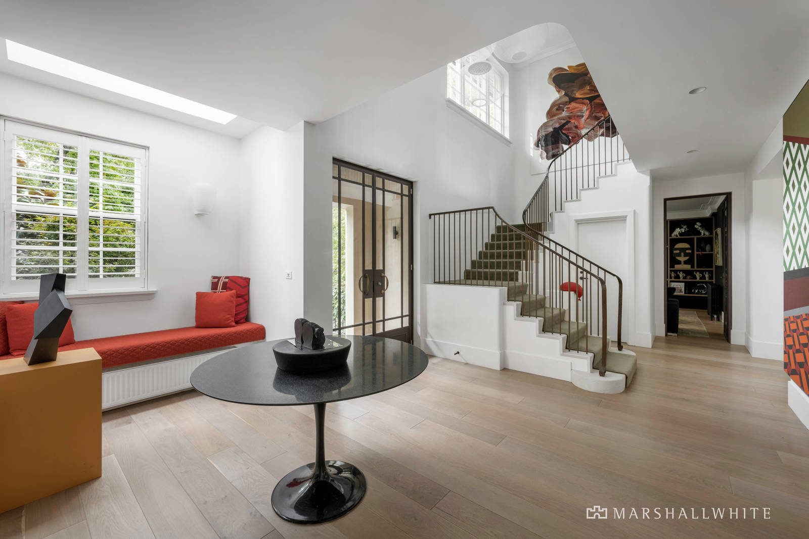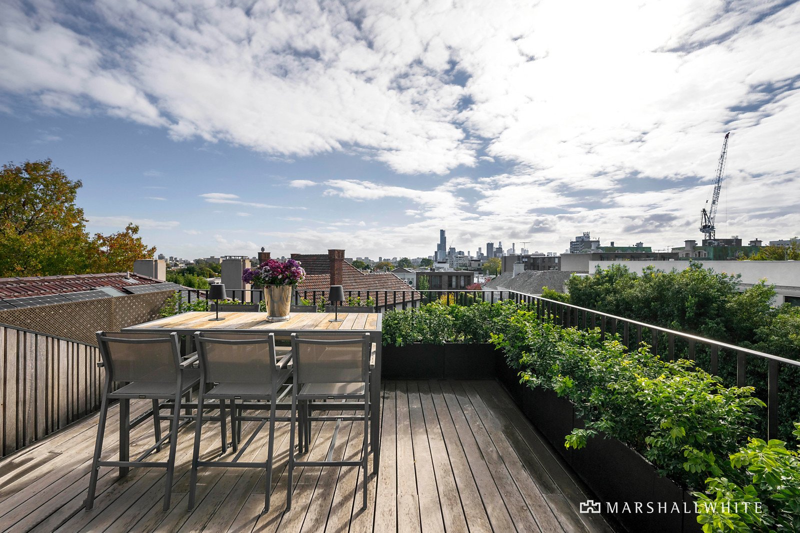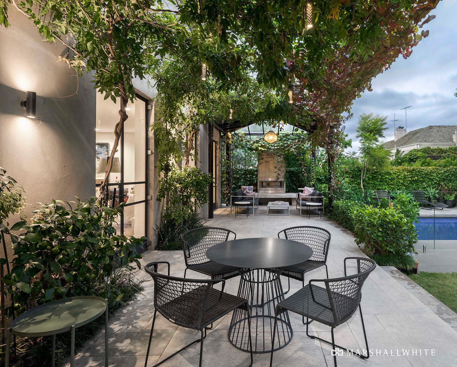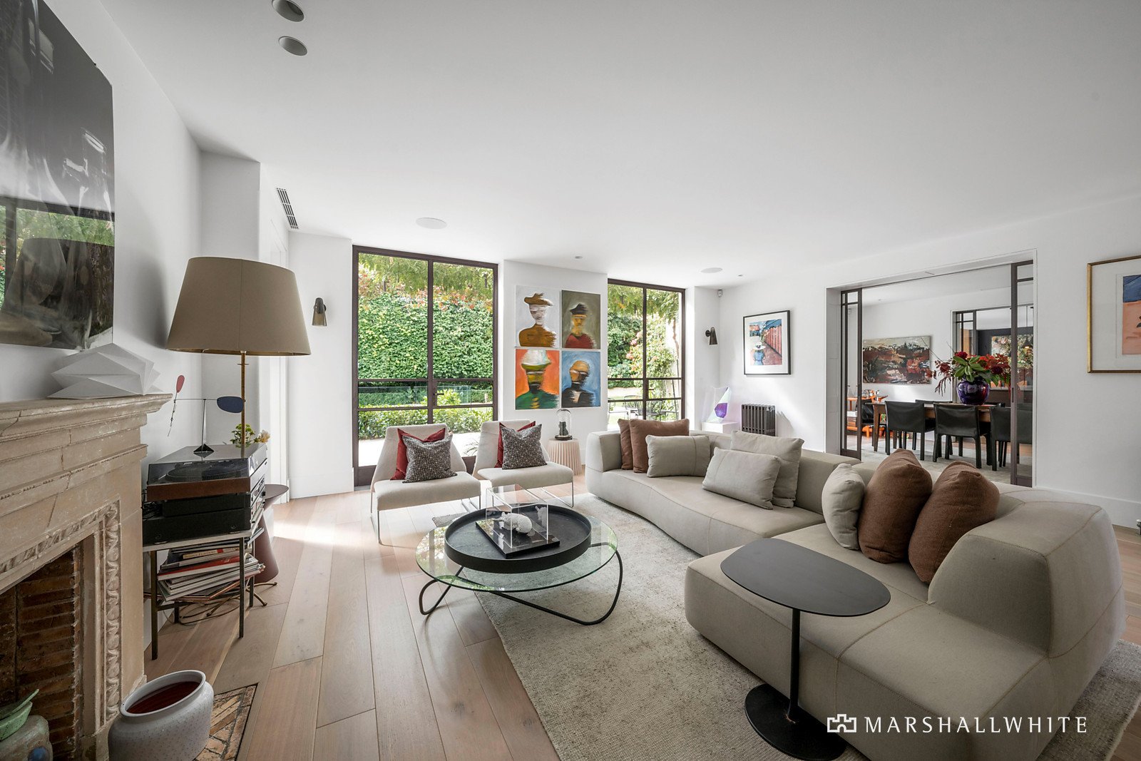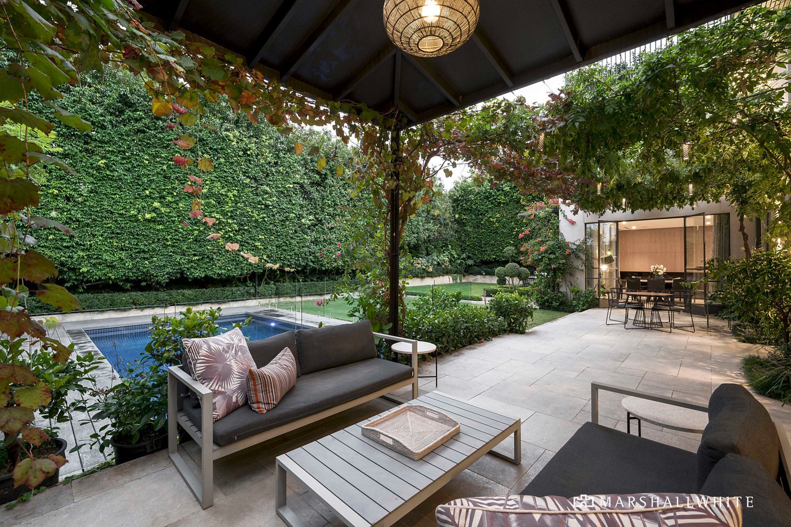 A sense of occasion is created by a private walkway through colonnaded magnolias and gardenias in oversized bronzed planters culminating in the light filled reception hall. Beneath a double height void and featuring wide oak floors and stunning bronzed steel framed doors, the foyer introduces a beautifully proportioned sitting room with open fire and inviting formal dining room, both opening to the terrace and garden. The palatial open plan living and dining room with a gas fire opens through a series of bronzed steel framed French doors to the glorious private north-facing garden. A captivating oasis of greenery with vine covered stone terraces, built in BBQ and pizza oven, an undercover al fresco terrace with gas fire and a picturesque, solar heated pool. It's an utterly irresistible setting for year-round outdoor entertaining and relaxing. The state of the art kitchen featuring a long Italian stone island bench, Miele and VZUG appliances, Liebherr integrated fridge and fully appointed butler's pantry caters to any culinary challenge. In addition, a refined media room or den, spacious home office with built in desk and a cosy study with a gas fire provide retreats for every member of the family. Accessed by both lift and a seductively curved custom designed staircase, the magnificent main bedroom with opulent en suite and dressing room sets a benchmark in luxury that is met by three additional bedrooms with stylish en suites and robes. A sensational rooftop terrace commanding panoramic city views is the perfect venue for pre-dinner drinks while the evocative 80 doz. wine cellar and tasting room is a must for sampling reds.