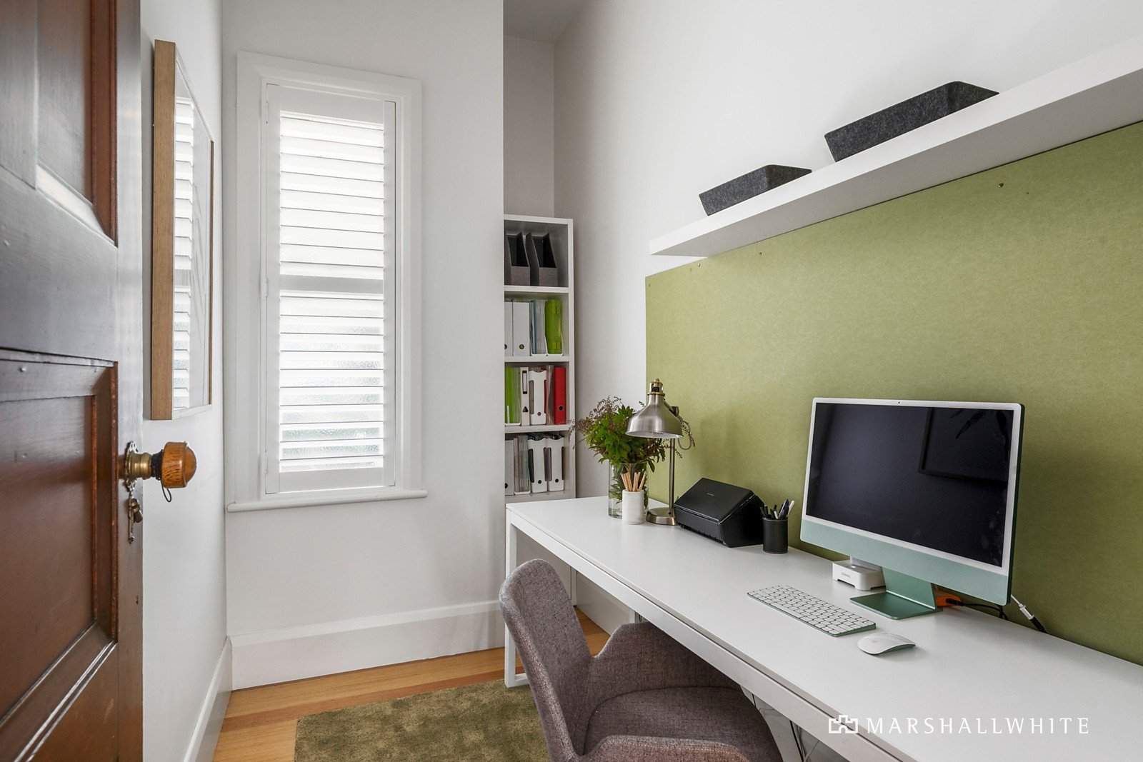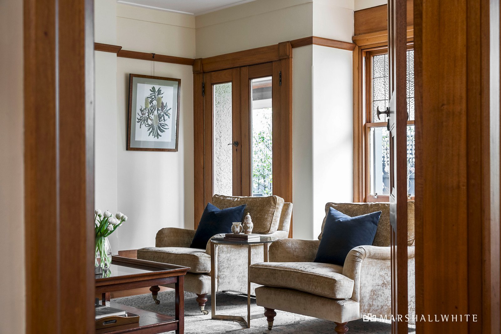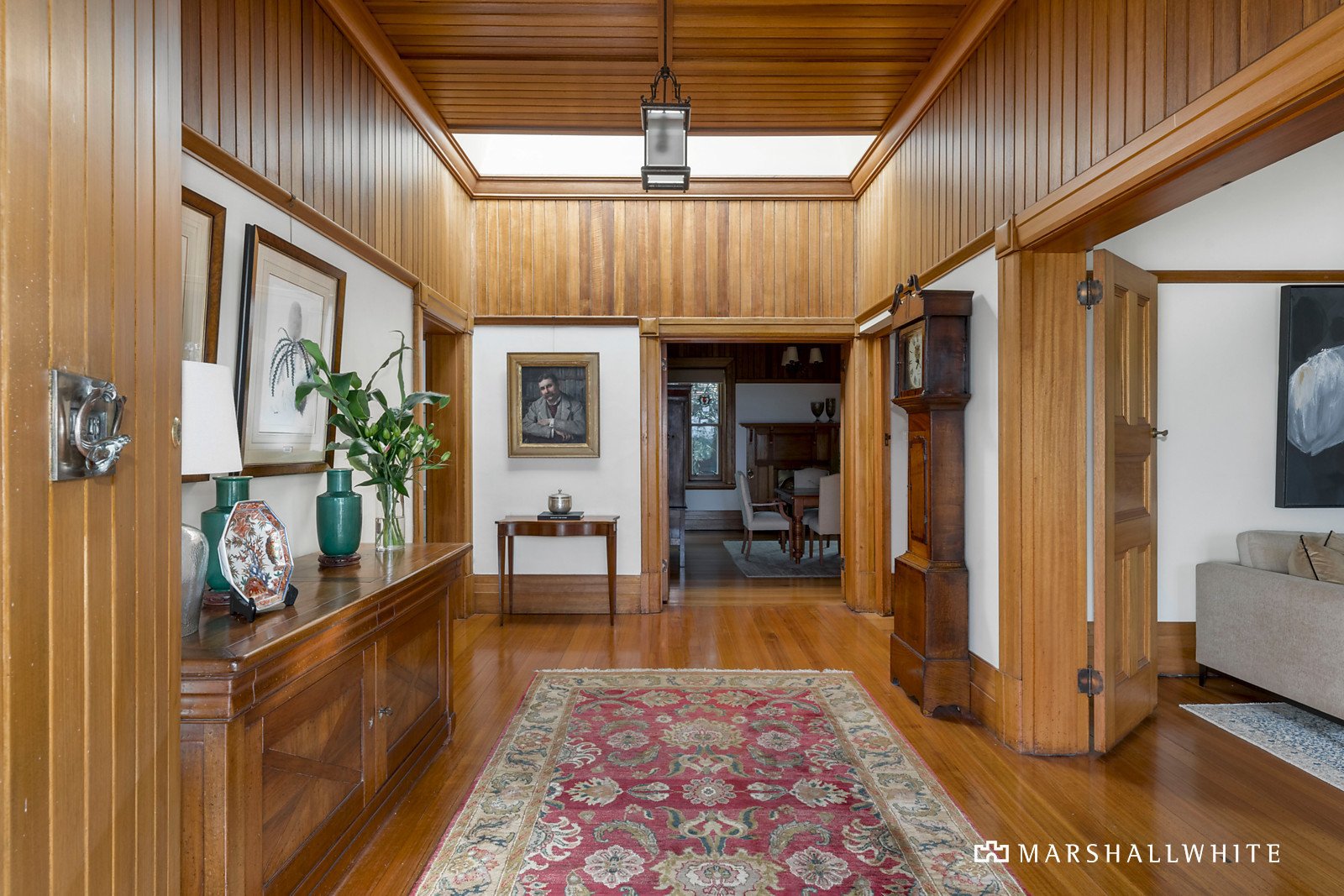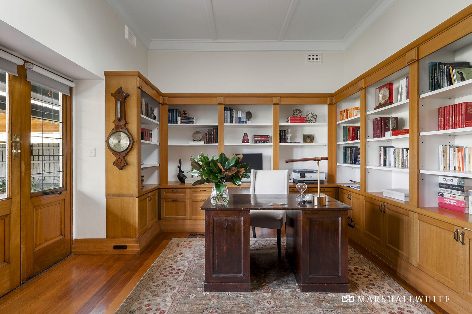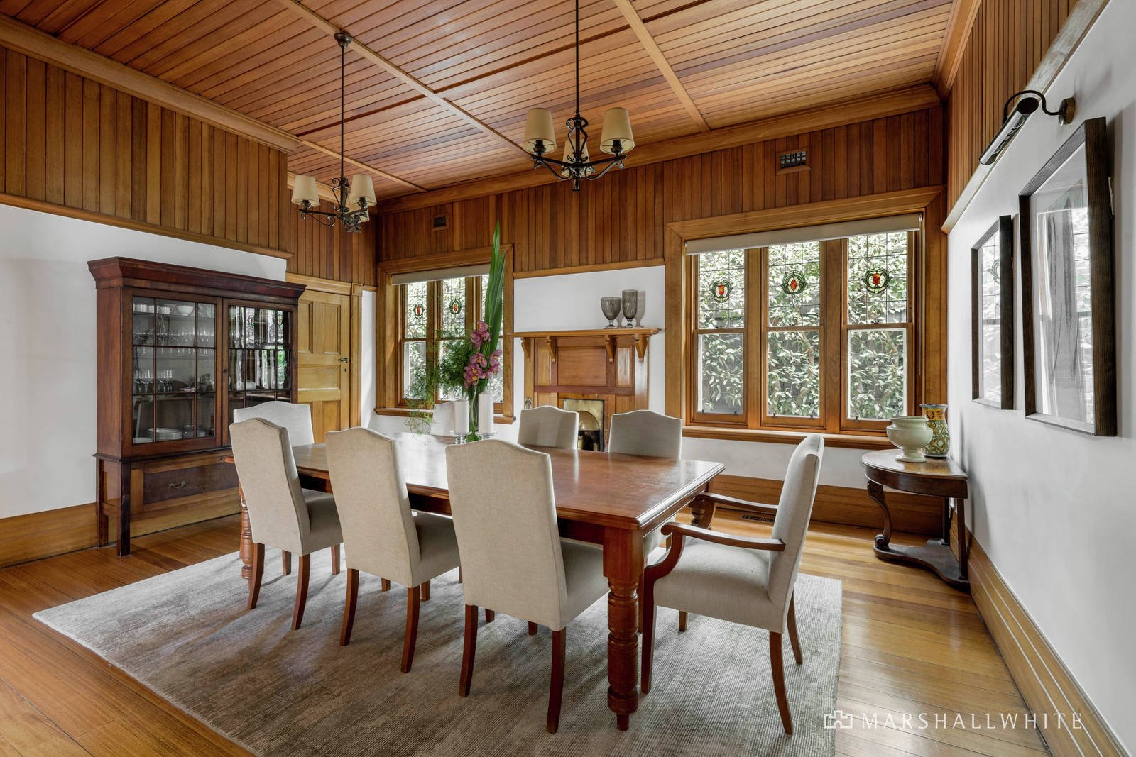 Unassuming with a winding garden entrance on almost half an acre, the imposing interiors welcome a sense of refinement and connectivity, underpinned by soaring timber-lined ceilings and walls throughout the grand, sky-lit entrance hall. Original leadlight windows and hardwood floors continue into the formal dining and sitting rooms with an ambient open fireplace before culminating in a private parent's wing, with a custom-fitted home office, main bedroom with walk-in storage and spectacular modernised period-style bathroom.