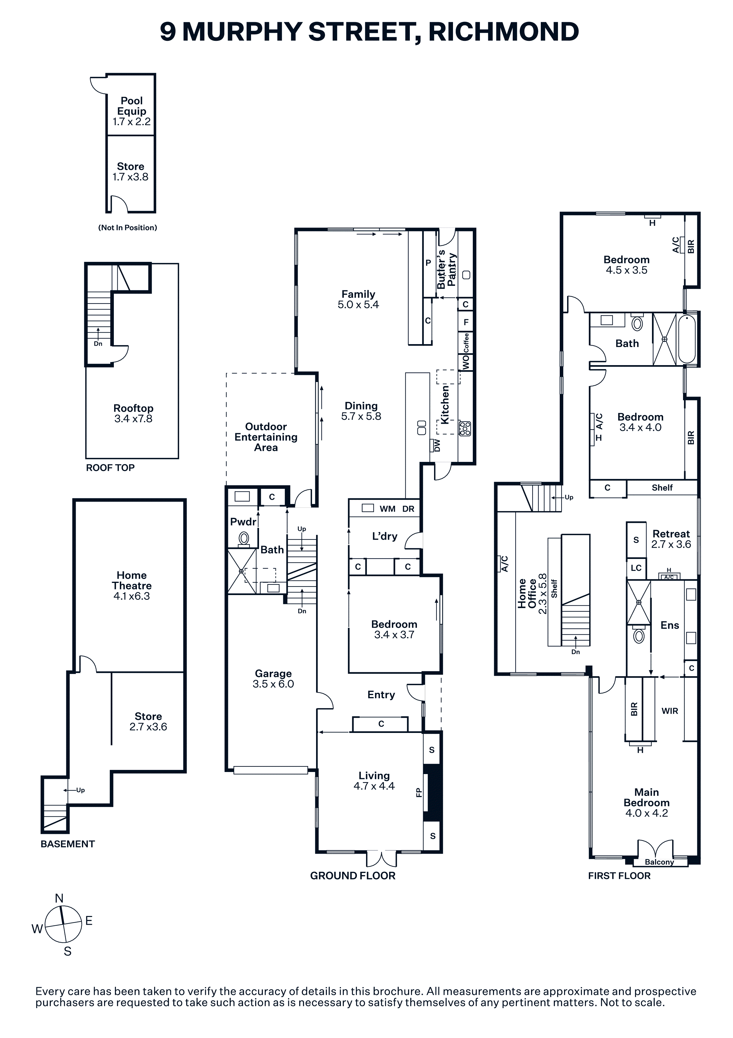 Upstairs, a dedicated home office with four workstations is balanced by a separate reading room or play area, while accommodation is thoughtfully zoned for growing households. The generous main suite impresses with a walk-through robe and a fully-tiled ensuite with dual vanities, joined by two further robed bedrooms and a family bathroom with tub. Continuing the home’s multi-level reveal, stairs rise to the private rooftop terrace, while below, a basement cinema accessed via the garage creates a brilliant retreat for family movie nights or teen independence.