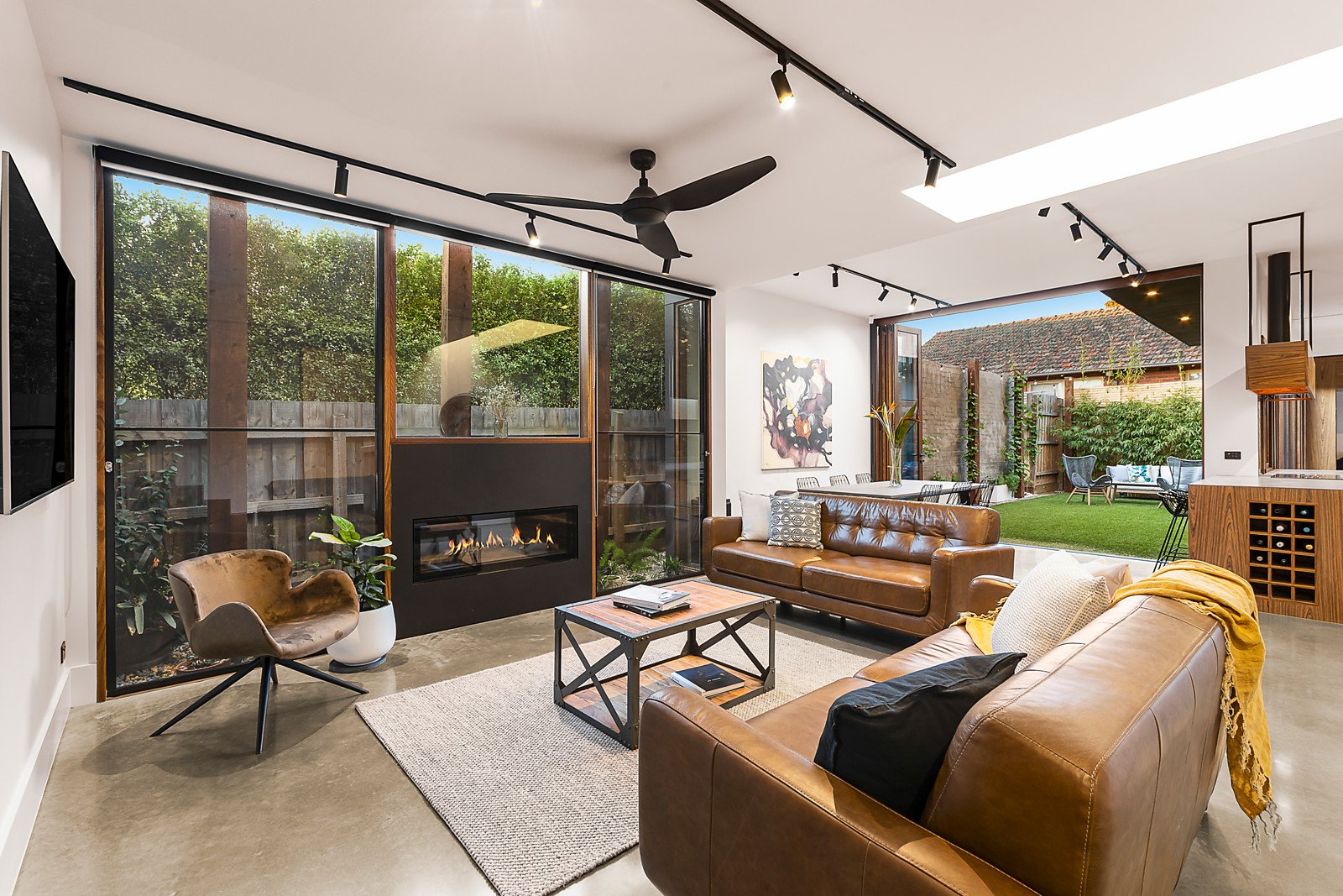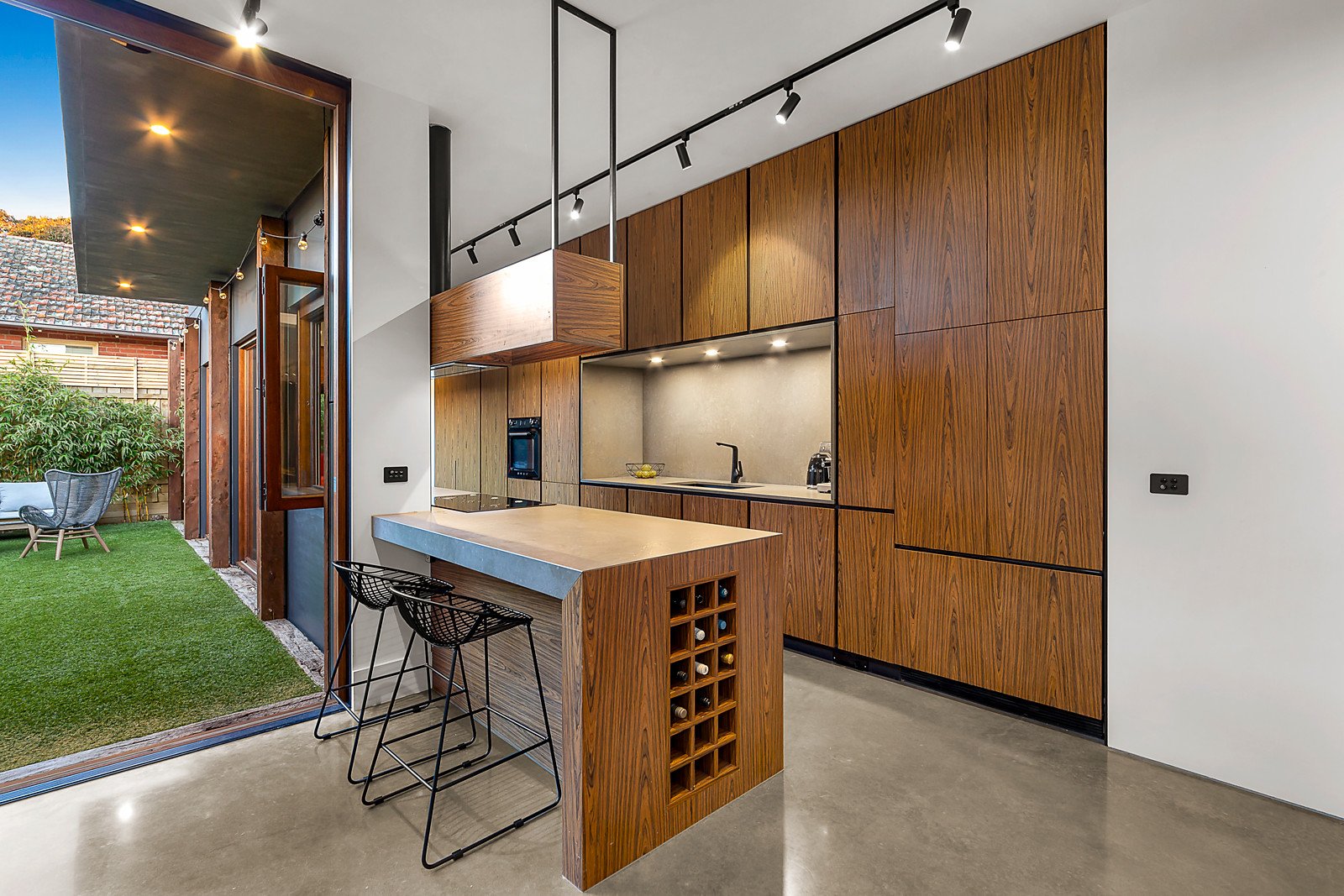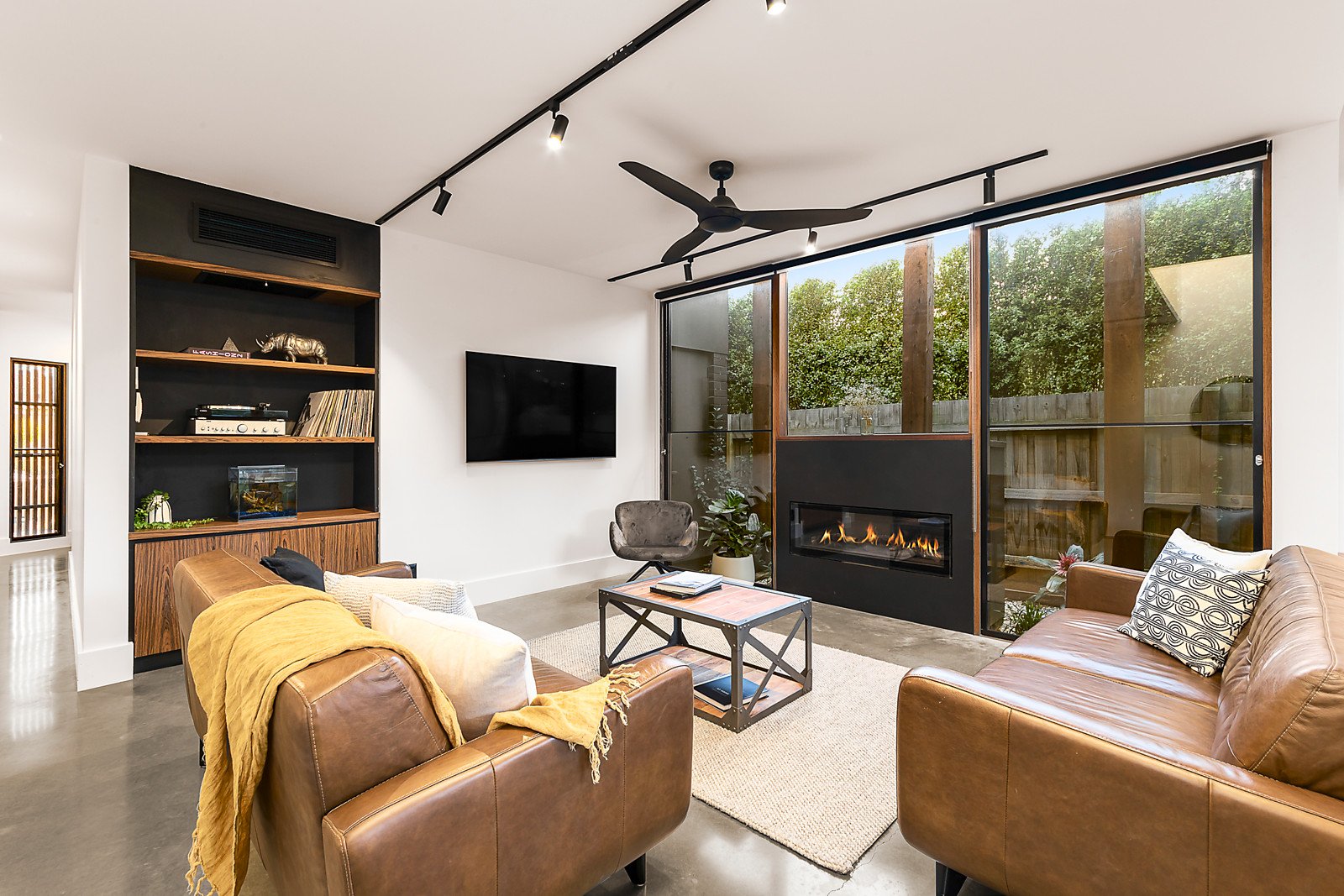 State-of-the-art townhouse is a private retreat where streamlined luxury and easy-care outdoor living are metres from shops, cafes and train station. HIA Victorian Housing Award 2019 Award winning House, winner for Townhouse of the Year, awarded to the builder Neverstop Group, for craftsmanship and design. CBG Architect's Associates own three-bedroom home merges form and function to be the best townhouses of 2019*, (as voted by Victorian Housing Awards). The focus on quality shows in every room, including the main living zone with three-metre ceilings, hydronic slab heating, full-height double-glazed bifold doors with concealed insect screening, and a gas log fire with customized steel hearth. Relax in the reading room/second living zone, where a huge window seat, custom-designed bookshelves and a hidden sliding door create a quiet retreat. Love the gourmet kitchen's clever black glass gas cooktop with retractable burners, Smeg Victoria pyrolytic oven, glass-fronted extractor fan, pullout pantries and Essastone Concreto benches. Each bedroom impresses with towering 4.5-metre vaulted ceilings, and the master luxuriously appointed with a light-filled ensuite featuring an exquisite Pietra Bianca bath. There's a study zone, an abundance of natural light, cross-ventilation, custom-made storage solutions, energy-efficient Australian hardwood timber windows, kitchen servery, and high-spec LED track and pendant lighting. There's so much more to admire, including the north-facing garden with grapevines and artificial grass, and the ultra-convenient address.