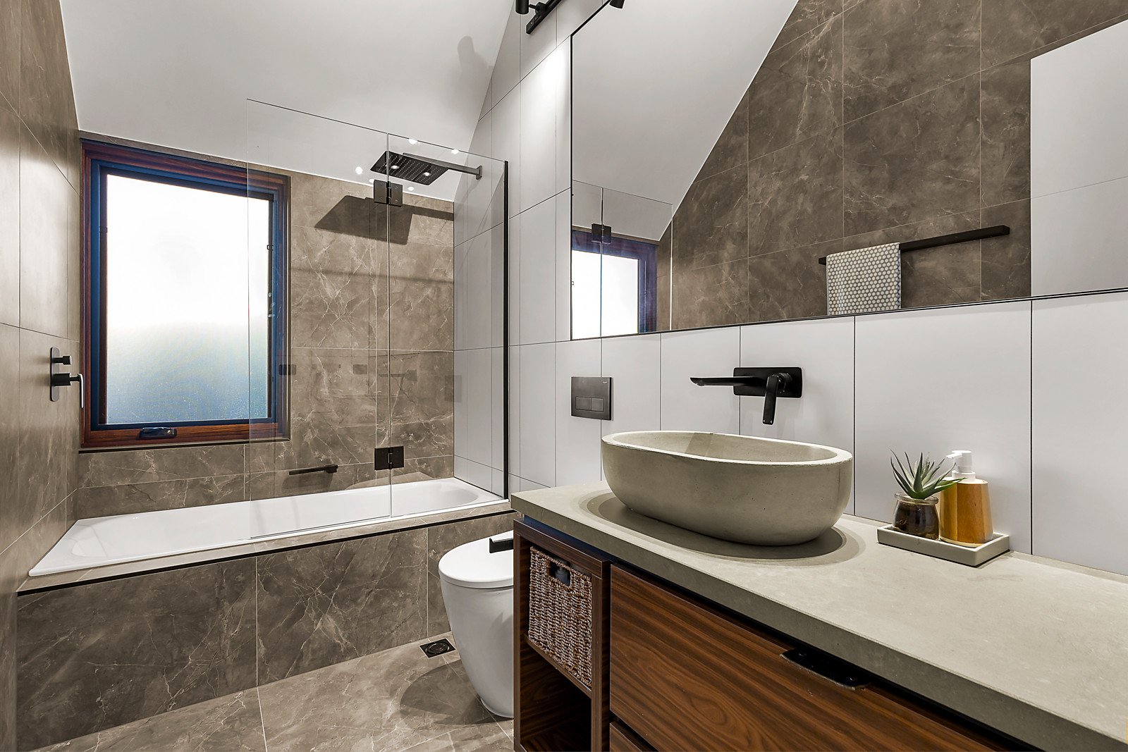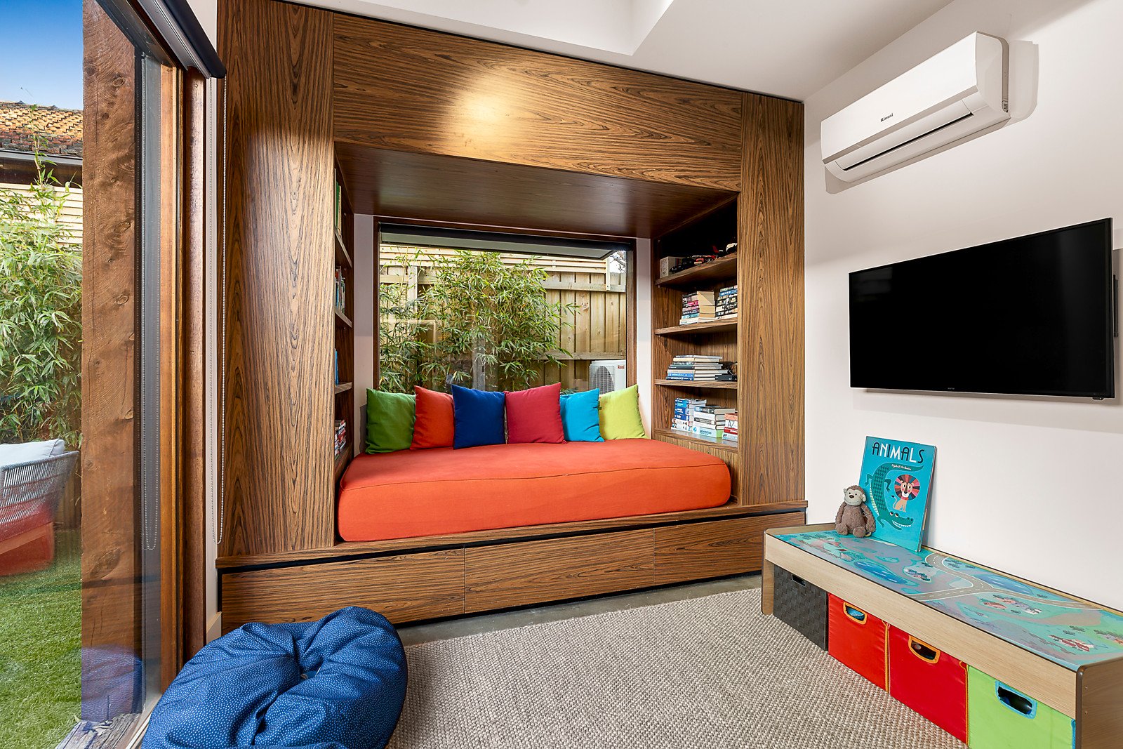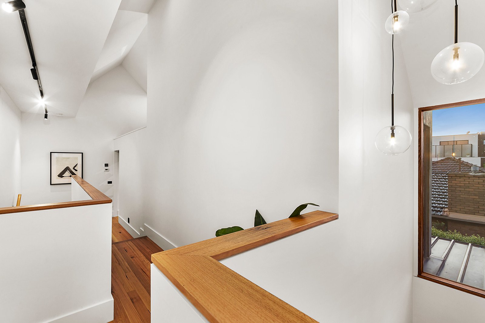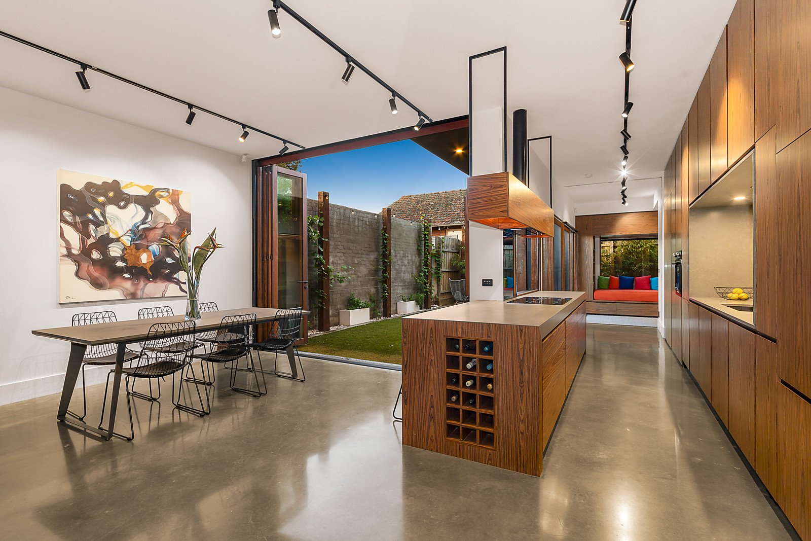 State-of-the-art townhouse is a private retreat where streamlined luxury and easy-care outdoor living are metres from shops, cafes and train station. HIA Victorian Housing Award 2019 Award winning House, winner for Townhouse of the Year, awarded to the builder Neverstop Group, for craftsmanship and design. CBG Architect's Associates own three-bedroom home merges form and function to be the best townhouses of 2019*, (as voted by Victorian Housing Awards). The focus on quality shows in every room, including the main living zone with three-metre ceilings, hydronic slab heating, full-height double-glazed bifold doors with concealed insect screening, and a gas log fire with customized steel hearth. Relax in the reading room/second living zone, where a huge window seat, custom-designed bookshelves and a hidden sliding door create a quiet retreat. Love the gourmet kitchen's clever black glass gas cooktop with retractable burners, Smeg Victoria pyrolytic oven, glass-fronted extractor fan, pullout pantries and Essastone Concreto benches. Each bedroom impresses with towering 4.5-metre vaulted ceilings, and the master luxuriously appointed with a light-filled ensuite featuring an exquisite Pietra Bianca bath. There's a study zone, an abundance of natural light, cross-ventilation, custom-made storage solutions, energy-efficient Australian hardwood timber windows, kitchen servery, and high-spec LED track and pendant lighting. There's so much more to admire, including the north-facing garden with grapevines and artificial grass, and the ultra-convenient address.