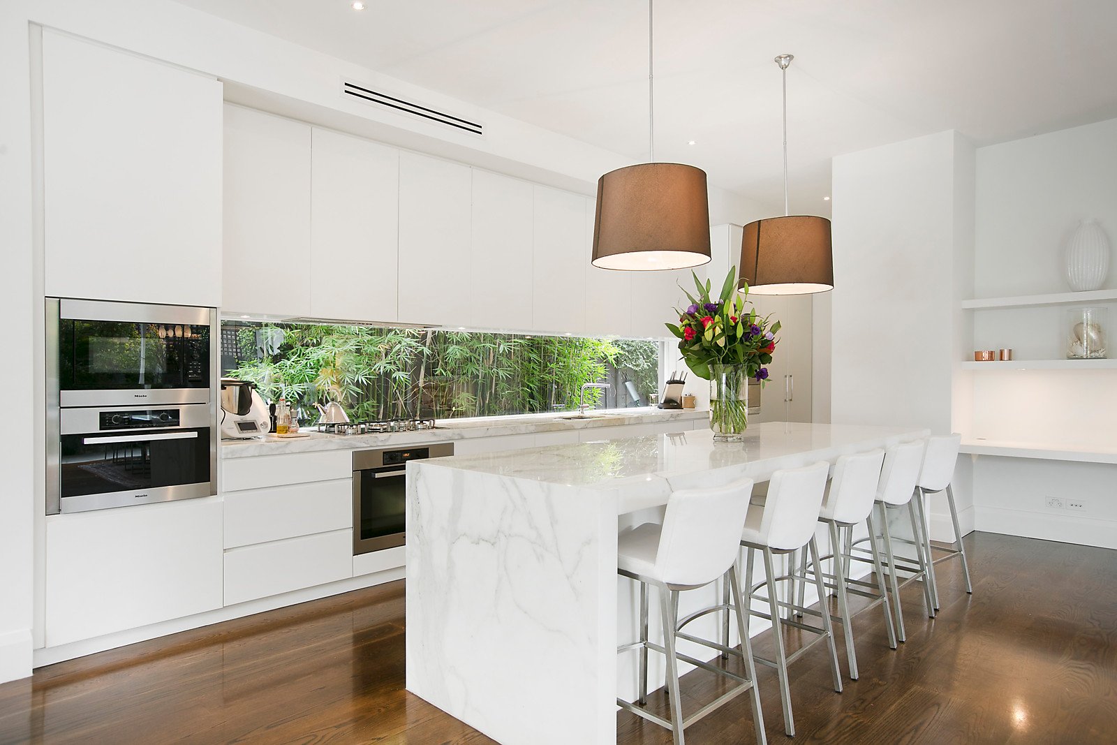 With a superb ambience the impressive proportions of the interior features dark stained timber floors with arched hallway and ceiling roses opening to a formal sitting room with bay window, two downstairs bedrooms, both with ensuites and main with WIR plus three additional upstairs bedrooms with bath and powder rooms; downstairs powder room, laundry, study and wine room. A state-of-the-art kitchen with calacatta marble benches, Miele and Smeg appliances plus an expansive family domain with floor-to-ceiling and picture windows flows to a northern, covered alfresco dining area, easy care garden and pool with sun deck. Other features include video intercom, alarm, zoned ducted heating, cooling and vacuum, marble OFPs, solar panels, remote 3 car garage with rear lane access via Hawthorn Grove.