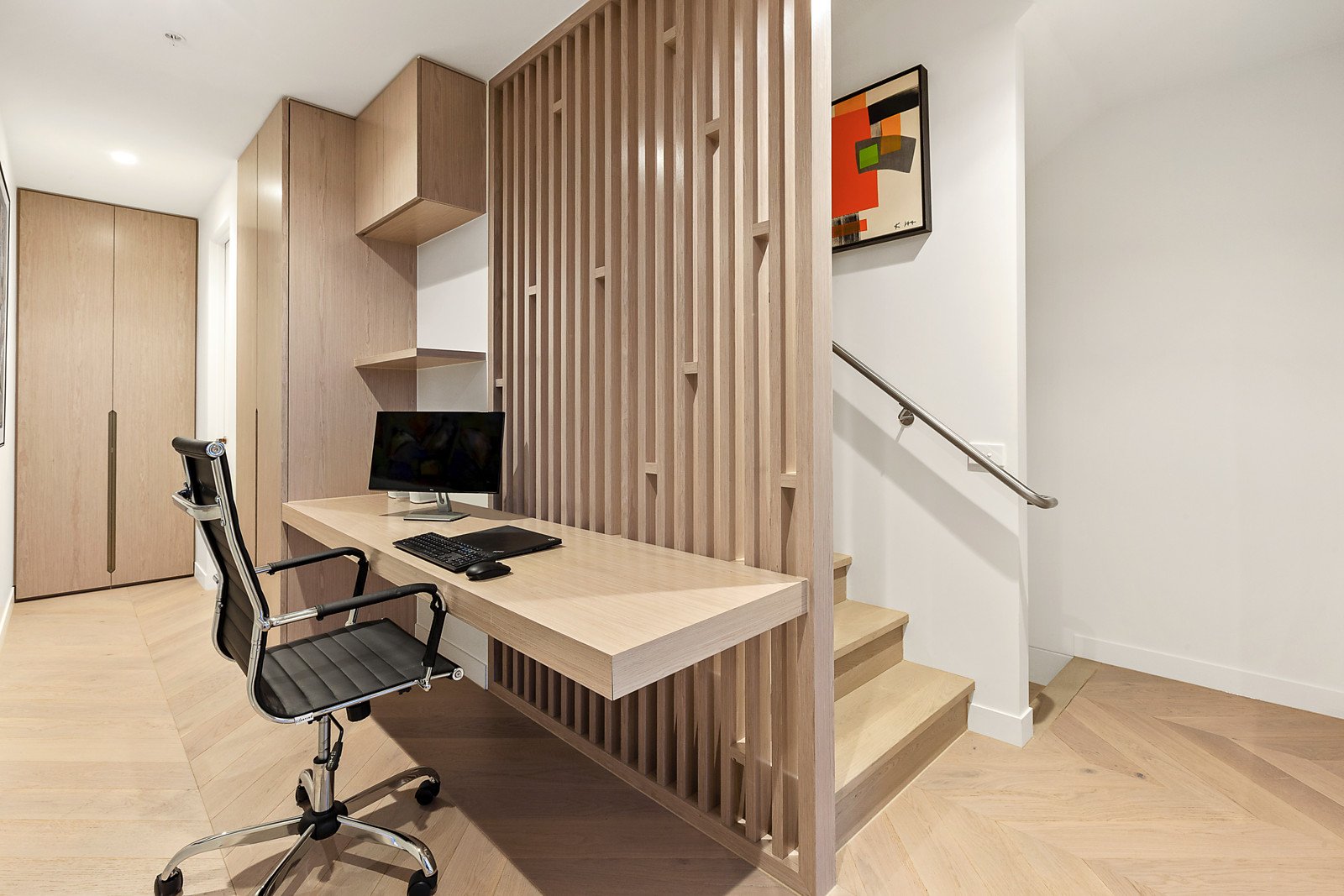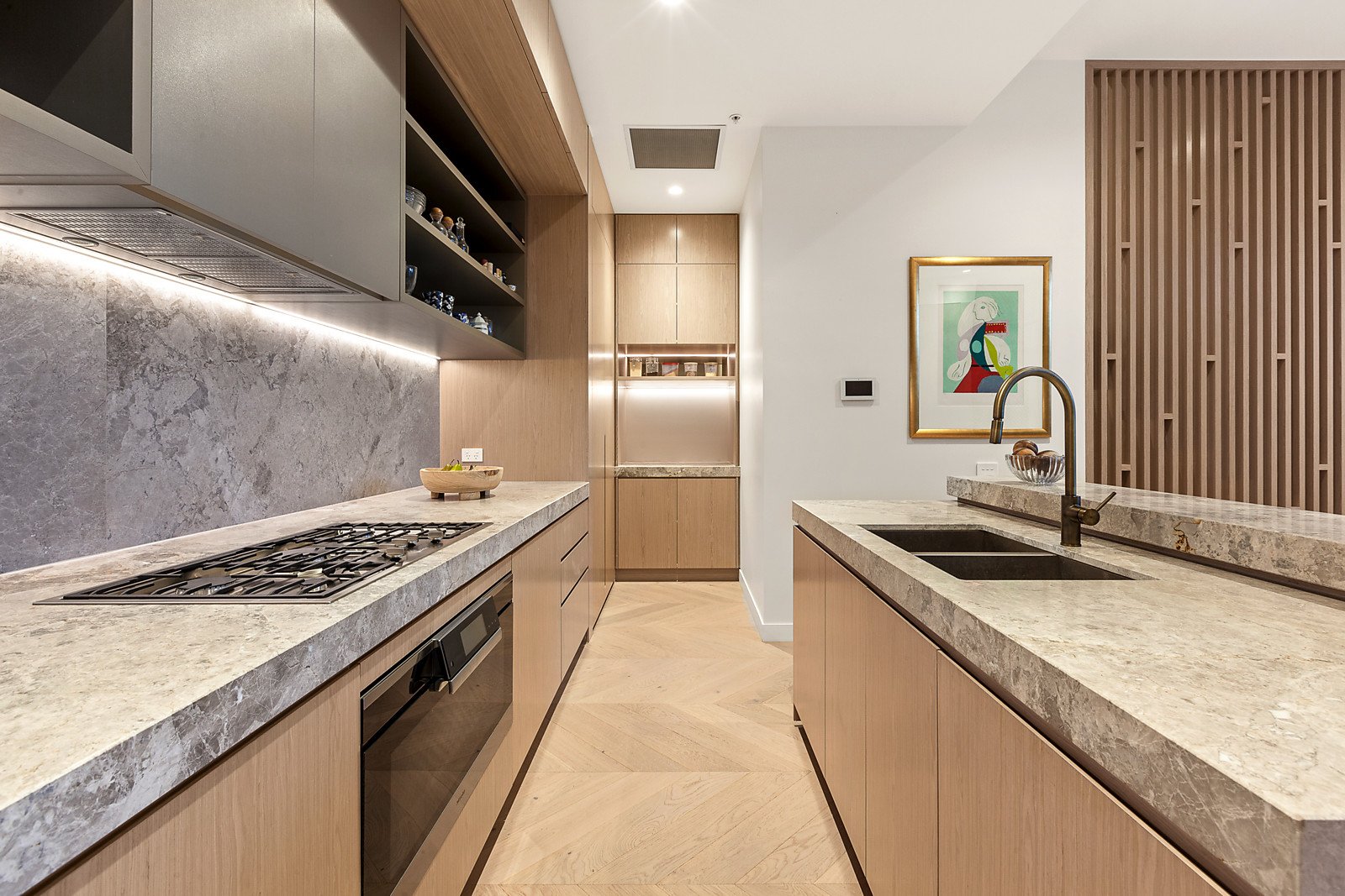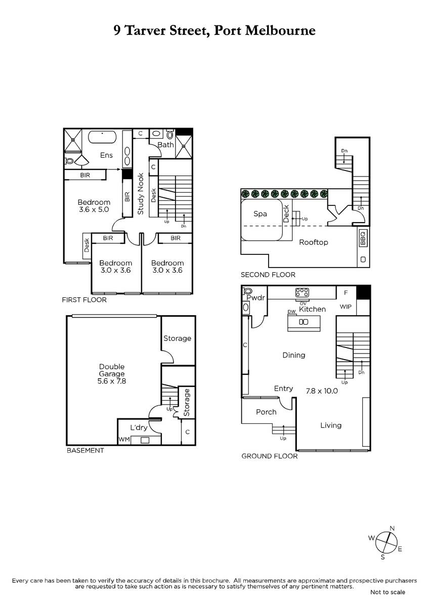 Soaring ceilings and American oak parquetry floors introduce spacious open plan living and dining featuring an entertainers kitchen comprising marble island bench with breakfast bar and Miele appliances including 900mm cooktop and oven, integrated dishwasher plus built in cocktail bar. First floor living environs cleverly appoint three bright bedrooms with built in robes, main with study nook and double vanity stone en suite showcasing a walk in rainfall shower and freestanding bath. An outstanding home office space is built into a generously sized landing complemented by a modern central bathroom. The second floor showcases an unrivalled alfresco entertaining rooftop enjoying sweeping views of Port Melbourne with built in barbeque, outdoor kitchen sink and 8 person spa.