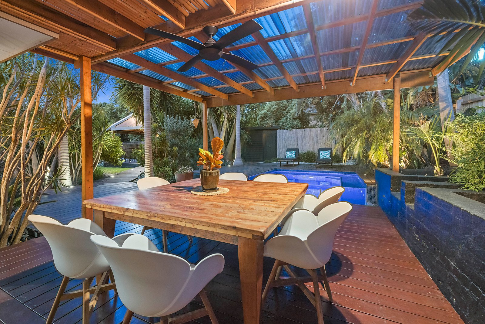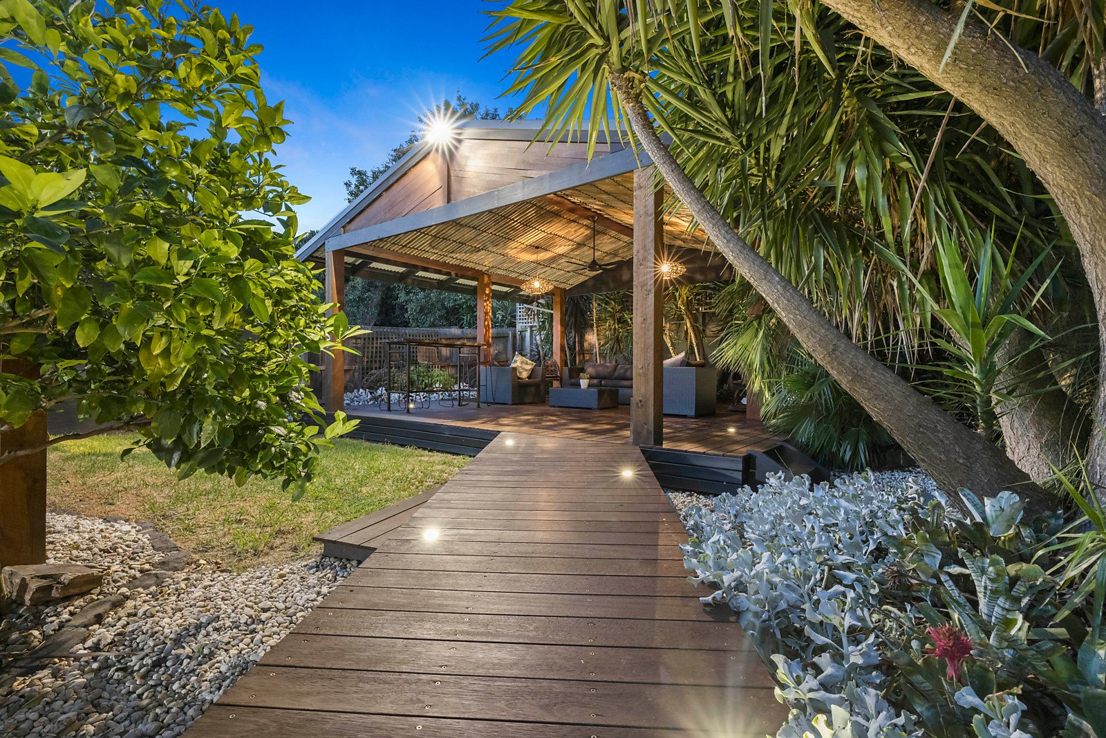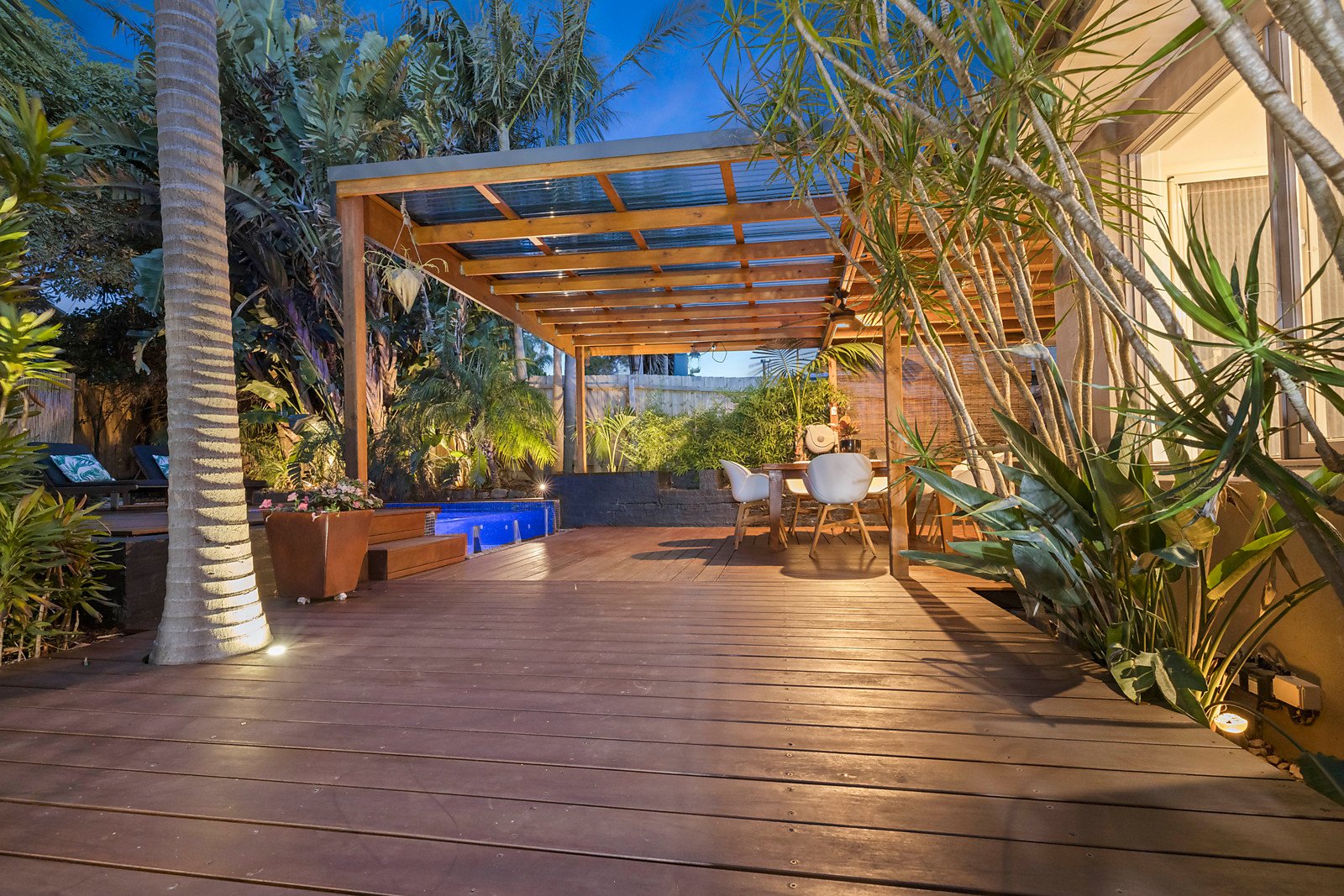 Feature-lit tropical-themed gardens, a glass-edged plunge pool/spa and two covered alfresco entertaining areas offer the ultimate in year-round outdoor relaxation, while inside three living areas guarantee a space to suit every mood or occasion.