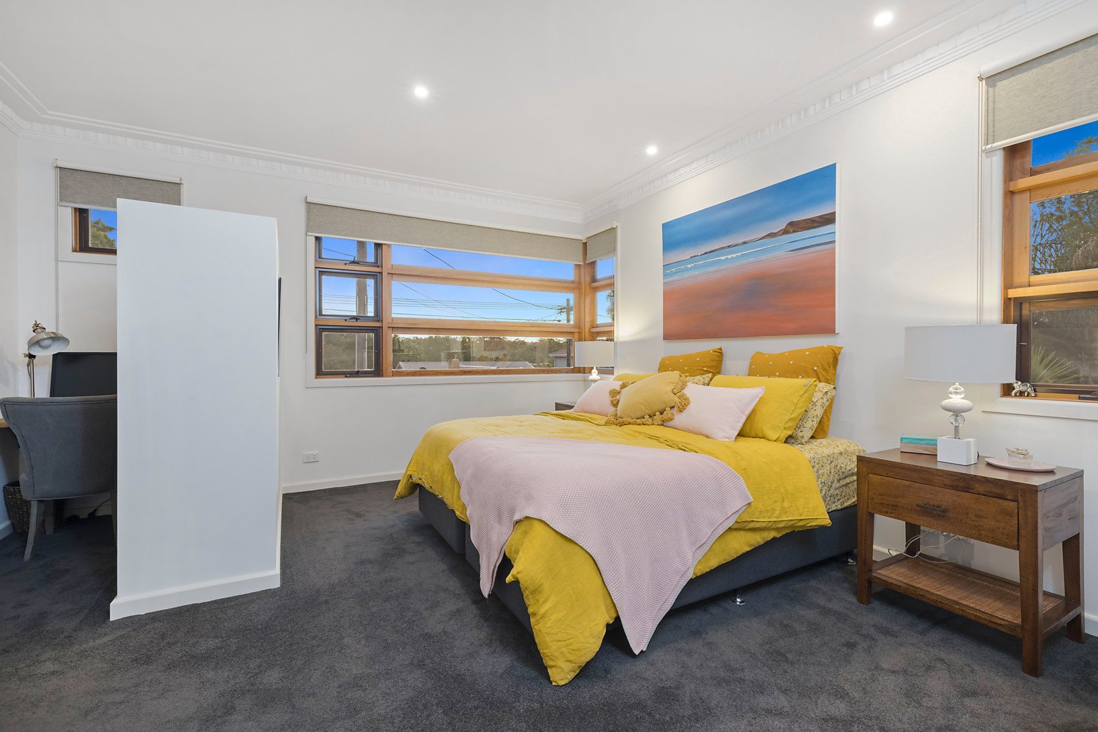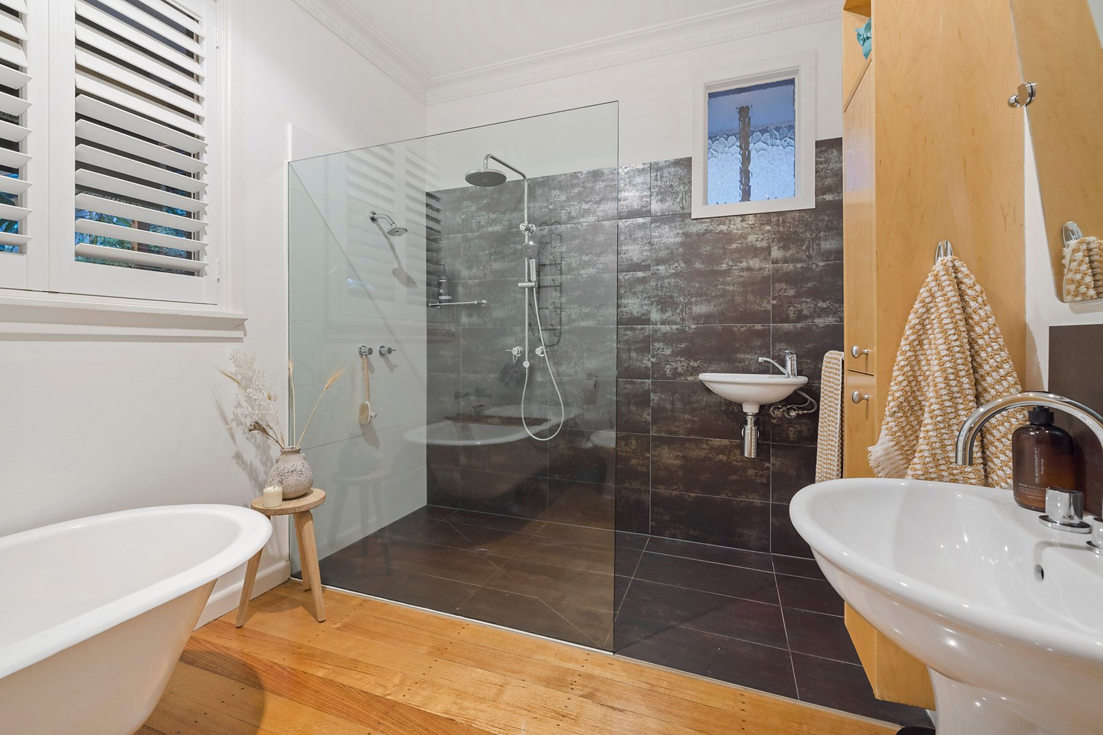 Parents enjoy a large bedroom with study area, fitted walk-in robe, ensuite and separate powder room, a guest bedroom also has an ensuite and two other bedrooms are served by the family bathroom with claw-foot bath and walk-in shower.