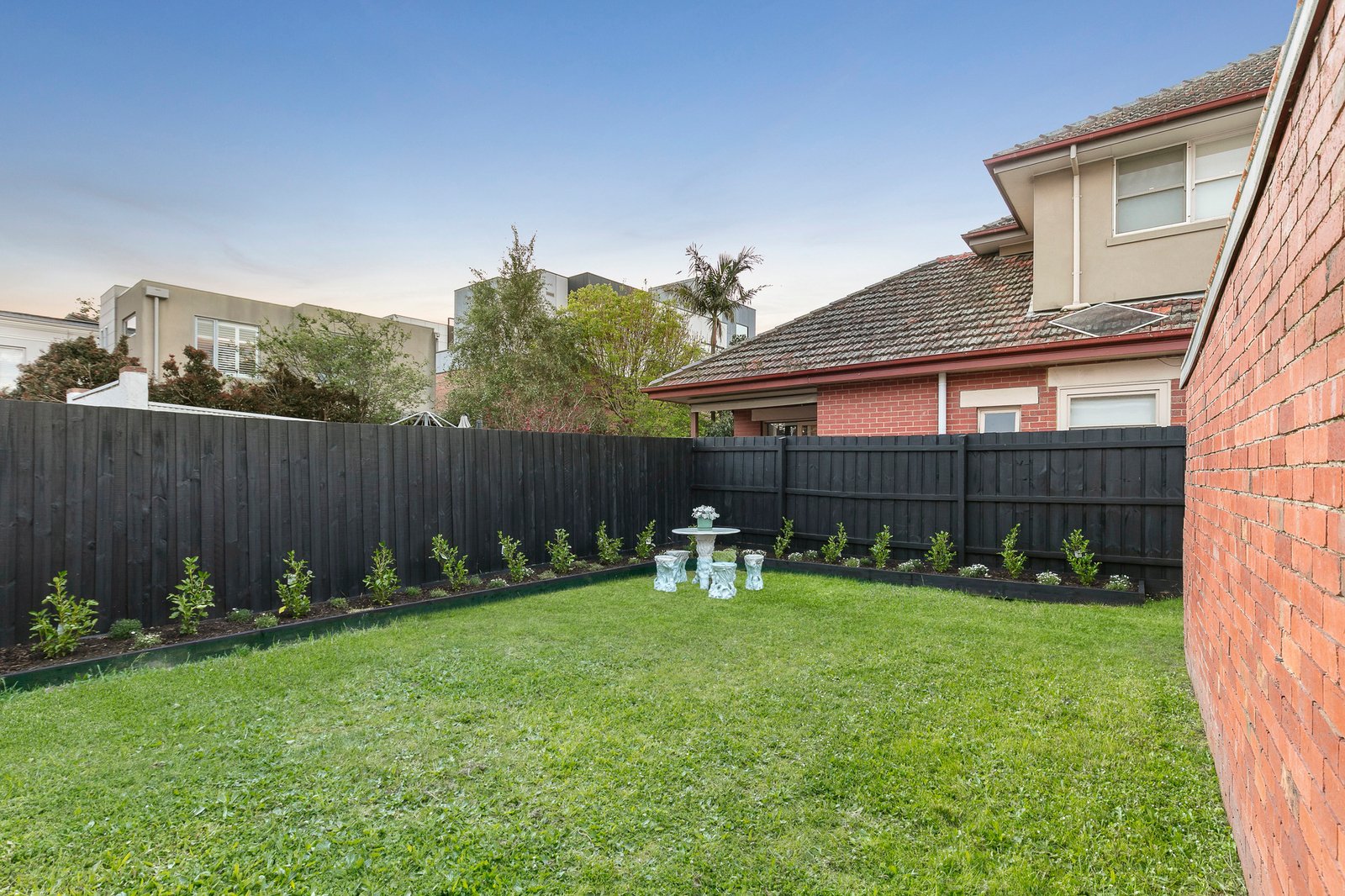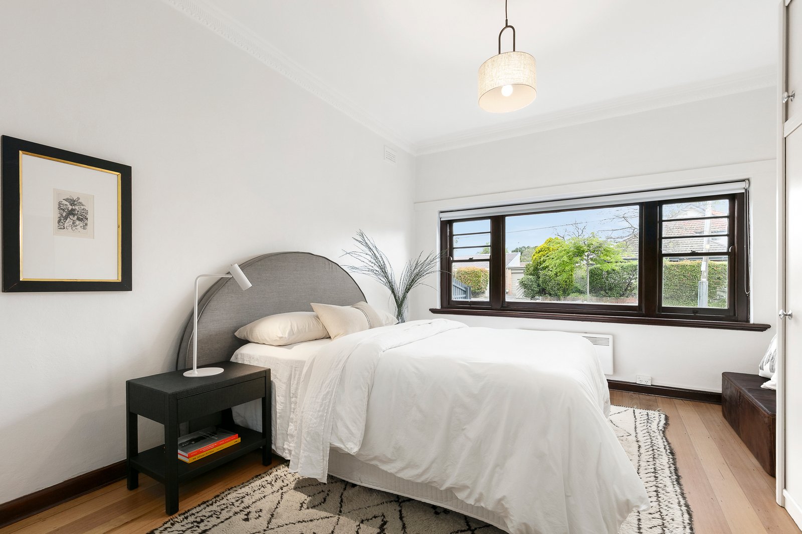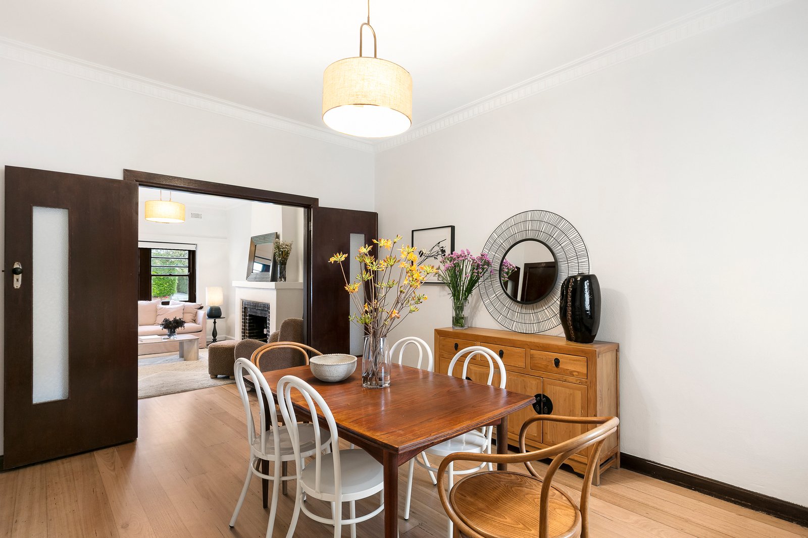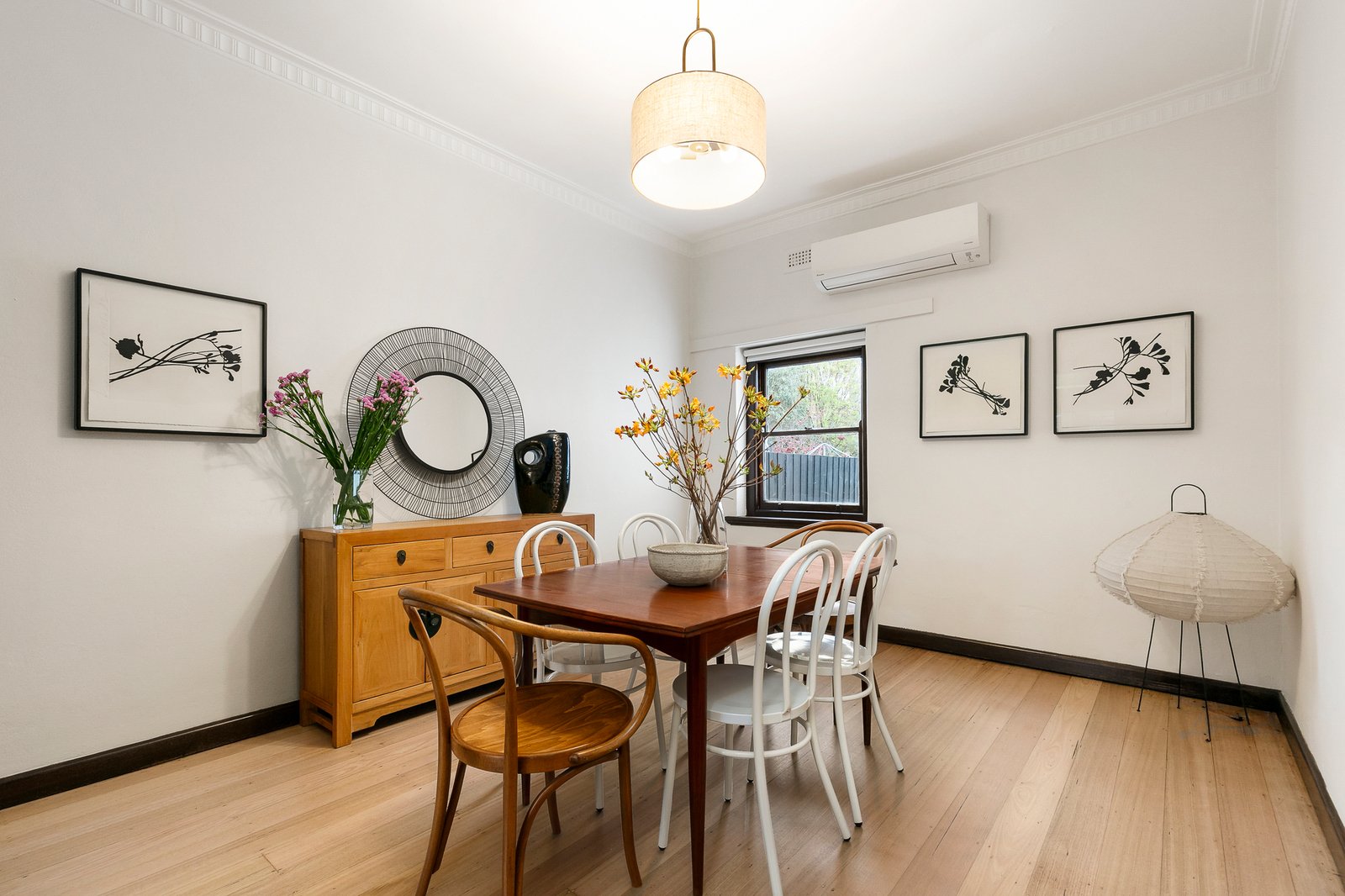 The rich character of the high ceilings and timber detailing is complemented by pale timber floors in the wide entrance hall, generous living room with an open fire and the light-filled dining room. A separate gourmet kitchen appointed with stainless steel appliances and stone benches leads out to the private north-facing garden surrounded by landscaped greenery. The two double bedrooms are accompanied by a stylish bathroom.