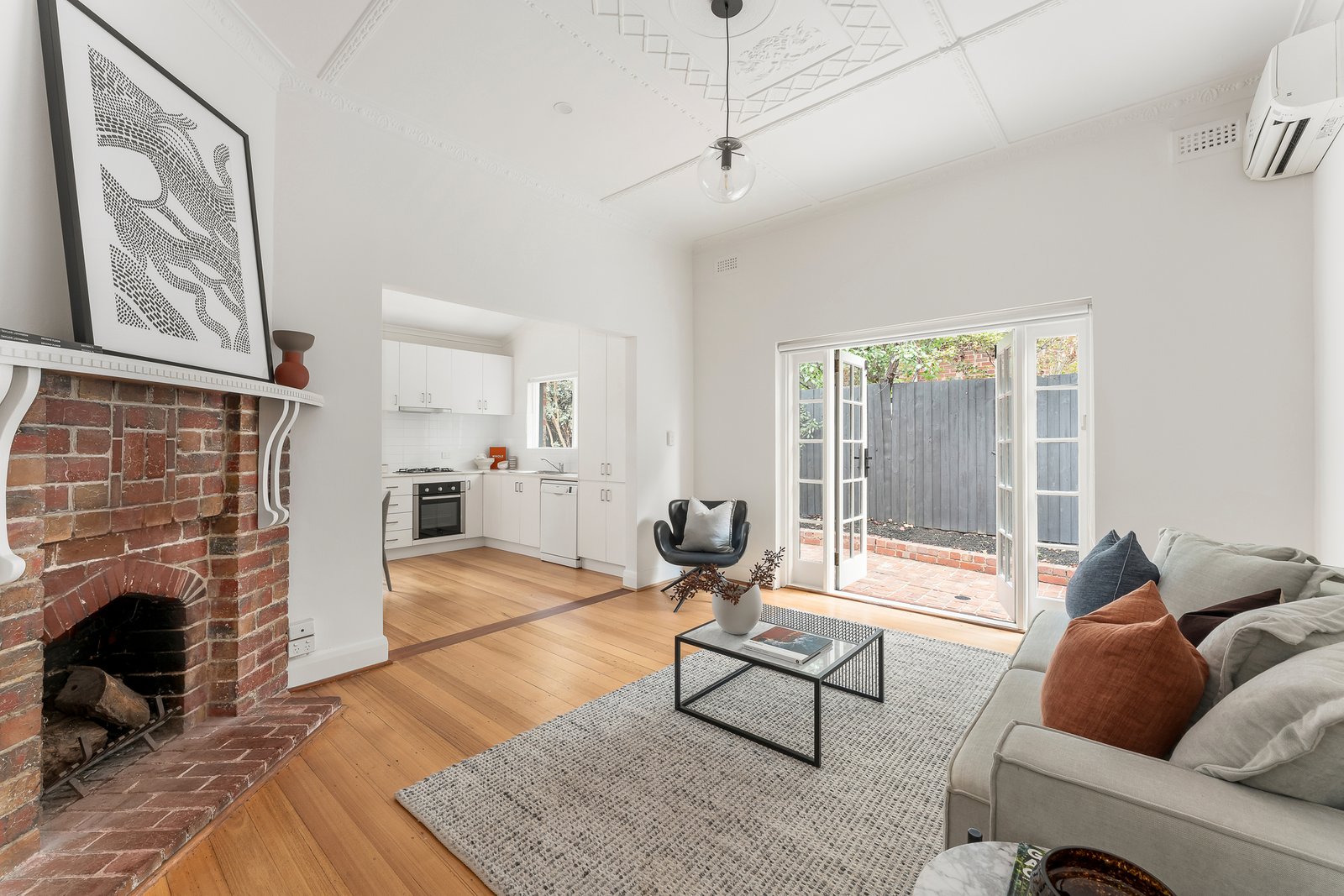 A meandering path leads to the classic L-shaped entrance hall featuring ornate ceiling and timber floors. The gorgeous main bedroom, leadlight bay window and built in robe and a second double bedroom with built in robe share a stylish bathroom with Euro-laundry. Northern light streams through the generous living room with French doors opening to a north-facing terrace. The timber floors continue through the inviting dining area and gourmet kitchen appointed with stone benches. The dining area steps out to a glorious private paved garden with leafy surrounds and a garage accessed via the rear lane.