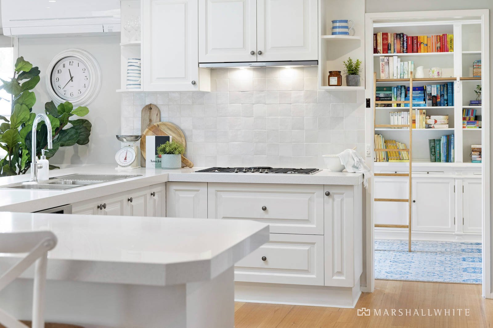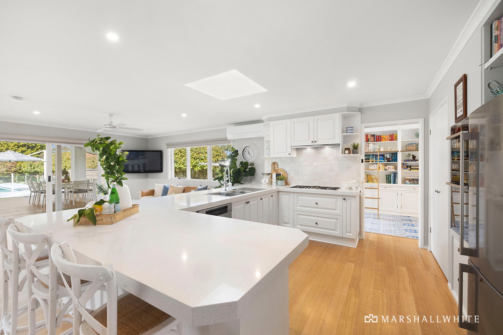 With both formal and informal living areas, there is plenty of space for zoned family living, while an abundance of glazing displays the expansive outdoor spaces including a swimming pool and spa set in pearl-grey limestone surrounds. Headed by a gourmet kitchen with Neff double combi/micro-ovens, Miele gas cooktop and dishwasher, and featuring a Zellige hand-cut tiled splashback, the main open plan connects with the covered alfresco deck via a wall of glass sliding doors. Lights and heating allow for all-seasons enjoyment, as does the electric-heated pool and spa, and two built-in cantilevered shade umbrellas. Extending even further towards the back of the garden is a chicken run, orchard, and raised vegetable beds. Fully fenced with neatly separated areas, ensures child and dog-friendly peace of mind, while two cat enclosures add to the home's pet-friendly offerings.