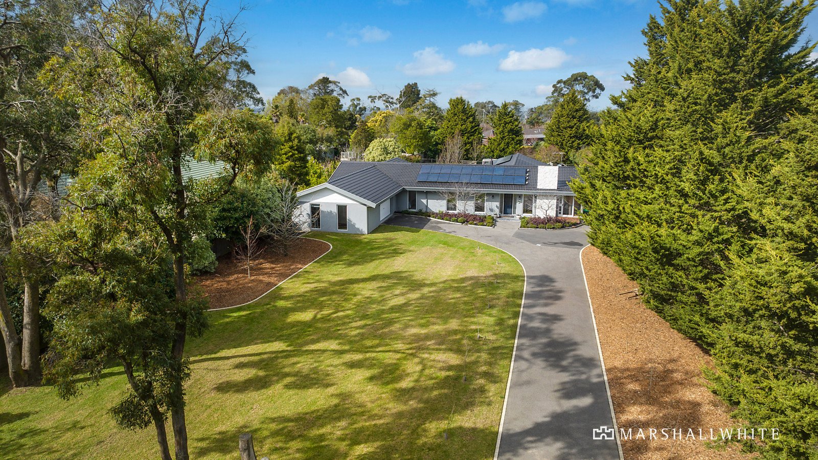 Privately and securely set behind an automated gate, a long, crepe myrtle-lined driveway, edged by a vast manicured front lawn and landscaped borders leads to a turning space at the front of the five-bedroom single-level rendered brick home.