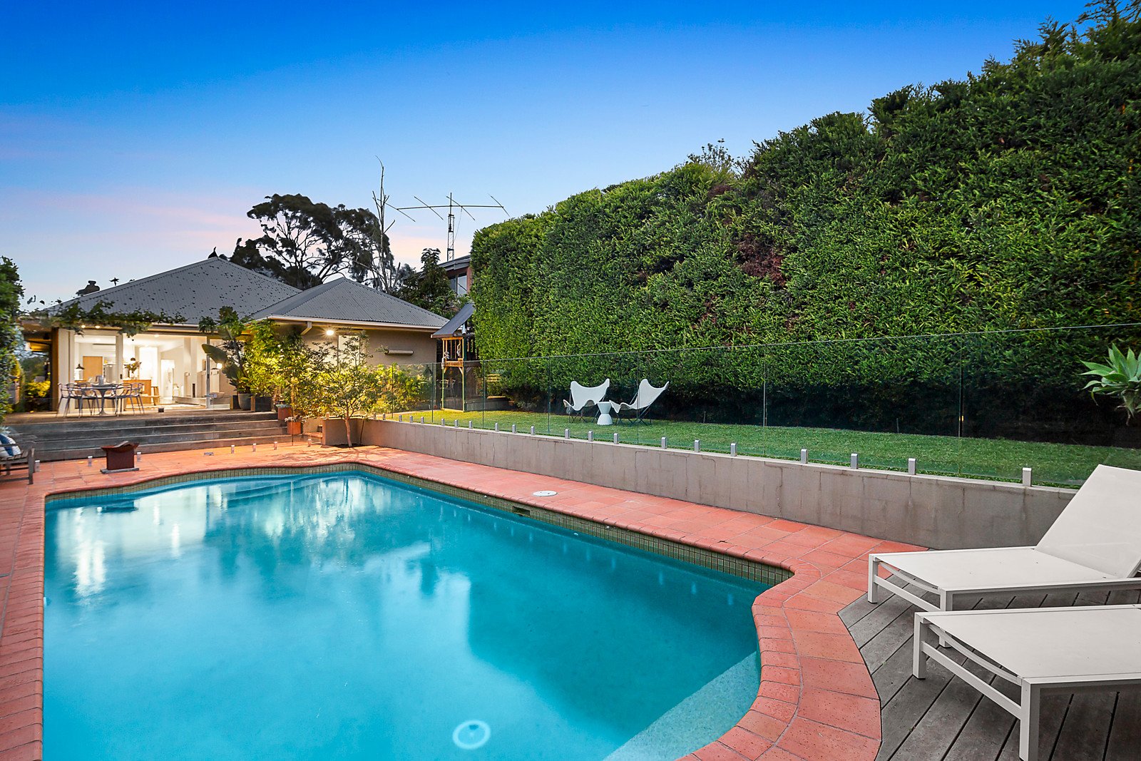 From the dark timber floors to the stylish decor and bespoke oak joinery, the designer's touch is evident immediately. High ceilings add to the sense of space in the wide central hall, inviting sitting room with a gas fire and the spacious home office or 4th bedroom. Spectacular in scale, the generous open plan living and dining room opening to a leafy side deck is served by a stunning gourmet kitchen boasting stone benches, Miele appliances, walk in pantry, built in oak breakfast table and a fabulous fitted study area. The expansive family/media space featuring an open fire and oak cupboards opens to a large deck with plumbed in BBQ overlooking the deep private hedged northwest garden and solar-heated pool. The gorgeous main bedroom with chic en suite and walk in robe is accompanied by a children's wing comprising two additional bedrooms with built in robes and a bathroom.