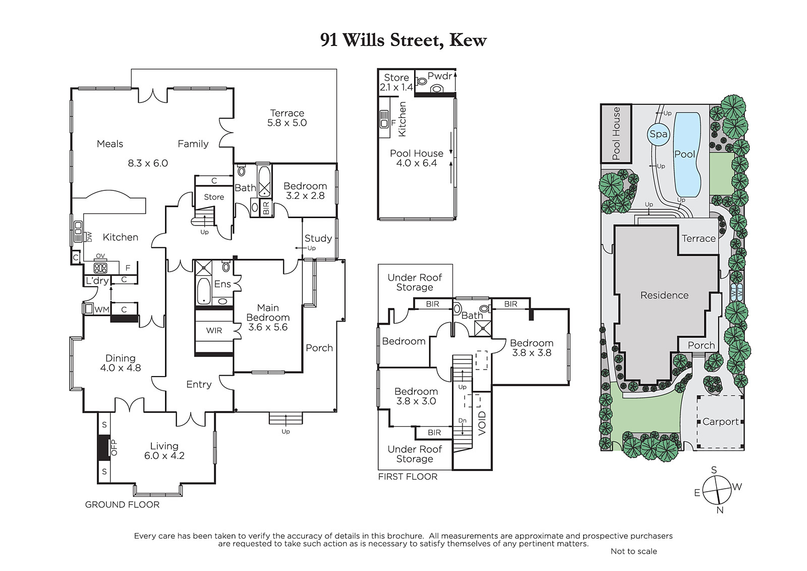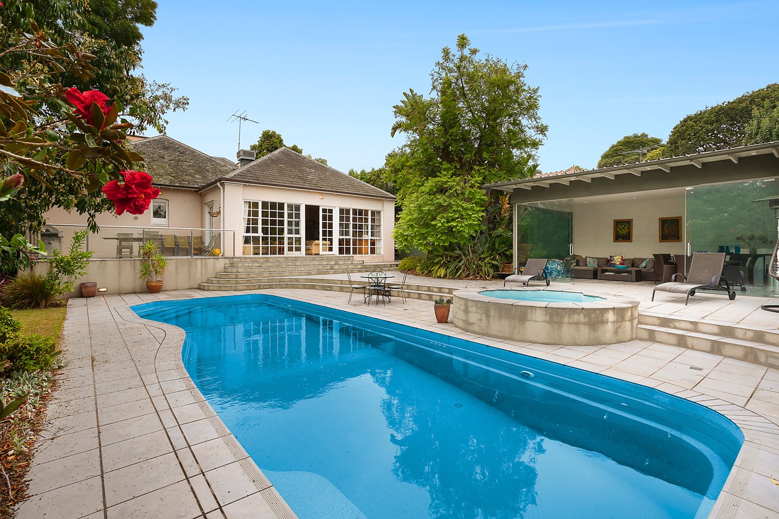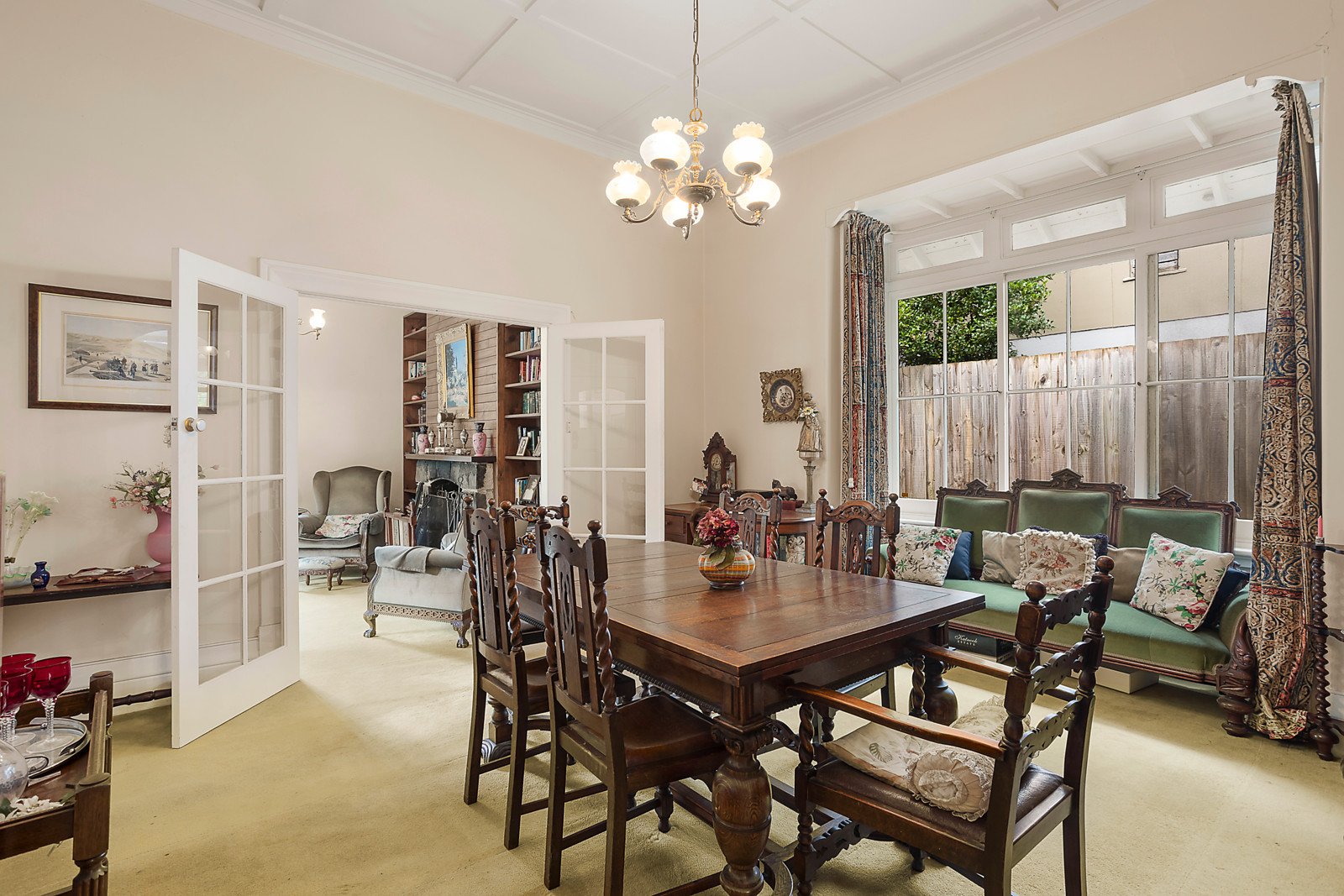 High ceilings and leadlight windows define the period character in the wide central hall, charming sitting room with open fire and elegant formal dining room. A large well equipped kitchen and generous living and dining room open to the private garden with heated pool, spa and a cabana/studio complete with kitchenette and powder-room. The main bedroom with built in robe and en suite, a second bedroom, bathroom and study alcove are downstairs while a children's zone upstairs comprises three double bedrooms with built in robes and a third bathroom.