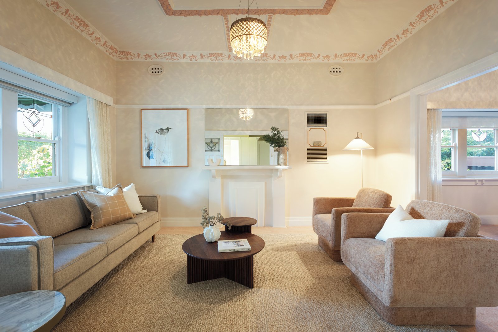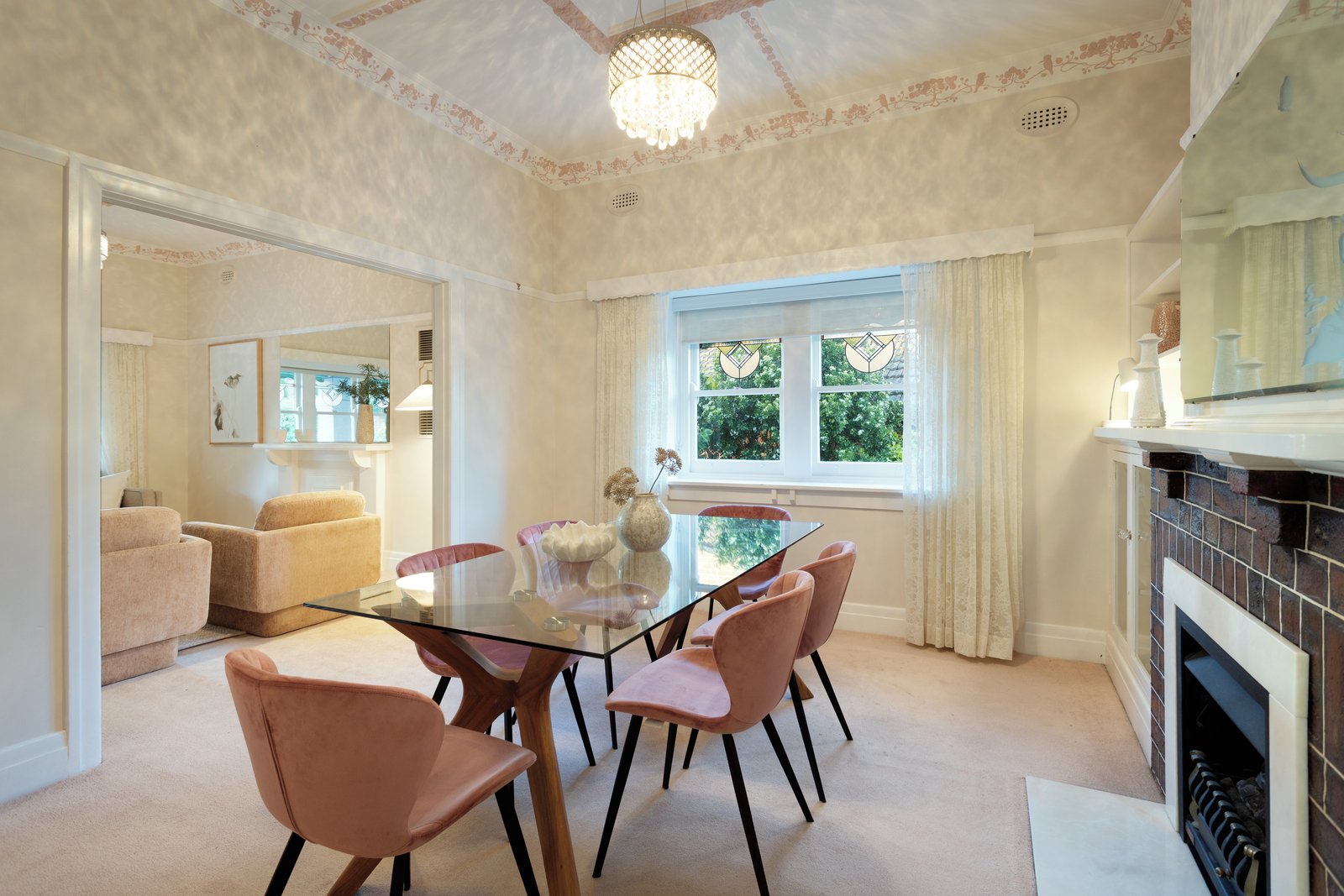 High ceilings, decorative plasterwork, leadlight windows and charming fireplaces highlight the home’s period appeal. A wide entrance hall leads to a formal living room with garden outlook, flowing through to a separate dining room, while the kitchen is well-positioned with adjoining laundry and powder room.