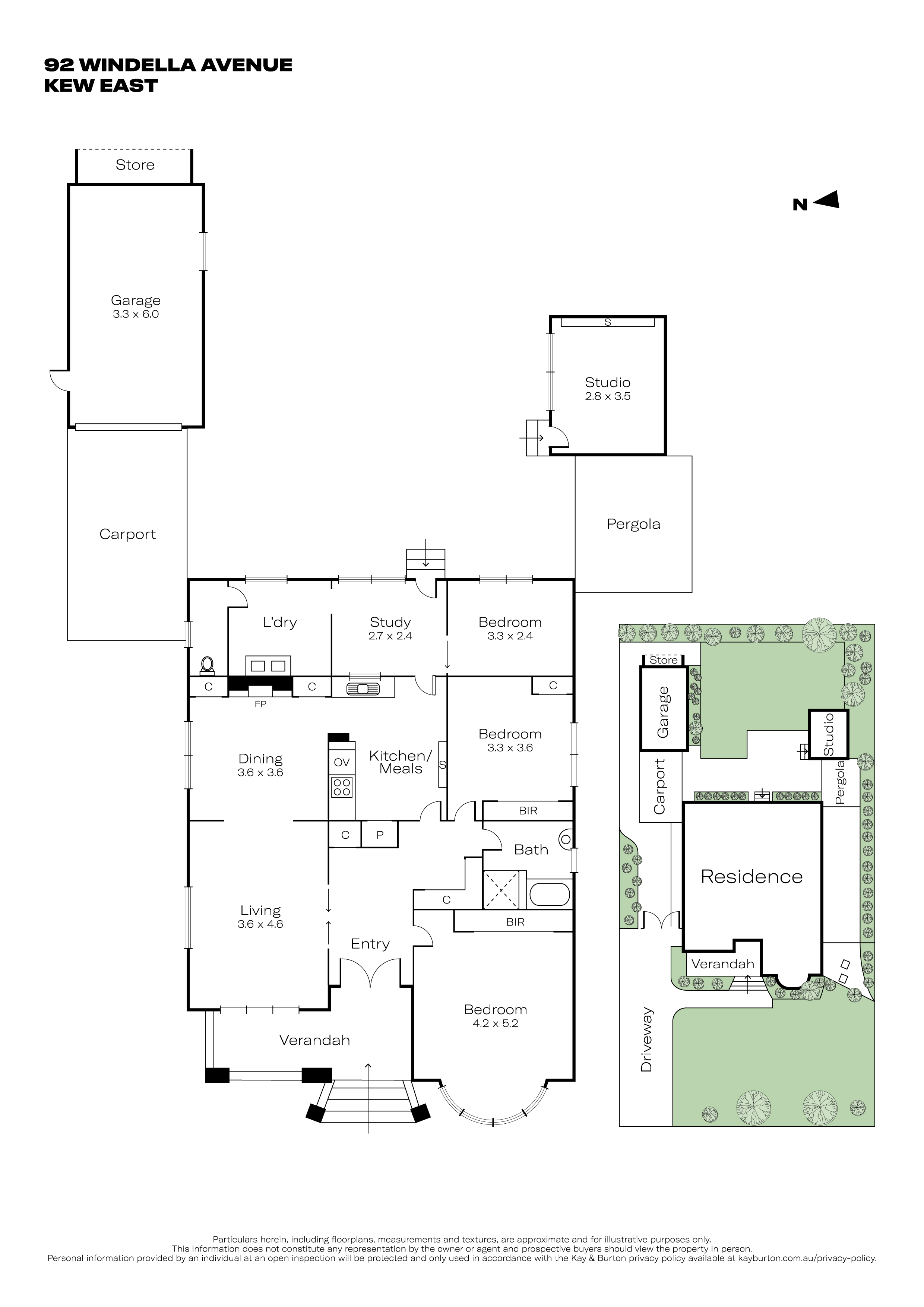 Three well-sized bedrooms include a main bedroom with built-in robes and a bay window overlooking the front garden, all serviced by a central bathroom with separate bath and shower. At the rear, a self-contained studio and outdoor entertaining area add further versatility ideal for working from home, a retreat or additional living space.