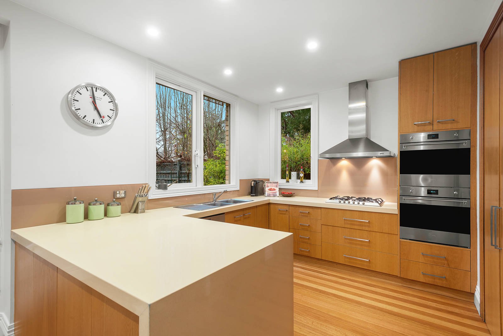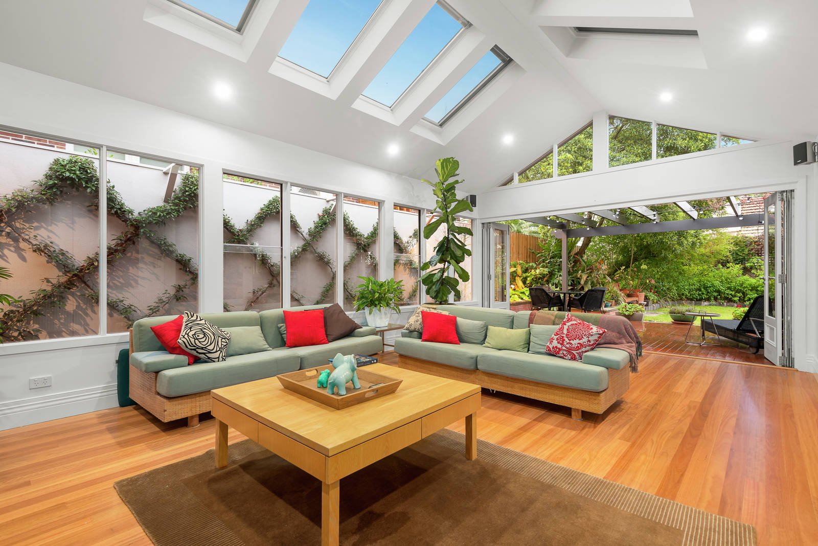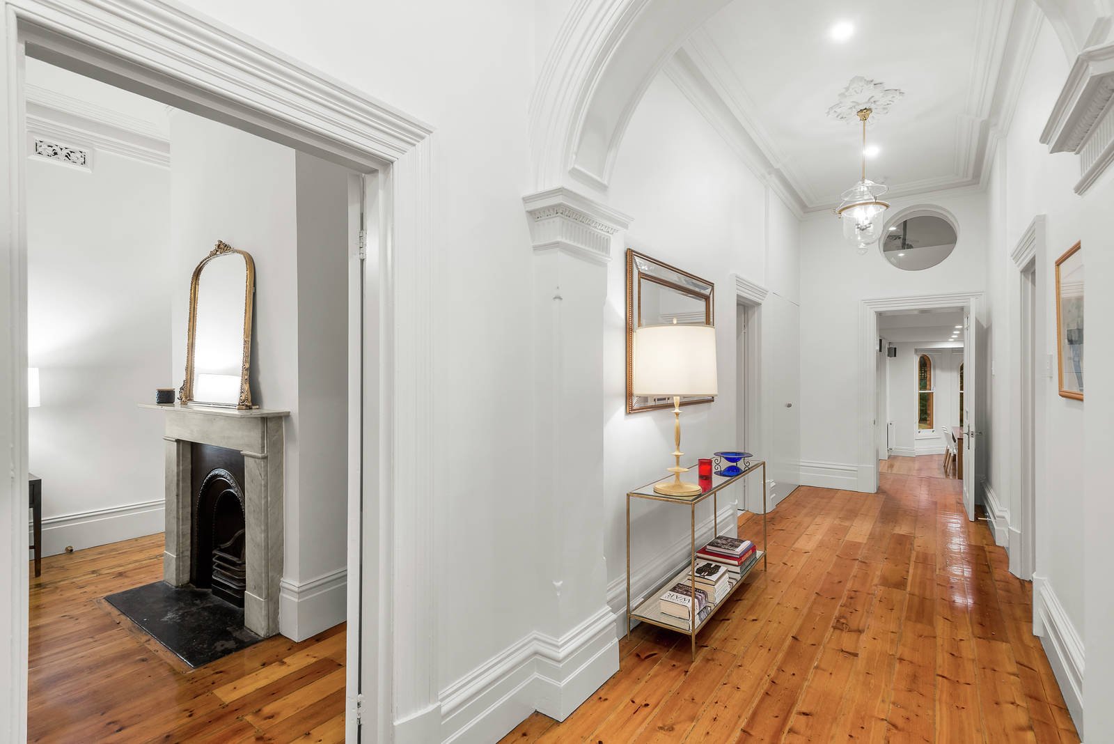 A majestic arched hallway with Baltic pine floors flows through to a gracious formal living and dining rooms both featuring vaulted ceilings, bay windows and marble fireplaces. Timber floors continue through the generously proportioned meals area with study nook and gourmet European kitchen boasting stone benches. Bi-fold doors separate the adjoining conservatory style living room beneath vaulted Velux ceilings. Another set of bi-fold doors opens the living area out to a large deck, pond and the deep private established north-facing garden. Enjoying a peaceful downstairs setting, the main bedroom features an open fireplace, walk in robe and stylish en suite. A fabulous children's zone comprises three double bedrooms with built in robes and desks all served by a family bathroom.