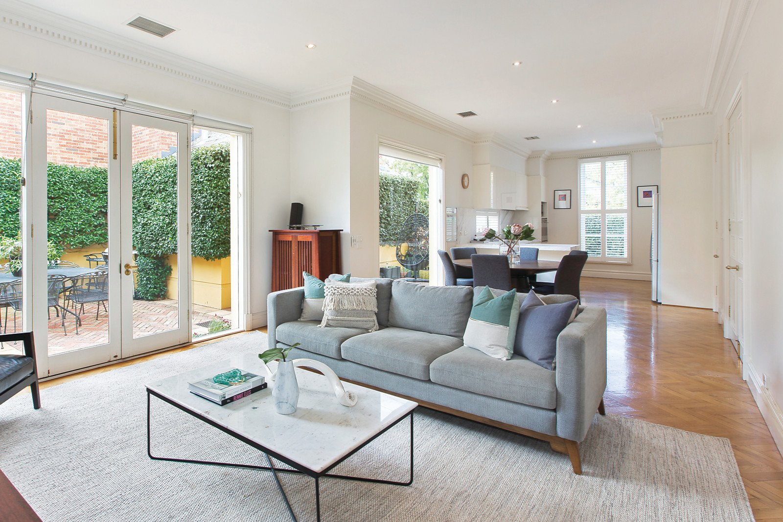 A dramatic double height entrance hall introduces a superbly spacious formal sitting and dining room with a marble gas fireplace. Oak parquetry floors flow through the impeccably appointed gourmet Smeg kitchen with marble benches and a sun-drenched family living and dining room opening to the glorious private north-facing courtyard. Upstairs exceptionally generous accommodation comprises the main bedroom with lavish marble en-suite and walk in robe, two additional double bedrooms with built in robes, a study/4th bedroom and a central family bathroom.