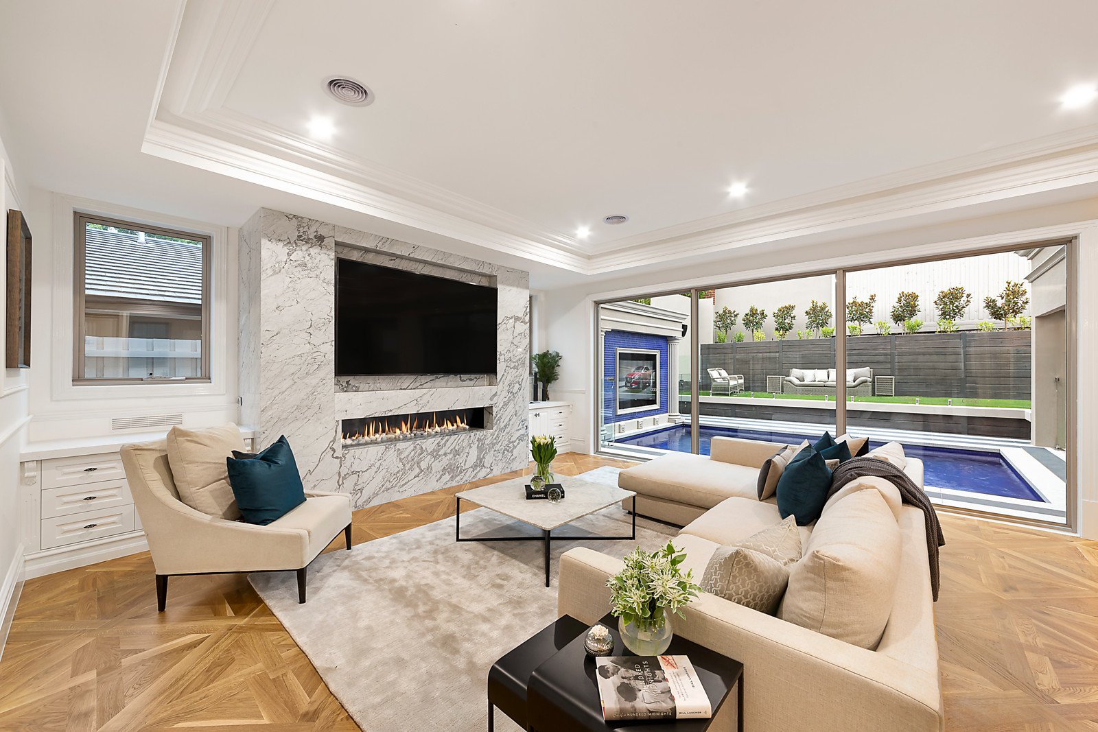 An imposing double door entry reveals a majestic reception hall featuring high ceilings, French wall paneling and oak parquetry floors inlaid with marble. The oak parquetry continues through to an expansive living and dining room with a gas pebble fire and deluxe kitchen appointed with stone benches, Miele appliances, including a steam oven and coffee maker, and a fully equipped butler's pantry. The living extends out to a picturesque private north-facing garden, heated pool with huge TV screen and a sensational covered al fresco terrace with premium BBQ kitchen including an exhaust, sink and outdoor heaters. A fabulous insulated home cinema is fully appointed. The opulent main bedroom with lavish designer en suite, fitted study, retreat and walk in robe sets a benchmark in luxury that is matched by three additional bedrooms with walk in robes and stylish en suites, a large rumpus room and a downstairs guest bedroom with walk in robe and en suite.