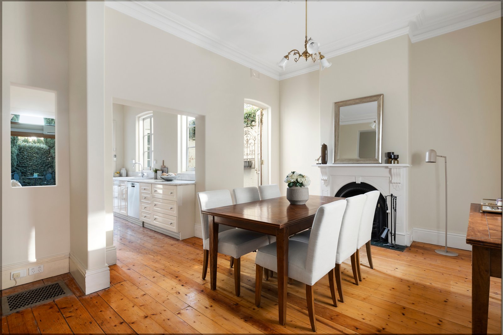 The traditional arched hall replete with ornate high ceilings and Baltic pine floors flows through to an elegant dining room with open fire and a light-filled gourmet kitchen appointed with marble benches and European appliances. A vaulted ceiling accentuates the sense of space in the generous living room opening through bi-fold doors to a private west-facing decked courtyard with rear pedestrian access. A charming home office or 3rd bedroom with open fire on the ground level is matched upstairs by the beautiful main bedroom with full width balcony and fireplace, a second double bedroom with fireplace and a lavish bathroom with spa bath.