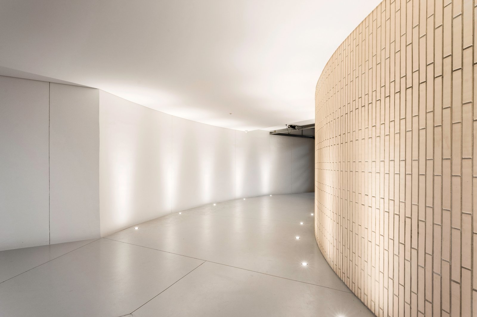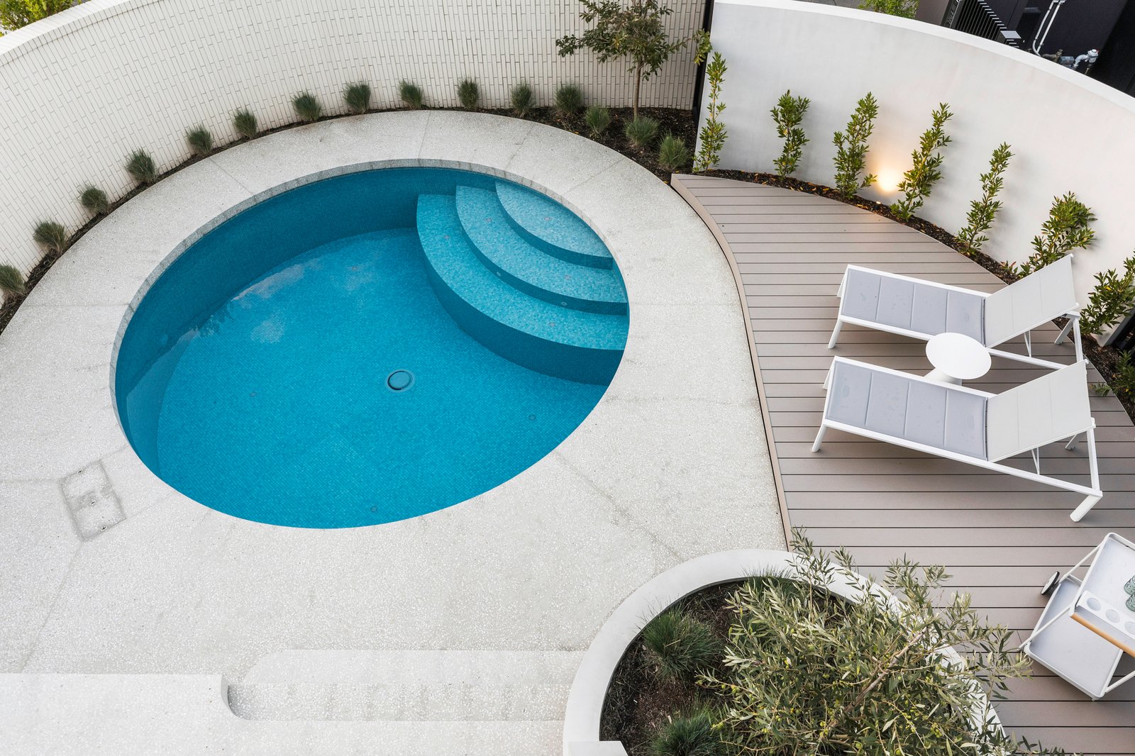 The vast north-facing living and dining zone is centred on a statement fireplace wall of blonde brick and timber panelling. Gliding glass spans the entire frontage, opening to a covered alfresco terrace and a secluded circular swimming pool and relaxation space enclosed by curved brick walls and lush landscaping.