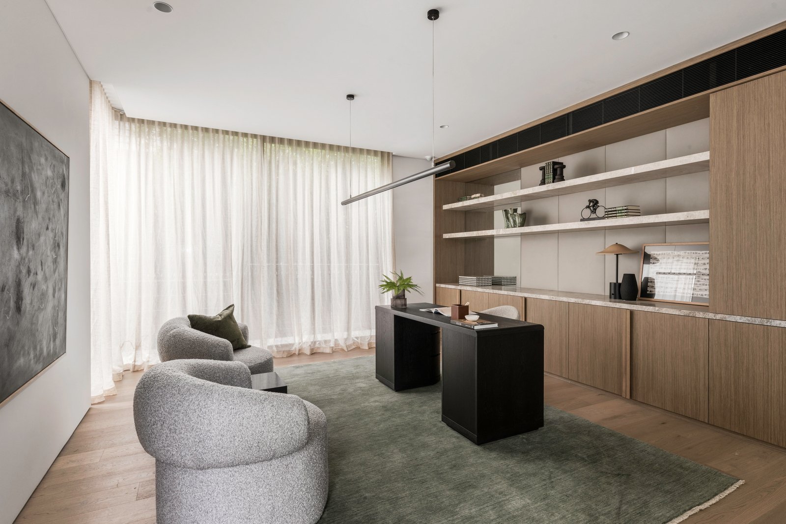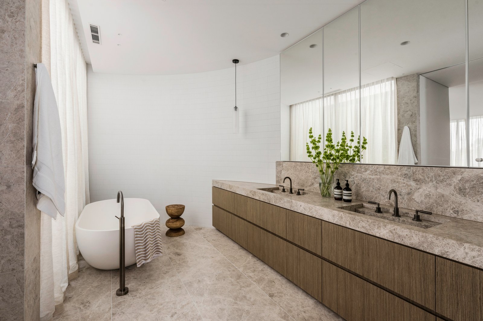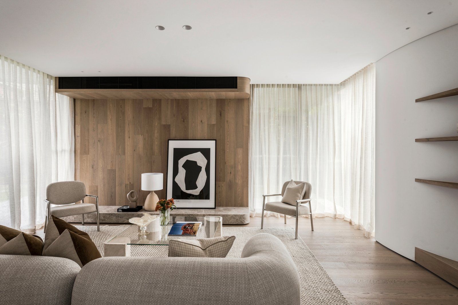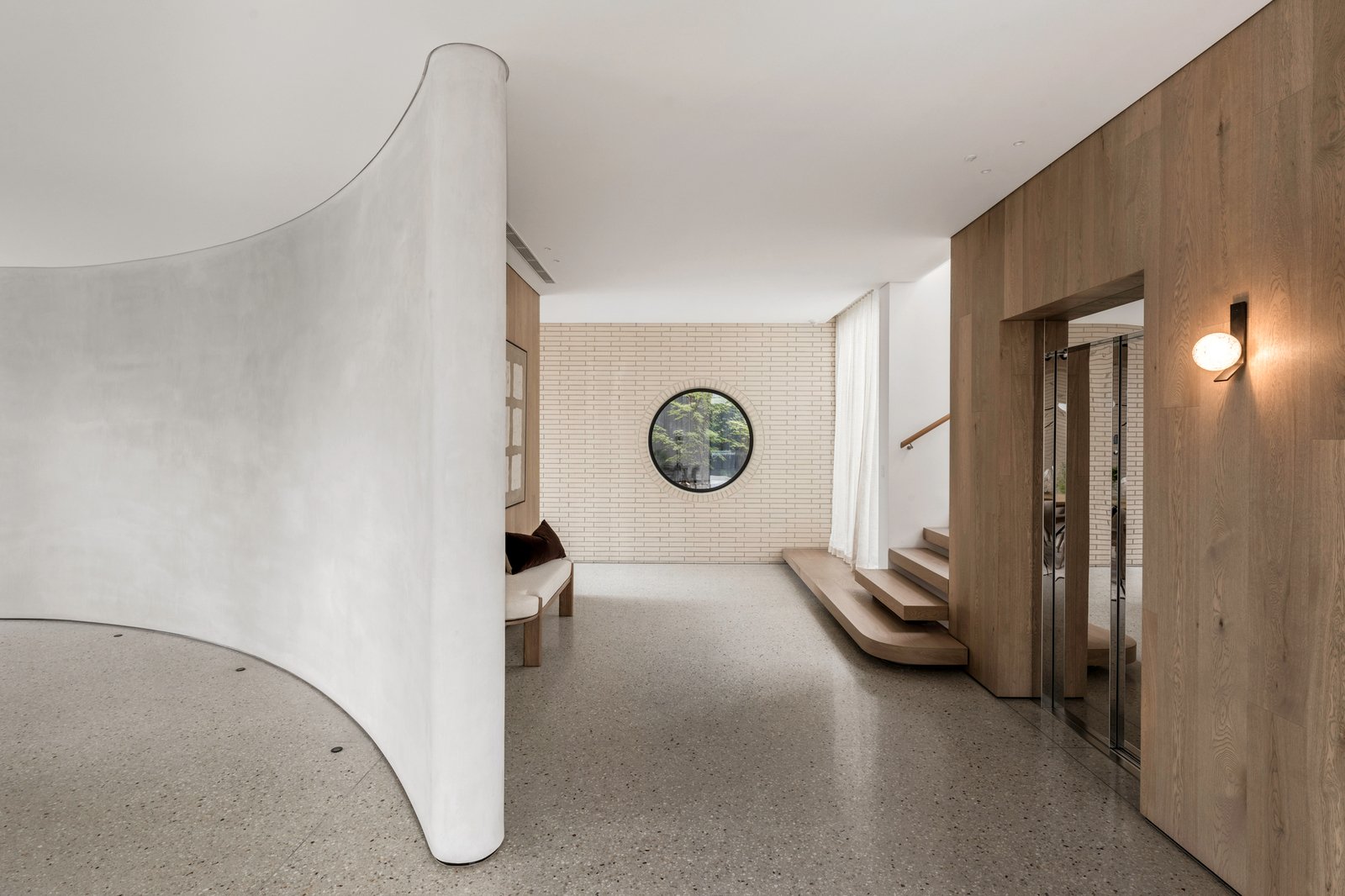 Entry is immediate and arresting. A double-height glazed void and circular porthole window frame the exterior like living artworks. Polished aggregate floors ground a palette of warm oak, natural stone, marble and soft neutral tones, while floor-to-ceiling glazing saturates each room with light, softened by sheer linen curtains.