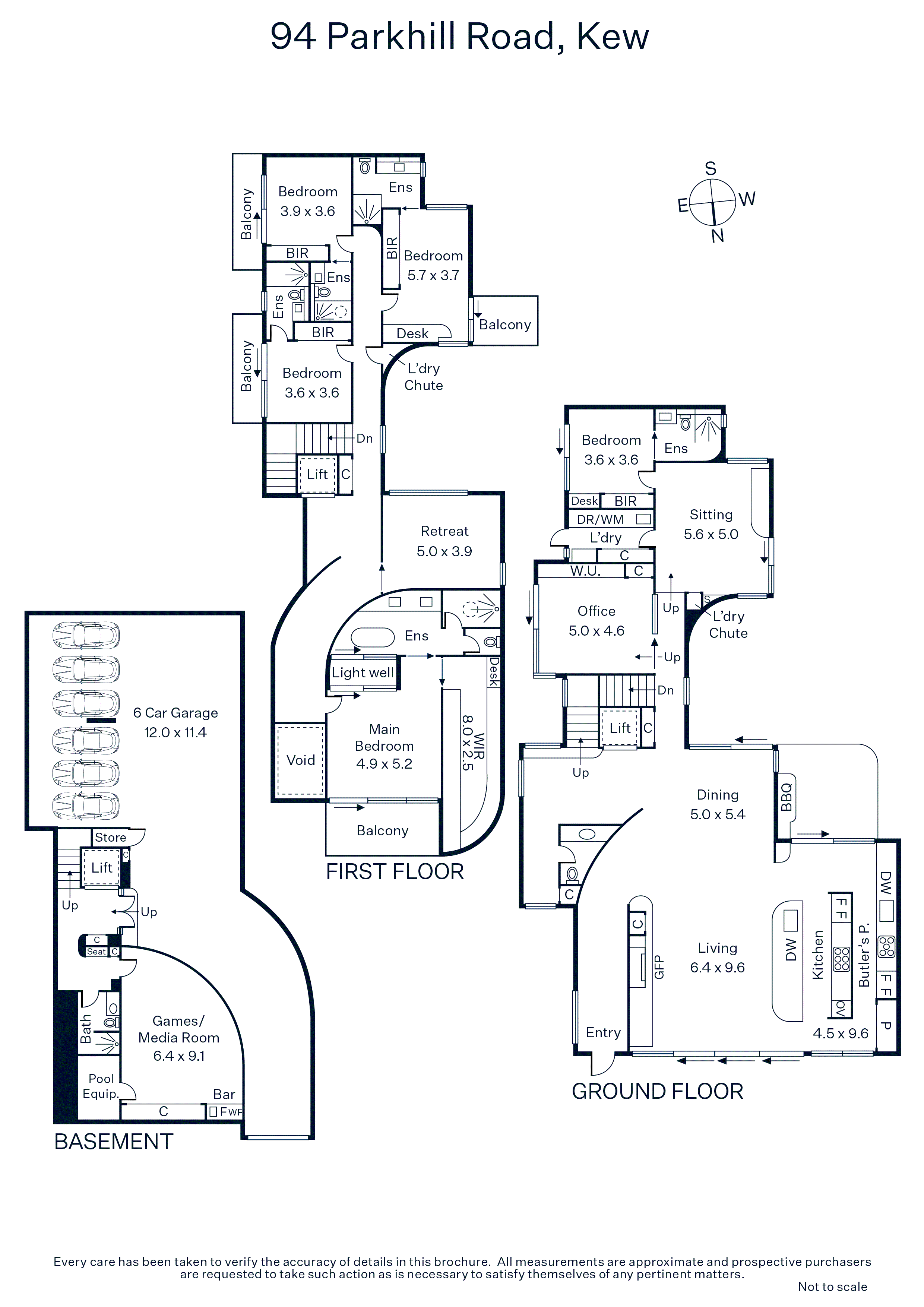 At basement level, a flexible living space with curved walls, marble kitchenette and wine storage offers scope as a media room, teen retreat or home gym, with a wet room and six-car garage providing direct internal entry. Lift and stair access serve all three levels.