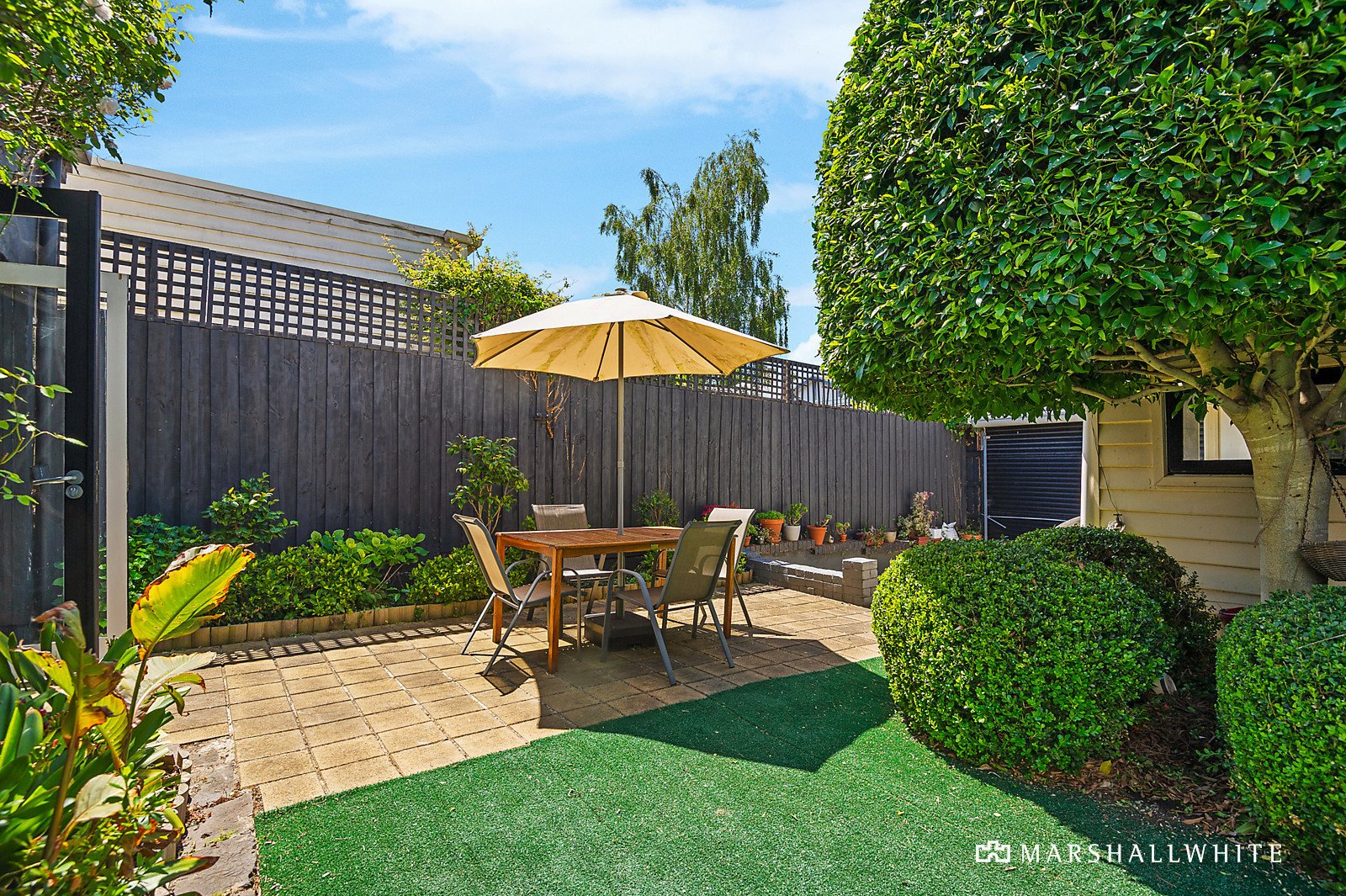 At the rear of the home, a sunny, paved outdoor dining area is wonderfully private and adjacent to a studio/workshop with a jet spa bathroom/laundry. Also features a pristine subway-tiled bathroom, plantation shutters, plenty of added storage and ducted heating.