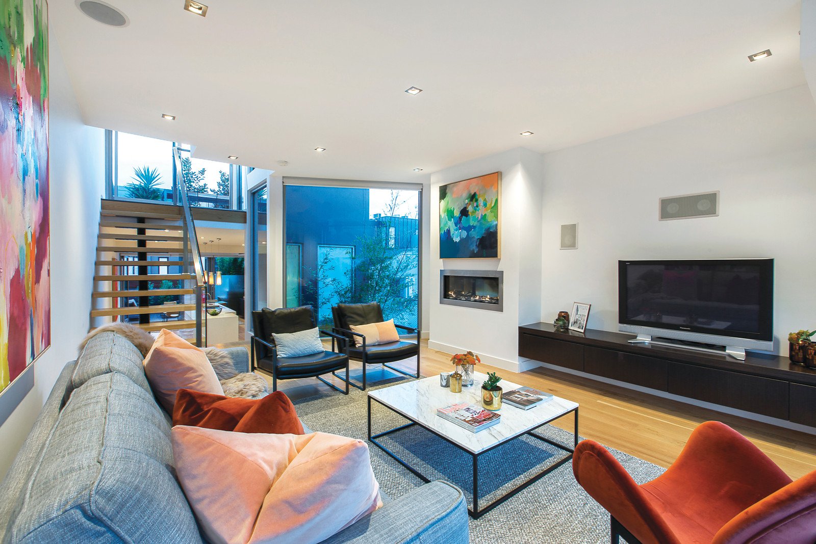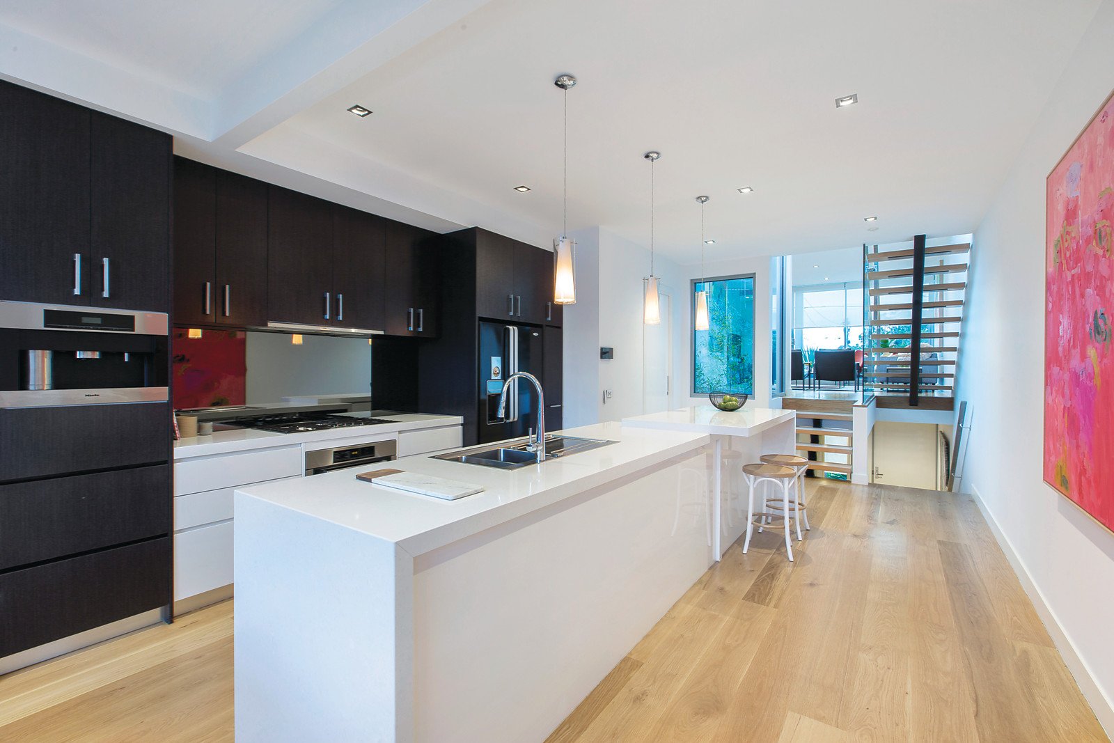 Vast expanses of glass, oak floors and a stunning central light-well create a wonderful first impression through the entrance hall, study or 3rd bedroom, spacious second bedroom with built in robe and stylish bathroom. Serenely set on its own level, the gorgeous main bedroom with built in robe and lavish ensuite with freestanding bath opens to its own decked courtyard. The premium gourmet kitchen boasting Miele appliances including a coffee maker and white stone benches and an inviting dining area opens through bi-fold doors to a private al fresco dining terrace with built in seating. Streaming with natural light, the generous living room with a gas pebble fire opens to a sunny west-facing balcony. The sensational rooftop terrace with built in BBQ commands picturesque city views.