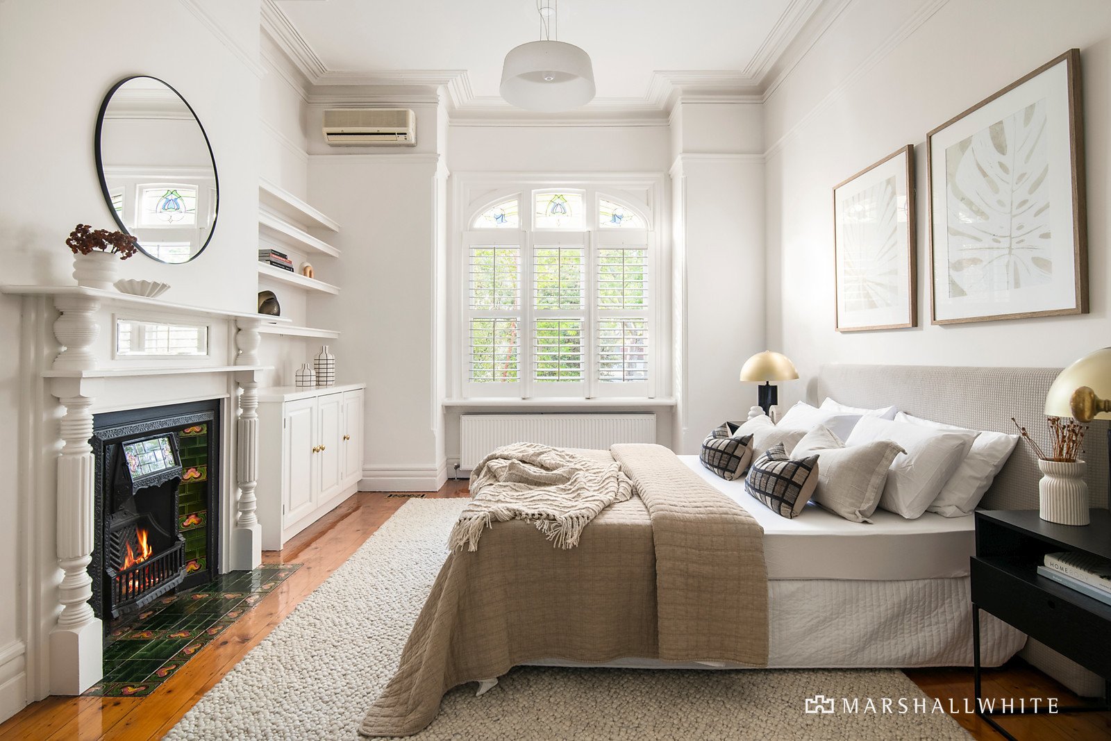 The irresistible appeal is evident immediately with a handsome tuck-pointed facade and vast, sky-lit hallway, where leadlight windows and soaring ornate ceilings merge with a light-filled modern aesthetic. Baltic pine floors and crisp white interiors hint at the modern convergence, welcoming three oversized bedrooms with ornate open fireplaces and built-in storage, including the north-facing main bedroom with a decorative box-bay window.