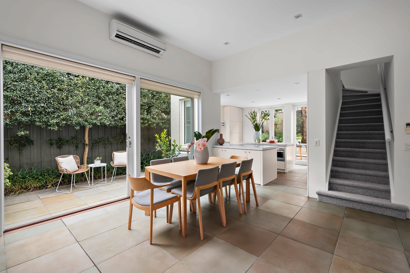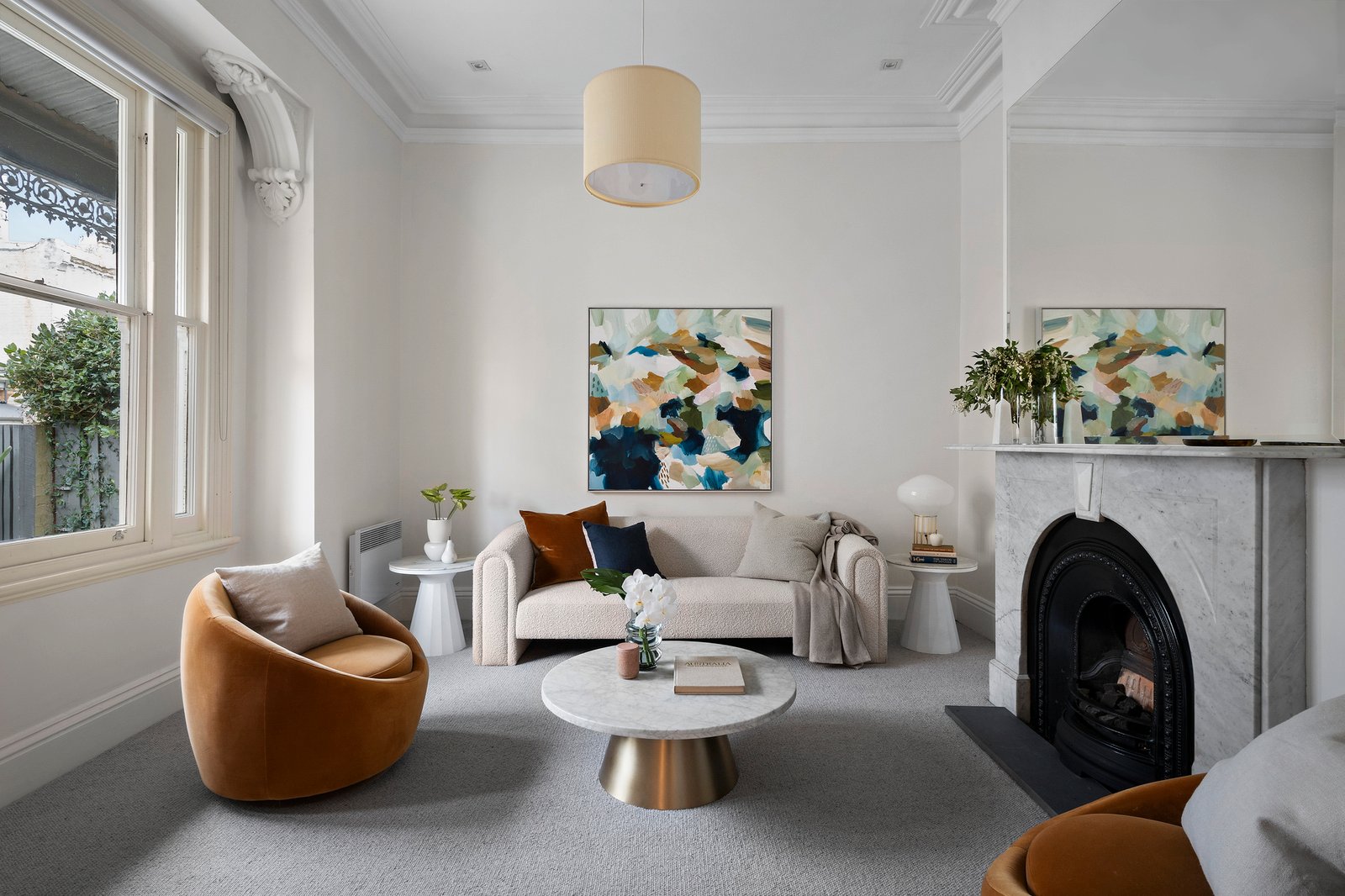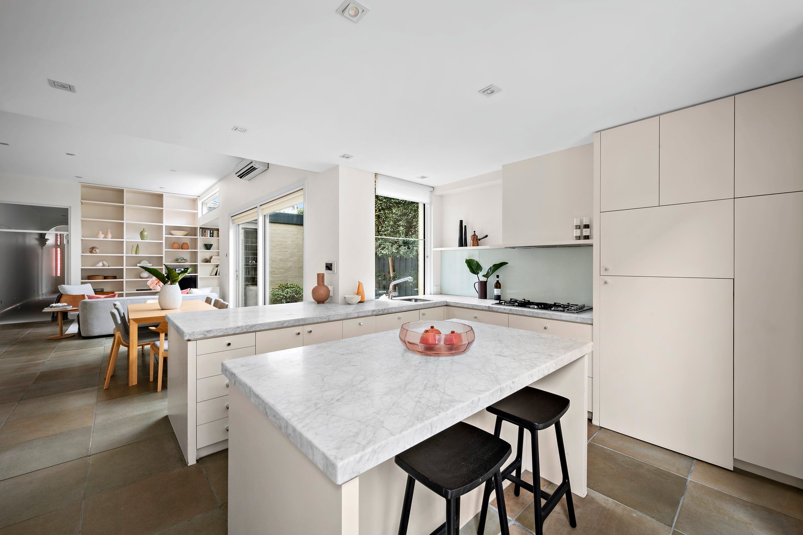 With modern refinement and a lovely garden connection, the home's impressive interior shines with natural light from a north-facing side aspect, introducing a generous sitting room with a gas fireplace rich in period detail and an ensuite bedroom with walk-in robes. The inviting north-facing, double-glazed open-plan living and dining room with a large marble kitchen and ultra-high ceilings opens through French doors to a gorgeous, wrap-around landscaped garden with a private terrace, promoting idyllic indoor-outdoor entertaining.