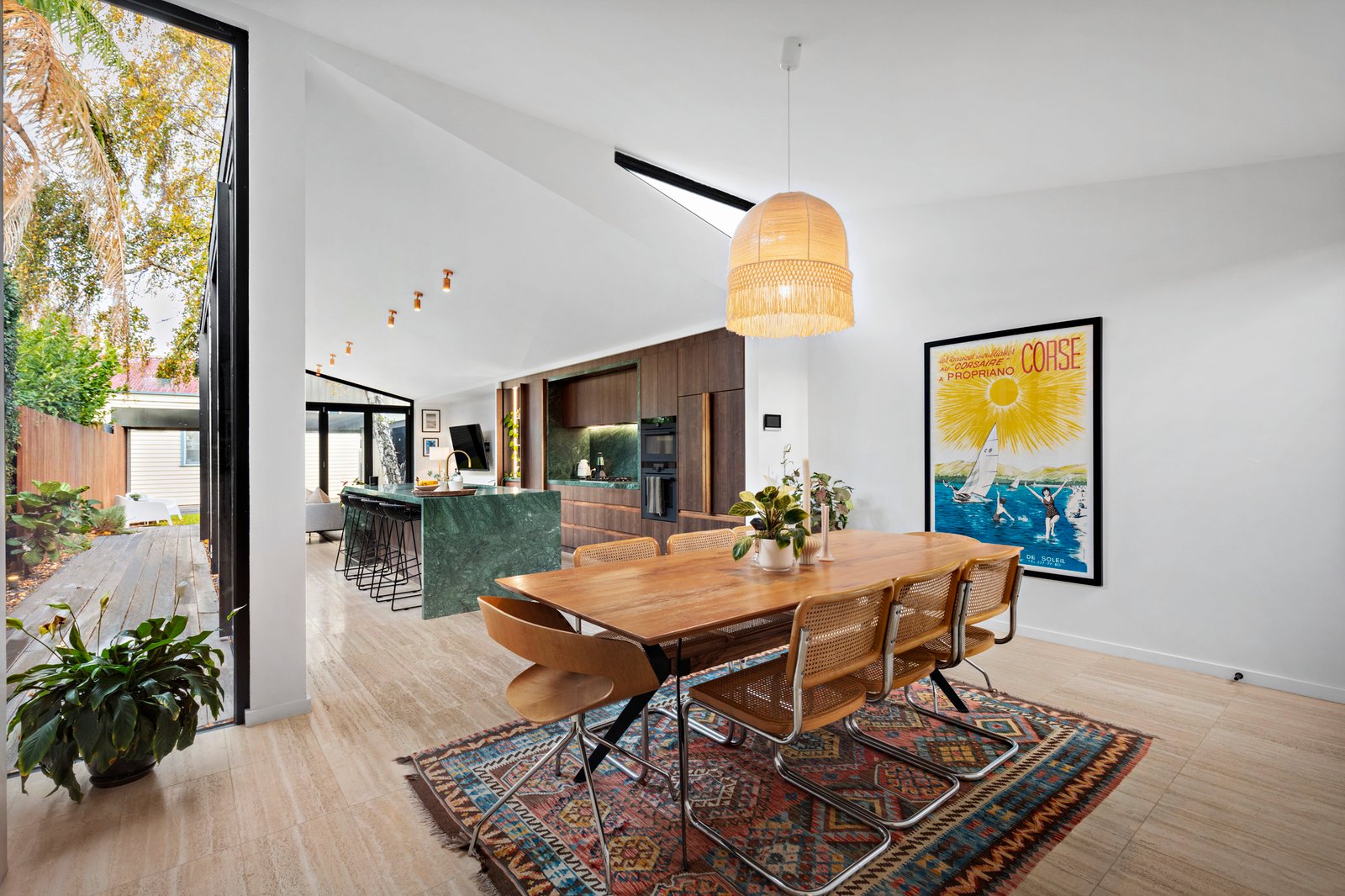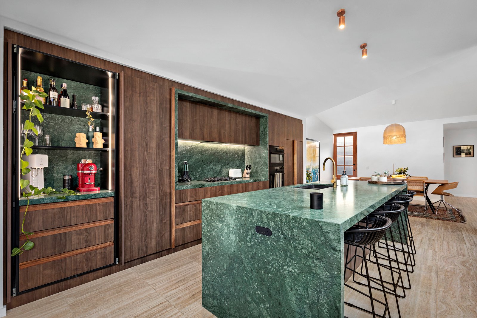 The secure garden entry affords incredible privacy and a true sense of seclusion leading to open-plan living and dining areas, enhanced by soaring vaulted ceilings and walls of glass-stacked doors, seamlessly merging with the lush rear garden. The showpiece kitchen mirrors the lush surroundings with its striking Verde marble benchtops, equipped with top-of-the-line Smeg and AEG appliances alongside an integrated French-door Fisher & Paykel fridge/freezer.