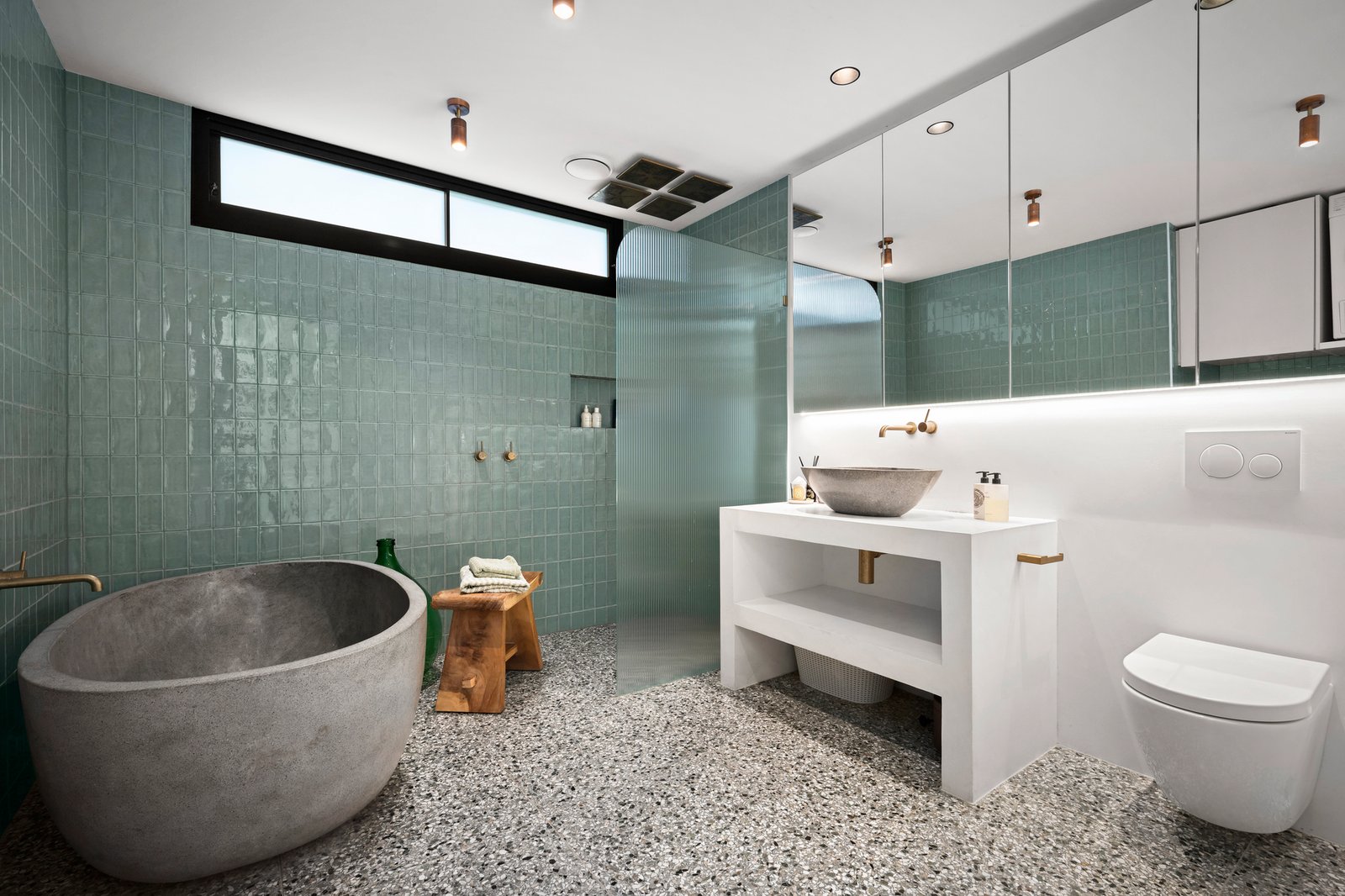 Heated travertine flooring flows effortlessly throughout the home, creating a cohesive connection between the living spaces. The bedroom wing comprises three bedrooms, all with built-in robe storage and leafy green outlooks, including the main suite, which opens out to a tranquil garden terrace under a natural canopy and water feature. The two bathrooms, each adorned with micro tiles and terrazzo tiling, add a touch of luxury, complemented by a freestanding stone bath.