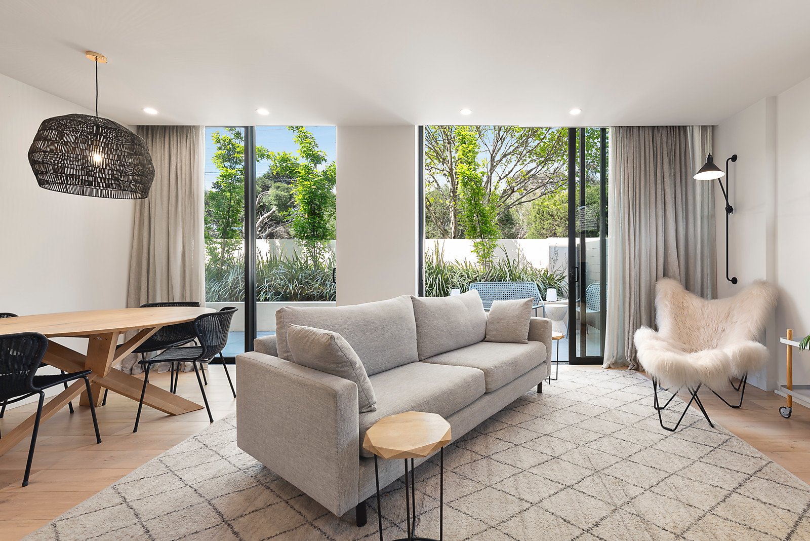 Designed to accentuate natural light, the open plan living and dining zone, fitted with engineered oak floors and linen curtains, encompasses an ultra stylish gourmet kitchen appointed with a suite of Miele appliances including integrated fridge and dishwasher, convection oven, wall oven and gas cooktop, superbly set against vast stone benches. Living seamlessly extends out to a sun drenched landscaped courtyard with northerly aspects, providing the perfect setting for entertaining. The main bedroom boasts built in robes, a sleek ensuite and opens out to a private side courtyard, complemented by a second bedroom with robes which opens onto the main courtyard and enjoys use of a designer bathroom.