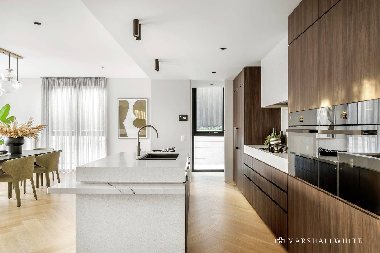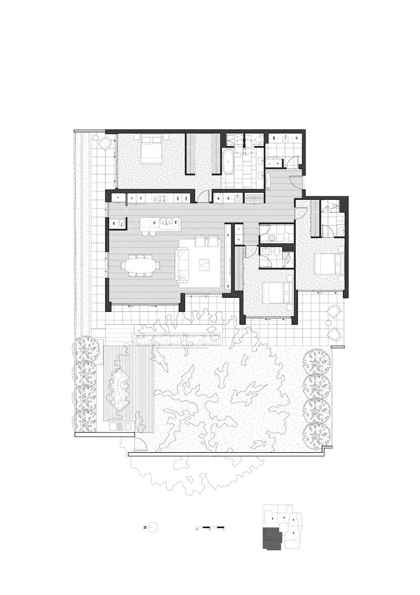 This sleek, cutting-edge ground floor apartment designed by Adele Bates with, sets a benchmark which is synonymous with contemporary elegance, luxury and sophistication. The stunning interior features 185sqm of living space with Natural Oak Herringbone Engineered timber flooring and floor-to-ceiling glass. Delivering an abundance of natural light internally to three bedrooms all with ensuites, the sumptuous main has a large dressing room; plus a powder room and separate laundry. A generous open-plan living and dining room includes a state-of-the-art kitchen equipped with honed terrazzo and natural stone bench-tops and prestige V-Zug ovens, gas cooktop, a Liebherr integrated fridge/freezer and cocktail bar with Liebherr Vinidor Wine Storage. Flowing to a wide deck with gas mains barbeque overlooking lush, landscaped gardens spanning over 200sqm, designed by the renowned Landscape Designer, Jack Merlo; providing loads of room for alfresco dining and entertaining under a magnificent mature tree providing gentle shading.