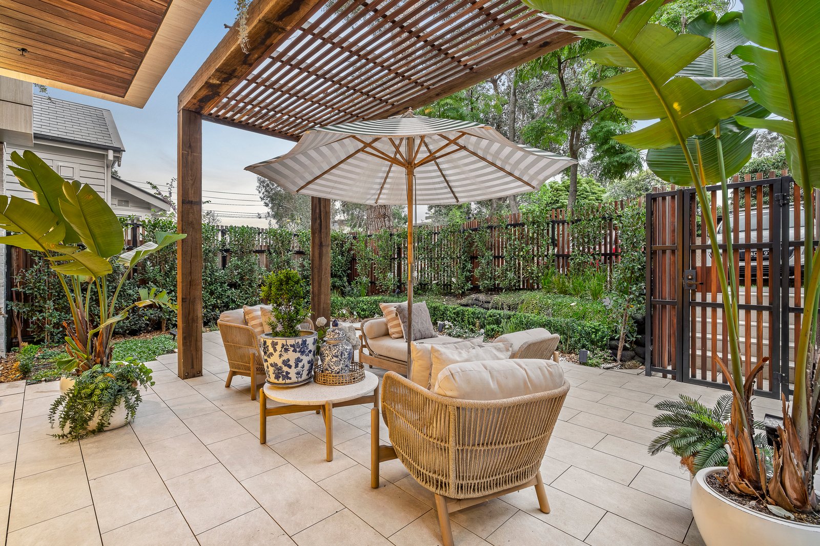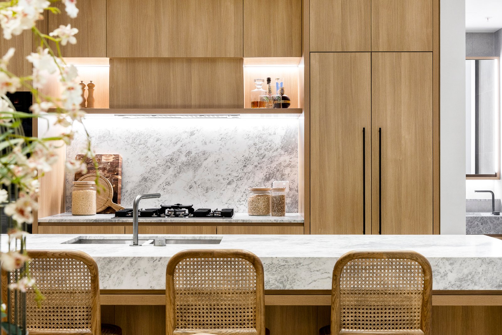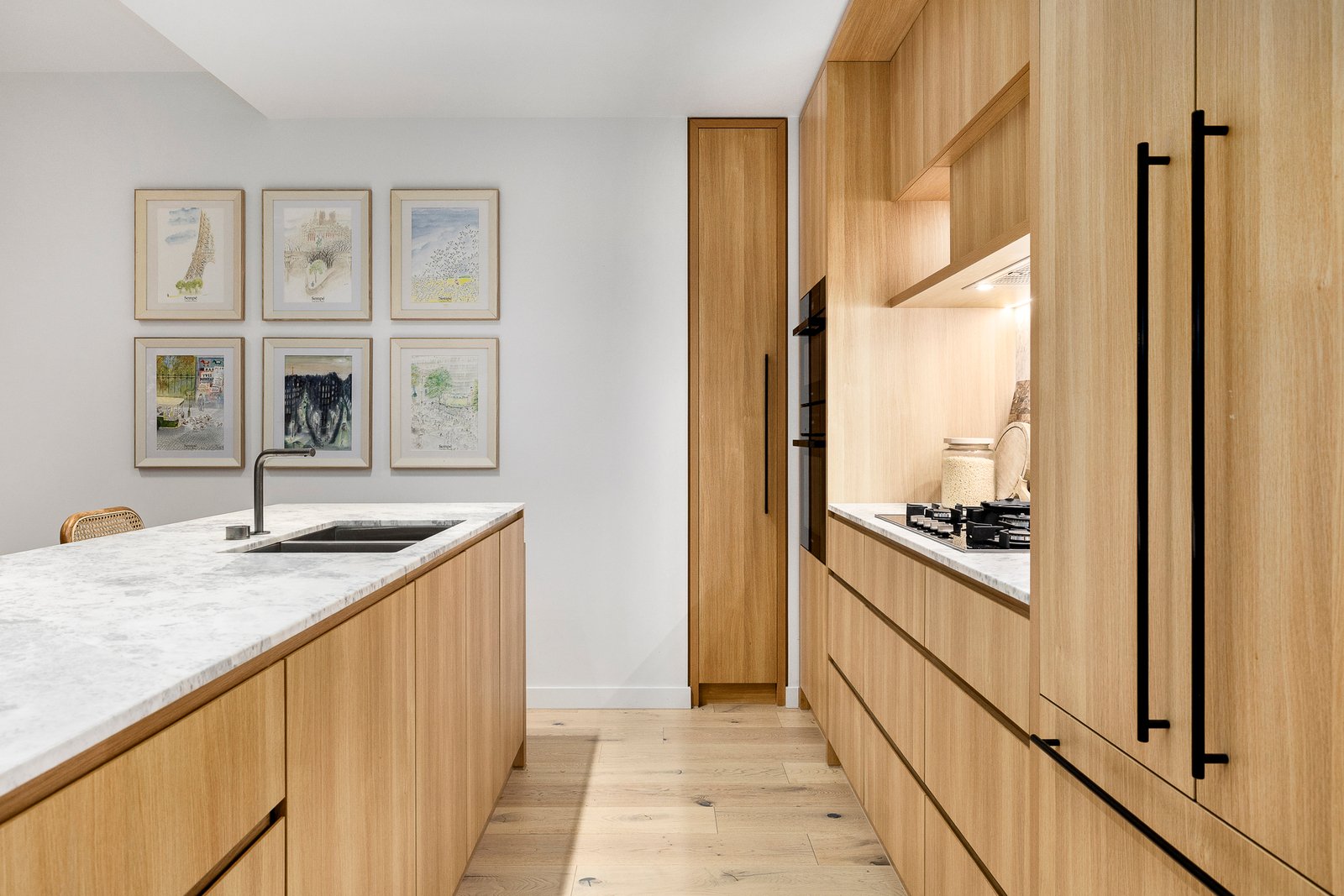 Designed by Fender Katsalidis architects, the spacious, intuitive floorplan celebrates free-flowing open plan indoor/outdoor living and entertaining complemented by a harmoniously curated materials palette of engineered oak, lustrous marble, and bespoke timber joinery. Professionally treated to ensure durability, an over-sized marble island/breakfast bar defines the culinary space, equipped with a Miele convection and speed ovens, gas cooktop, integrated dishwasher and an integrated Fisher & Paykel fridge/freezer. Zoned for effortless family living, the main bedroom has garden outlooks, a fitted walk-in robe and a five-star ensuite with a freestanding bath and walk in shower.
