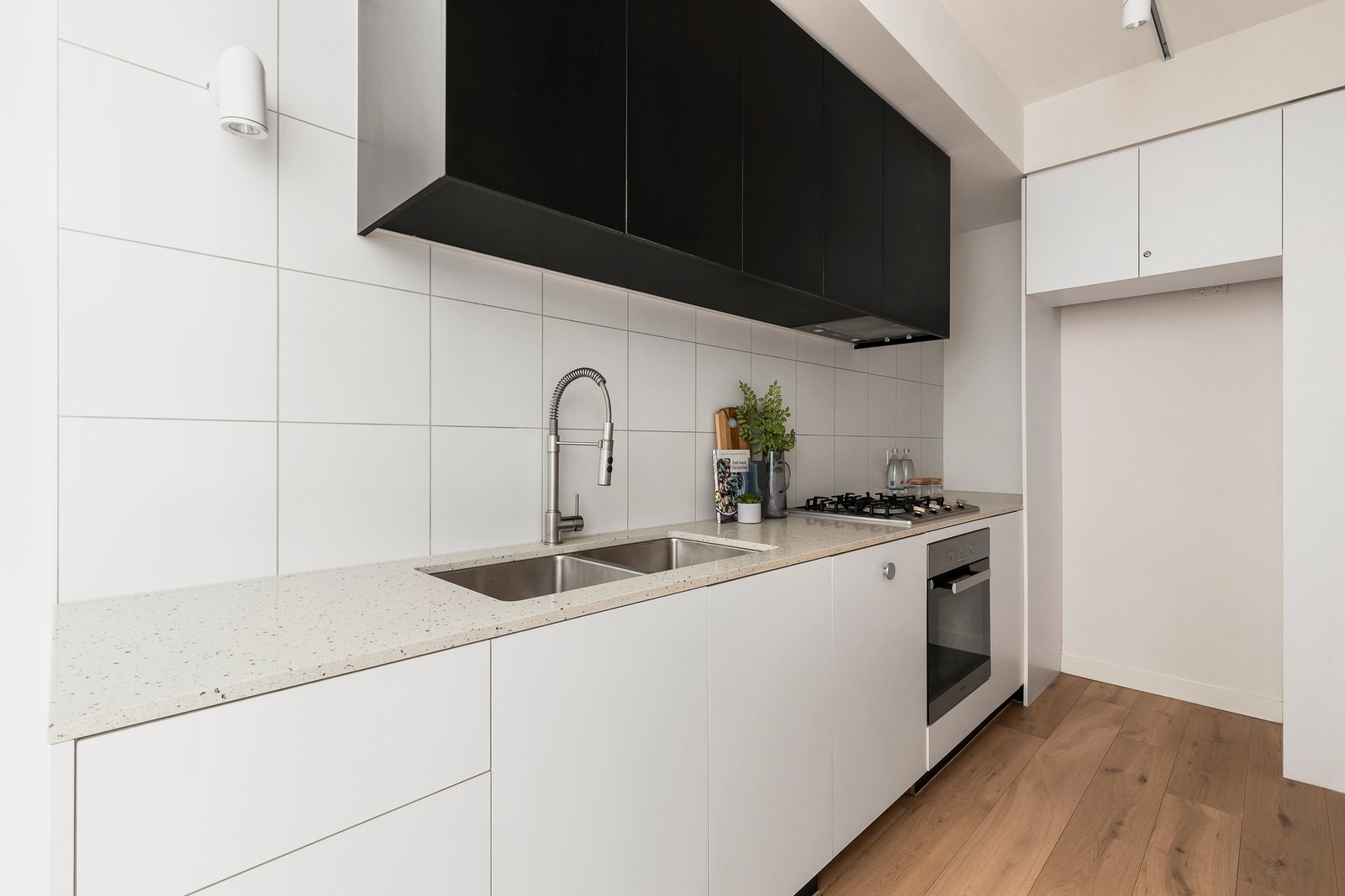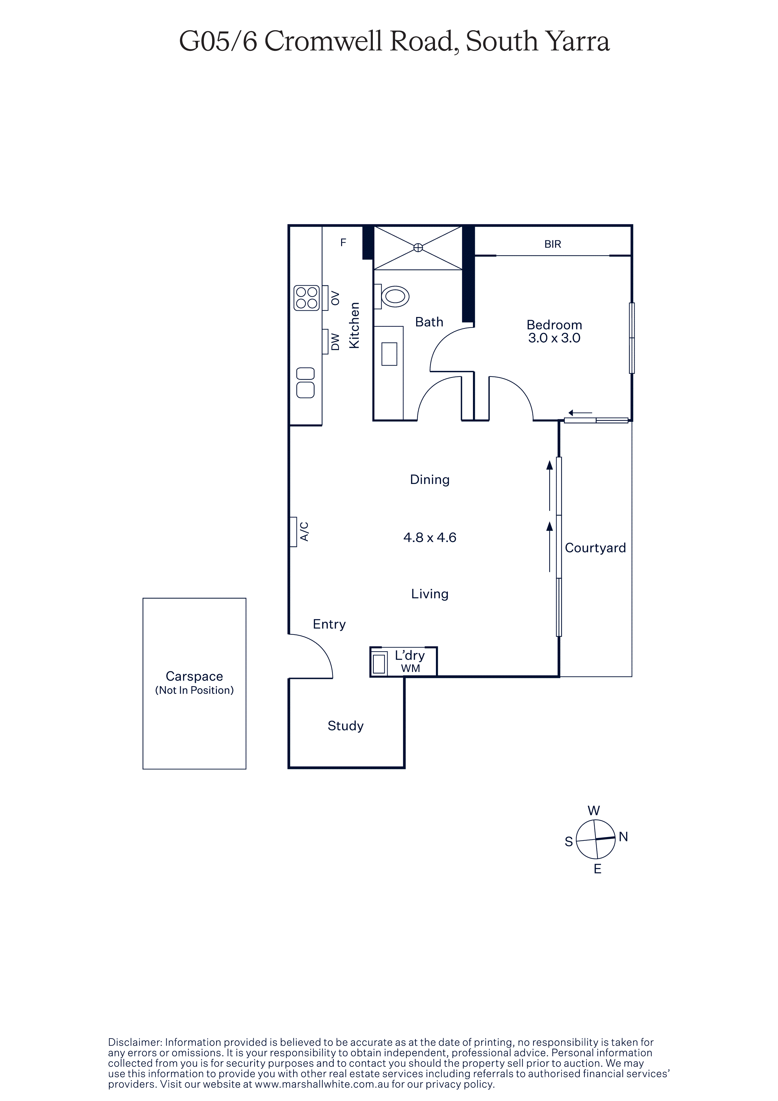 Capturing wonderful northern light, a spacious dining / living room is underpinned by a stone-topped kitchen that is partly tucked away and appointed with premium Miele appliances. All with engineered Oak under foot, the home flows through large light-letting glass sliding doors to the courtyard, whilst further highlights include a wall of mirrored robes in the bedroom, a European laundry, split system heating and air conditioning as well as secure video entry, basement parking and storage.