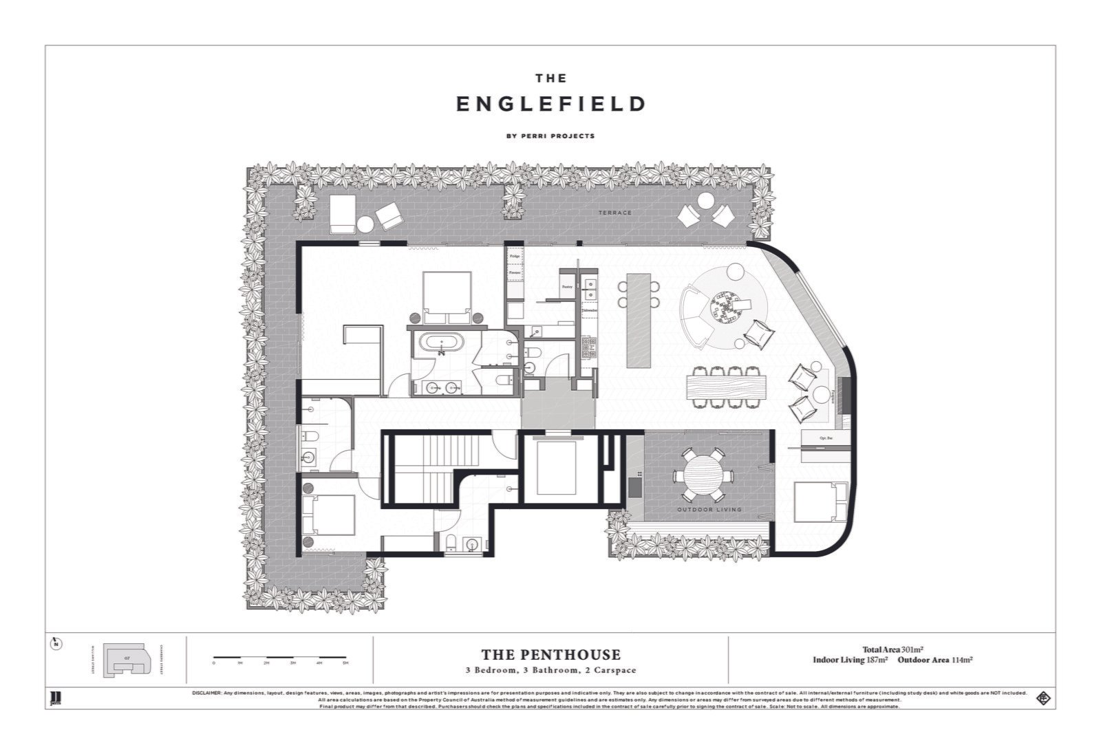 The brand-new Englefield Penthouse occupying a floorplate of over 300sqm (approx) is a truly unique offering in the South Yarra market. Occupying the entire top floor, the penthouse offers grand entertaining spaces and a truly enviable 50sqm (approx) main suite. This Woods Bagot masterpiece sits atop just six other bespoke residences in the building, surrounded by wrap around terraces with spectacular views of South Yarra and beyond. Here luxury is taken to a new level with three meter ceilings throughout, multiple dining and entertaining options, an opulently appointed living, three bedrooms with spectacular main suite boasting northern views to the Como precinct, three bathrooms, an entertainer's kitchen and the highest quality craftsmanship in every detail utilising natural materials. The basement garaging offers the option of a 3rd car park and additional fully appointed and temperature regulated cellar/wine room as an option for the purchaser. The intelligent and discreet services of The Englefield create a perfectly tailored environment where all elements integrate seamlessly. Intuitively designed, smart home technology allows residents to control light, temperature and shading to create the ideal arrival experience.
