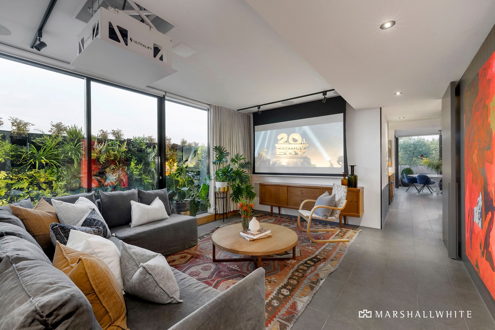 Direct lift access introduces a wide entrance hall flowing through to a generous sitting/media room bathed in northern light and opening to a surrounding balcony with 35 metres of lush vertical gardens. A drop-down cinema screen, projector and surround sound make this the ideal home theatre. An expansive open plan living and dining room features a gas fire, bespoke joinery and a sublime gourmet kitchen with an American oak built in table/bench, Miele appliances and a butler's pantry. Two sets of bi-fold doors open the living spaces to a private north-facing entertaining terrace. Commanding city views and opening to the balcony, the beautiful main bedroom is complete with a designer en suite, bath and walk in robe. There are two additional double bedrooms with robes, a nursery/4th bedroom or 2nd study with balcony, fabulous fully fitted home office, a stylish bathroom and powder-room.