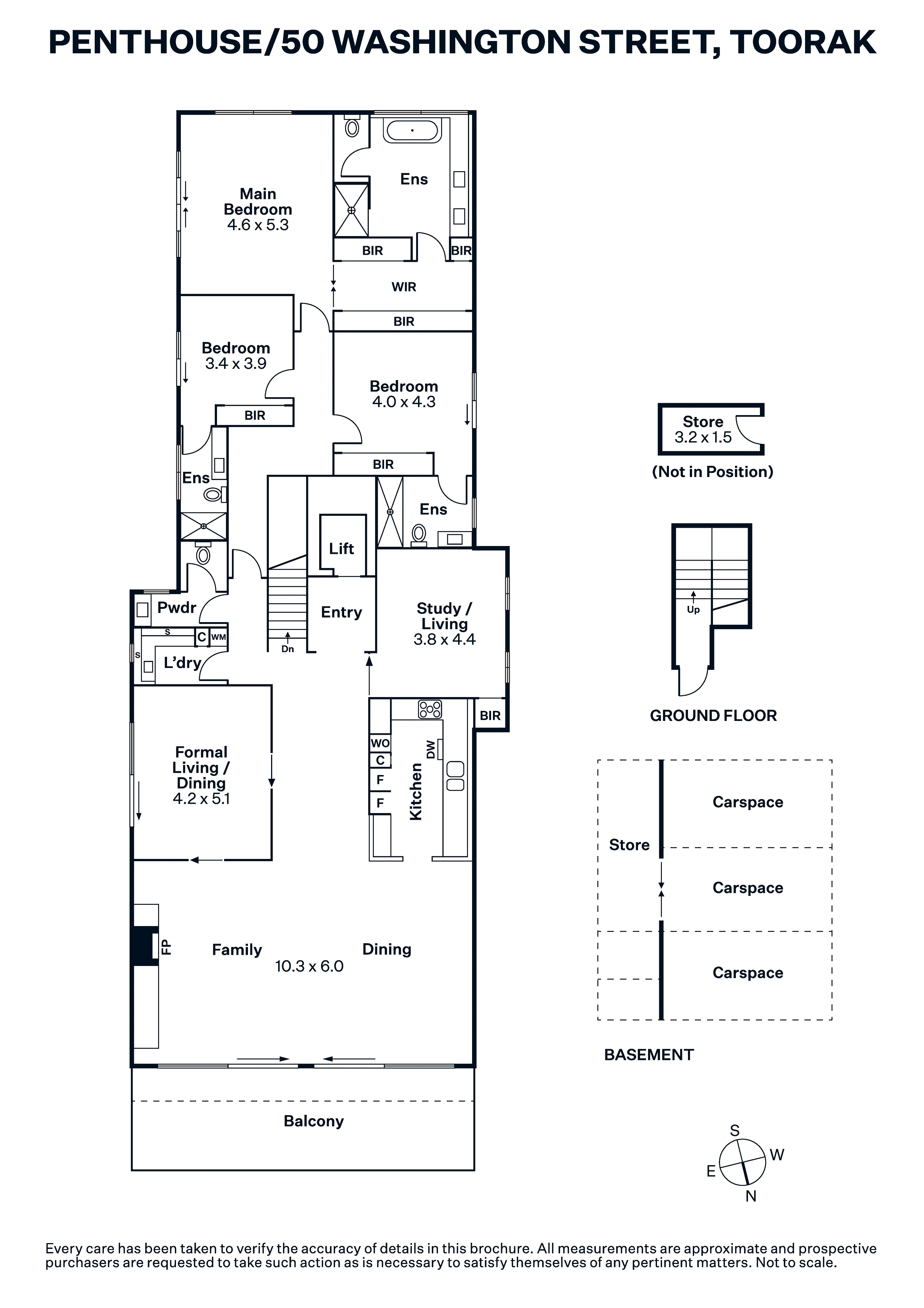Additional features include video intercom, security alarm, ducted air conditioning, gas log fireplace, ceiling fans in bedrooms, a wall heater in the main suite, fully tiled bathrooms, extensive storage, lift access, and three secure basement car spaces plus two storage rooms.