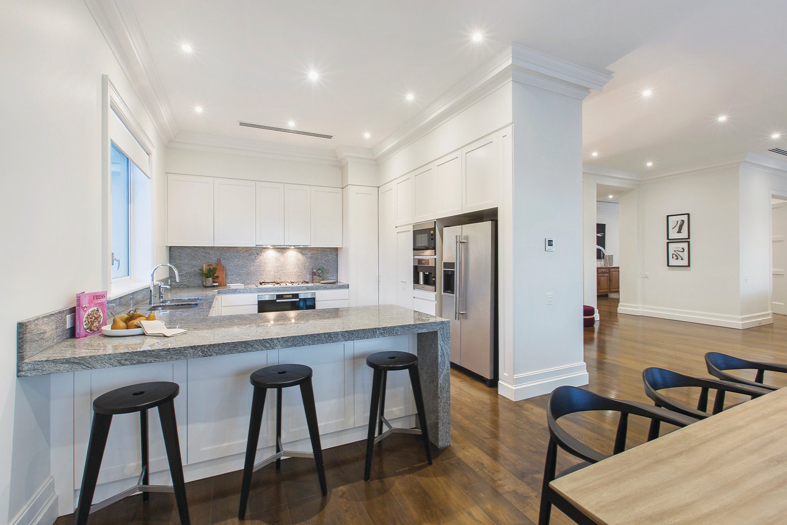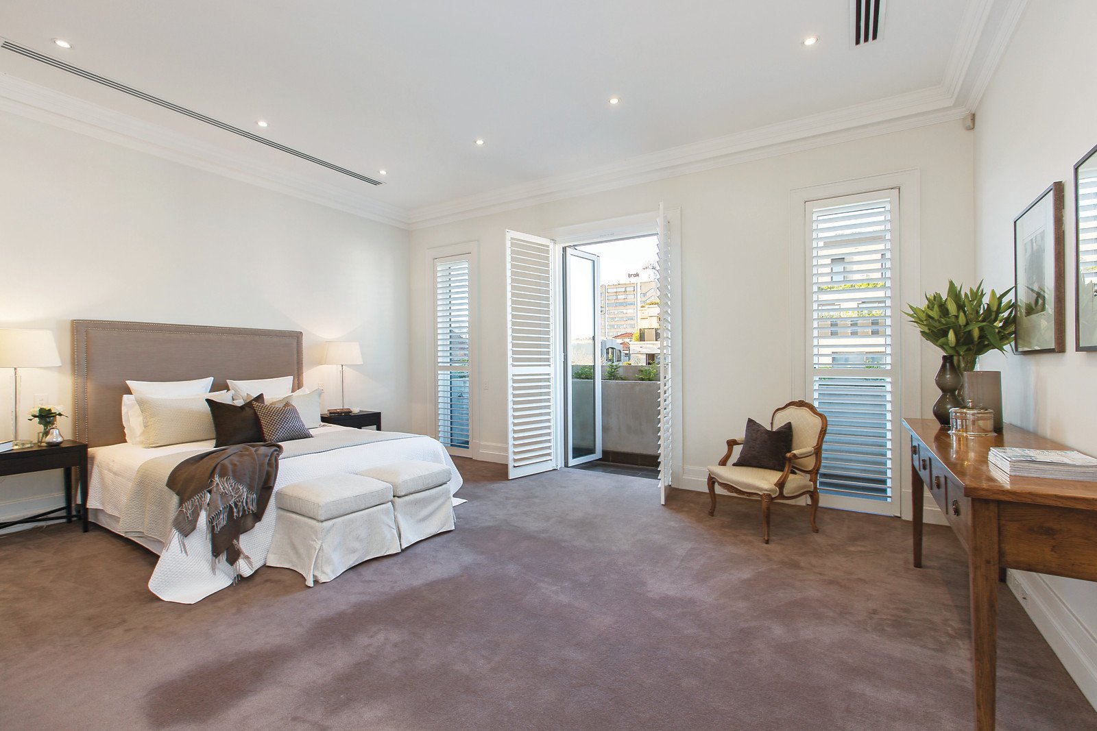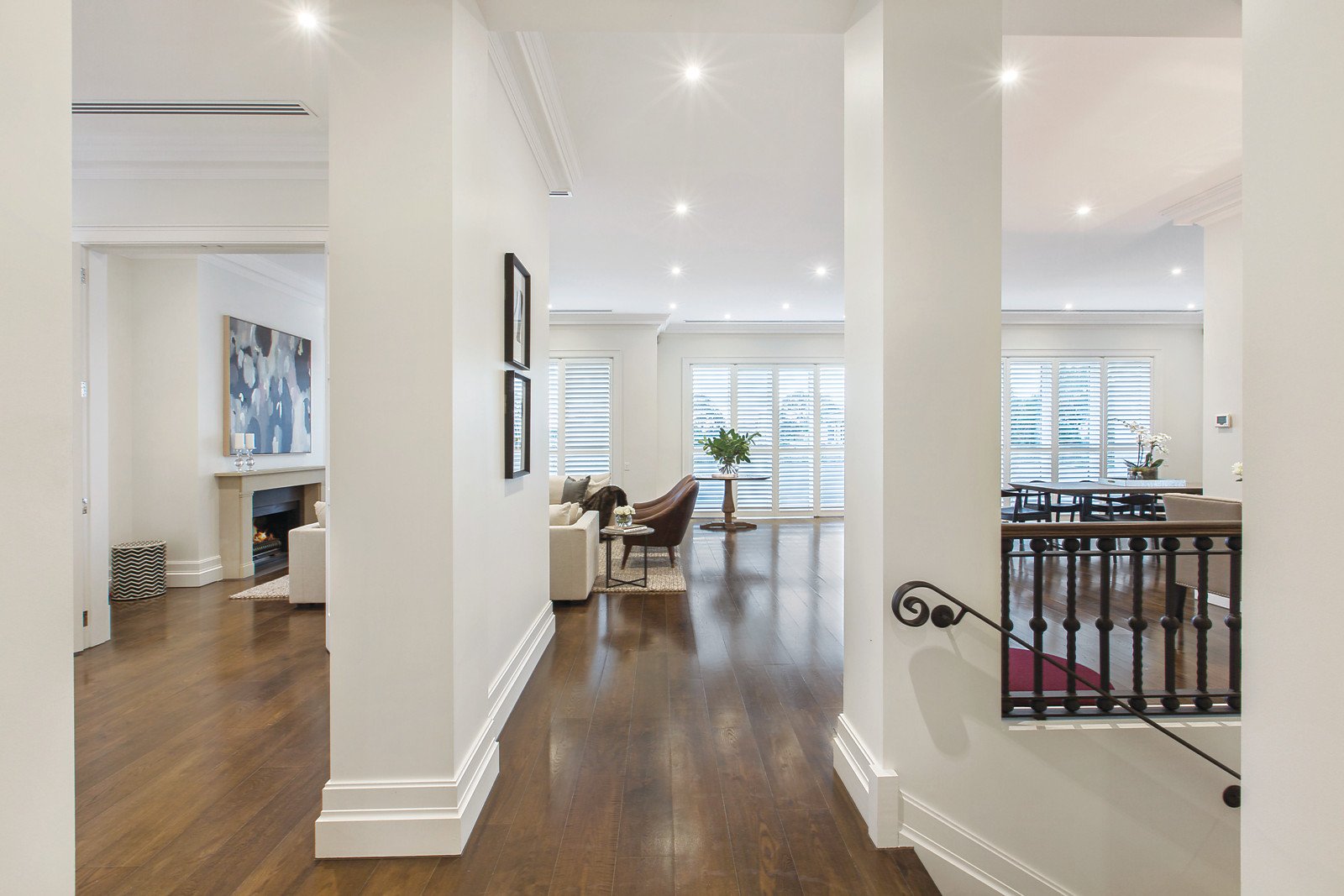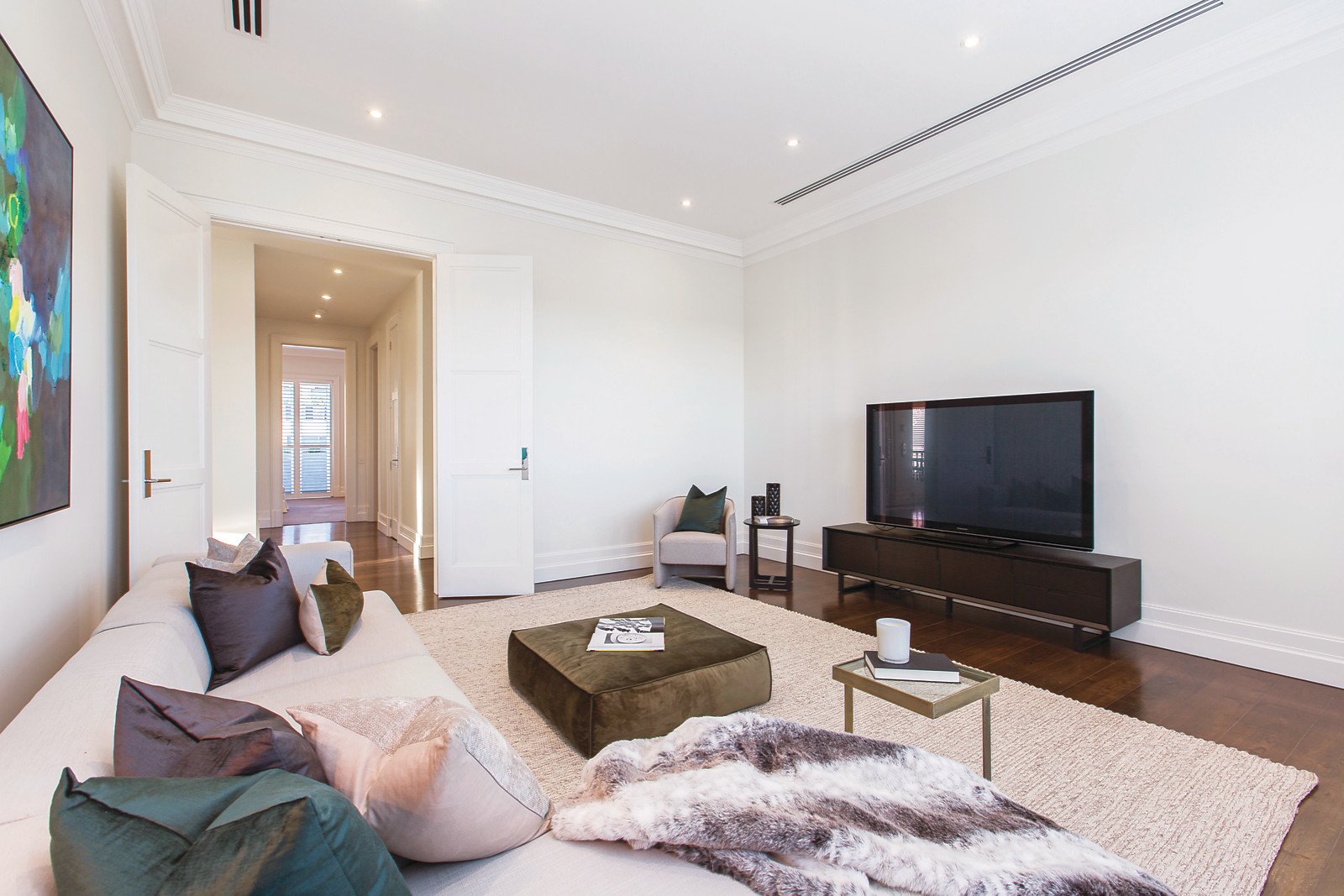 Direct lift entry reveals 3.3 metre ceilings and dark American oak floors through the gallery hall, media or sitting room, formal dining room and exceptionally generous living and dining room with a gas fireplace. The living areas open through bi-fold doors to a broad west-facing private terrace offering wonderful views. State of the art, the gourmet kitchen is appointed with Bianca Crystal stone benches and premium Miele appliances including a coffee maker. Two beautifully proportioned bedrooms with designer en-suites and built in robes complement an opulent main bedroom with dressing room, stunning en-suite and access to the terrace.